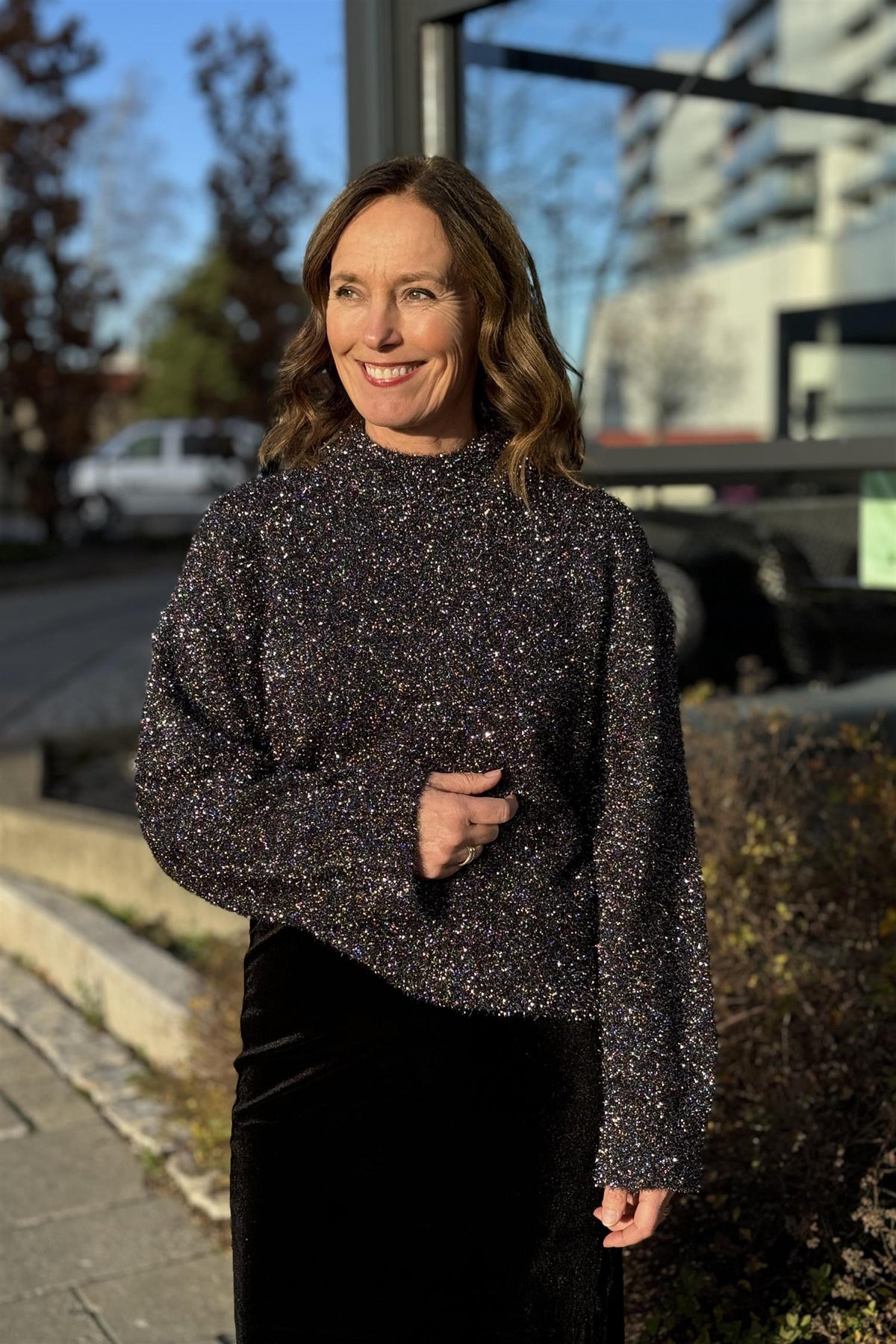 Lekker glittergenser i sort som pynter opp ett hvert antrekk. Genseren har litt vidde, så du kan vurdere å gå ned en str, dersom du ikke trenger lengden.