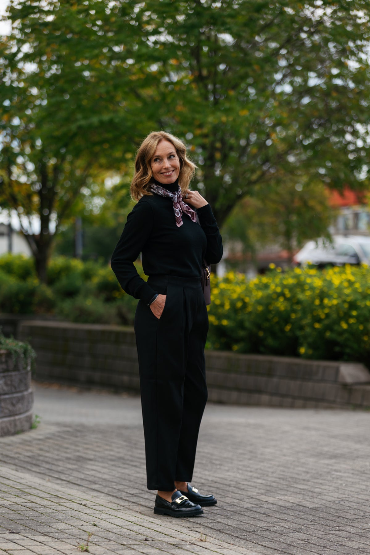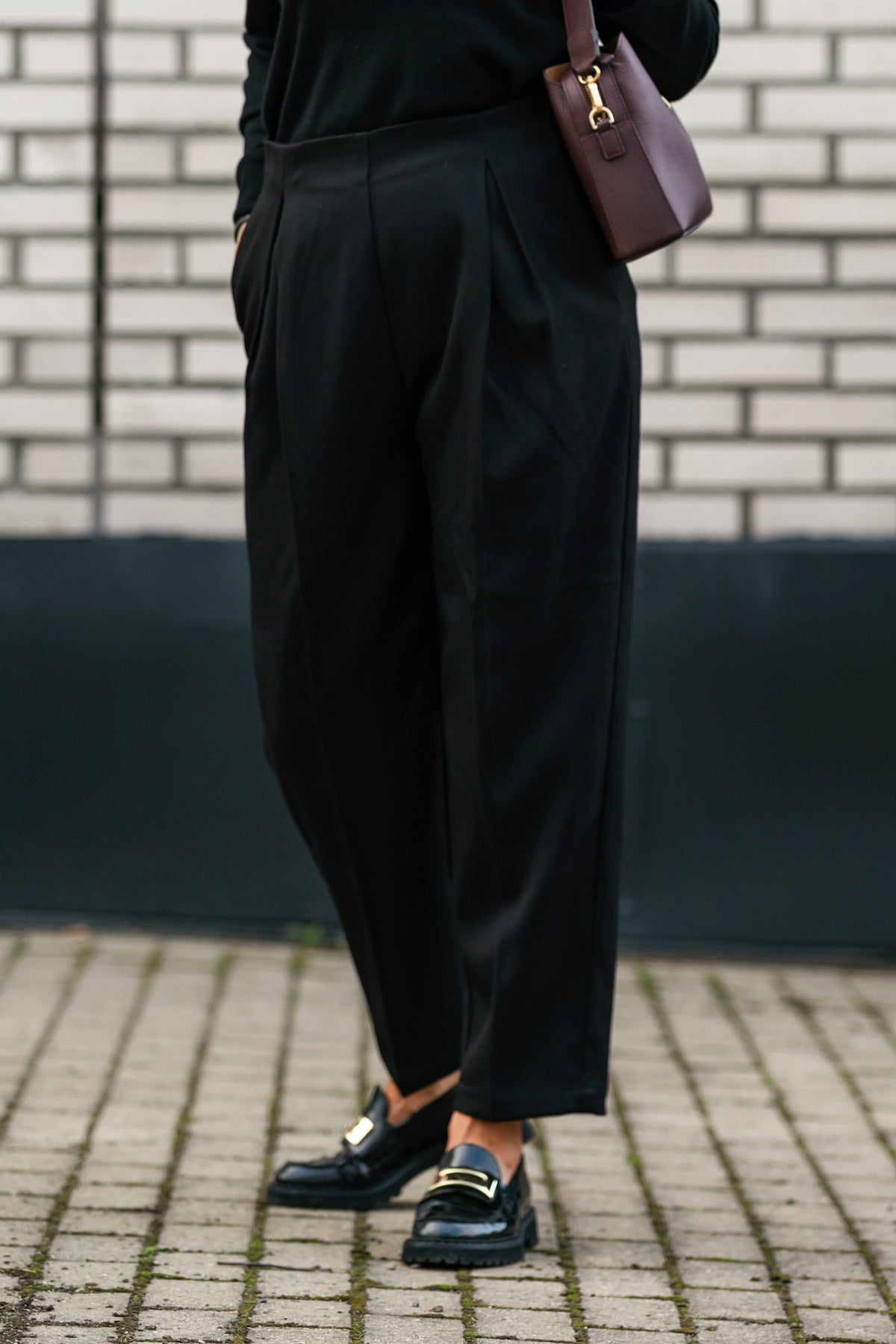 Olava pant er en bestselger hos One and Other. Nå er trenden legg i front, og denne dressbuksen har et fint fall, som gjøre at den får det riktige uttrykket. Buksen er uten linning, med glidelås i siden. Stikklomer foran og helt uten lommer bak. Stoffet er litt kraftig, og kler uttrykket til buksen. Ankellengde. Buksen skal få lov til å være litt loose, med vidde i lår, og at den skrår inn nederst. Vår modell er 172 høy, str 38 og har på seg str 38. (da er den løs i livet, og får "henge")