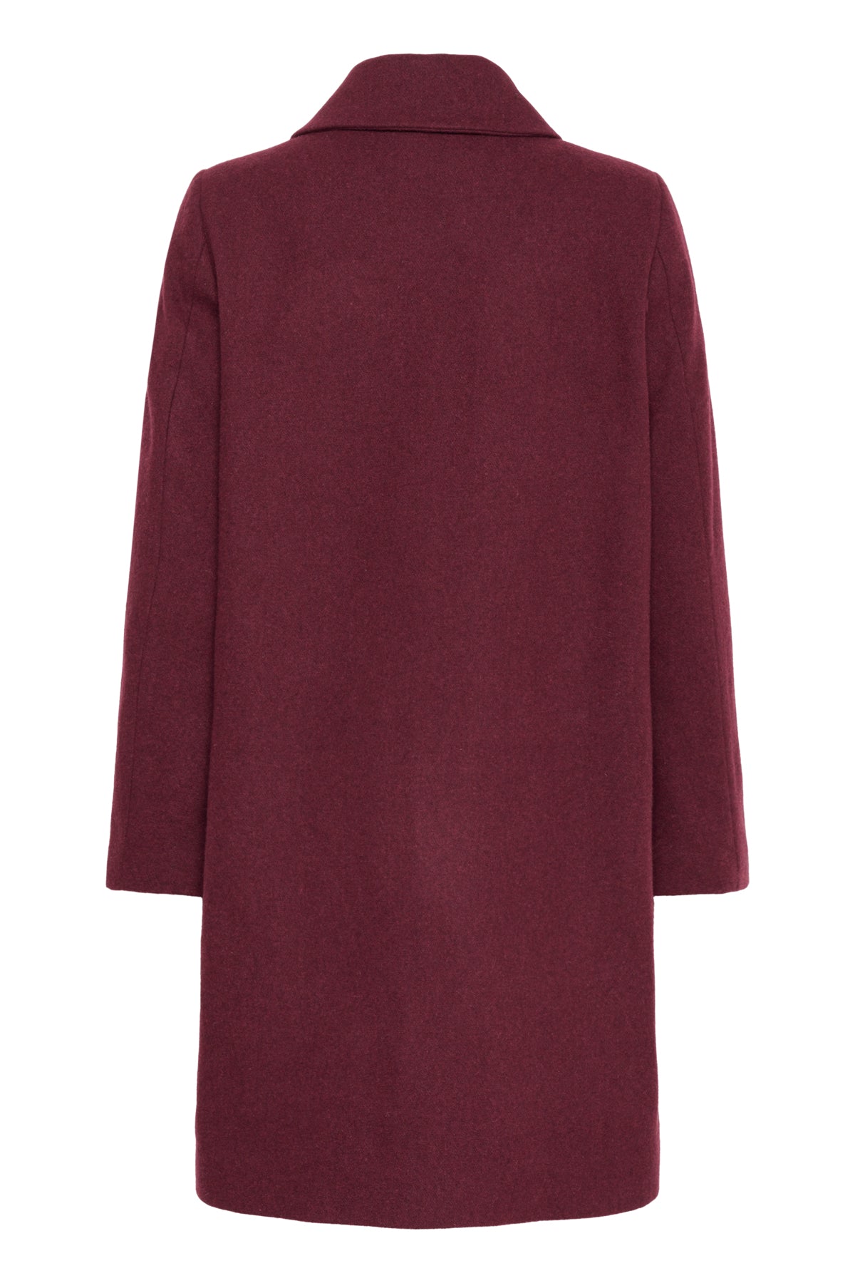 Kamillas fra Part Two er en nydelig kåpe, med snitt som en smal frakk. Her i høstens trendy bordeauxfarge- Litt retro, med krage og enkel knepping. Sitter fint over bryst, og skrår litt ut - klassisk. Stikklommer i siden og nett lengde til over kne.