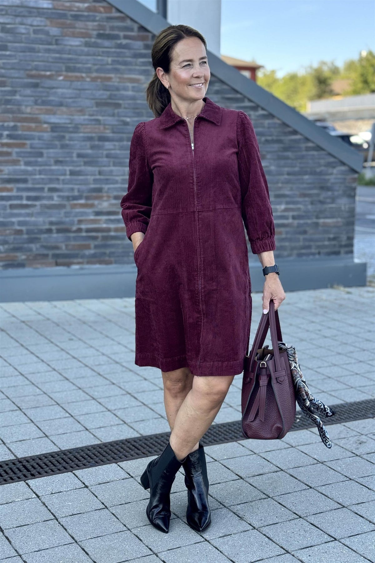 Eyvors er en litt lengere utgave av den populære Eyvor kjolen fra Part Two. Fint snitt som smalner inn i livet, og skjørt som faller fint. Kjolen har krage, glidelås helt ned, stikklommer i siden, og lengden rett over kne. Den er vanlig til litt god i str. Noen velger å gå ned en str.