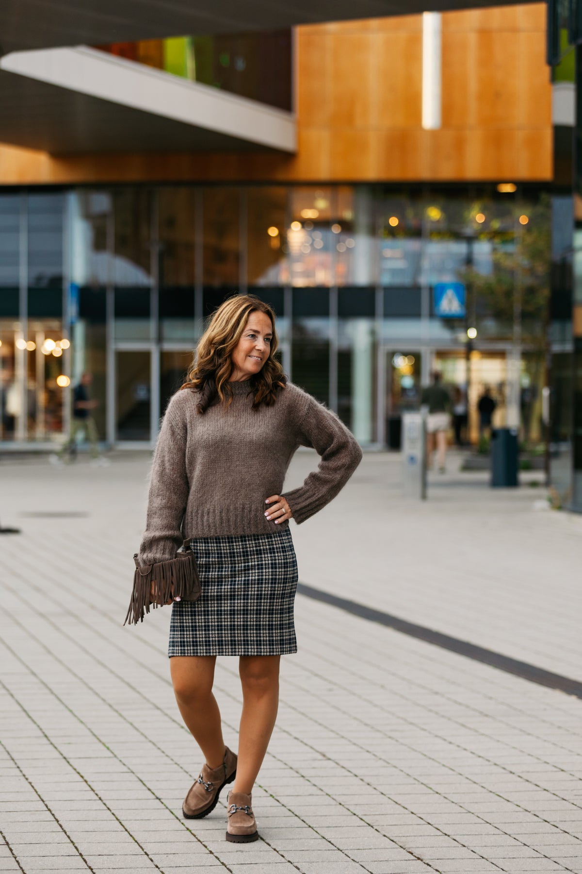 Corinne skjørt fra Part Two har fin fasong, klassisk og lett å bruke. Mykt materiale som er godt å ha på. Strikklinning som er glatt, skjørtet kan enkelt trekkes på. Rutemønster i sort og beigetoner, enkelt å style sammen med høstens antrekk. Er vanlig i størrelsen. Livvidde i str. M er 76 cm, lengden er 48 cm. Inneholder 68% polyester, 29% viskose, 3% elastan. Vaskes på 30 grader finvask.