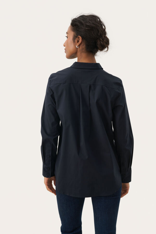 Nimini fra Part Two er den klassiske mørkeblå skjorten, laget i sprø bomull med en lett strukturert overflate. Den har lange ermer, spiss krage og avrundet kant – perfekt til både hverdagsbruk og mer formelle anledninger. Rett fasong og vanlig i størrelsen.