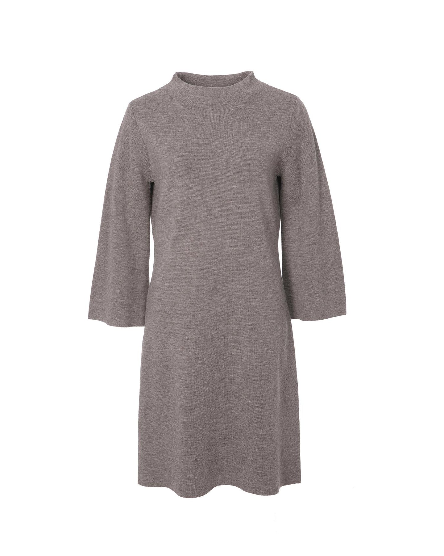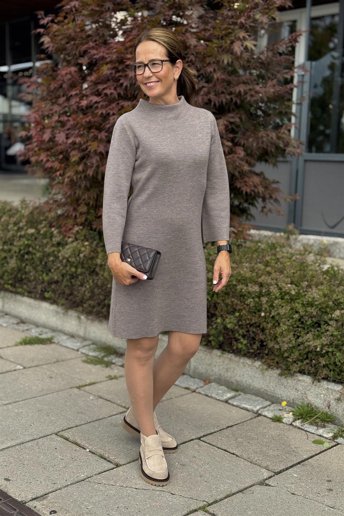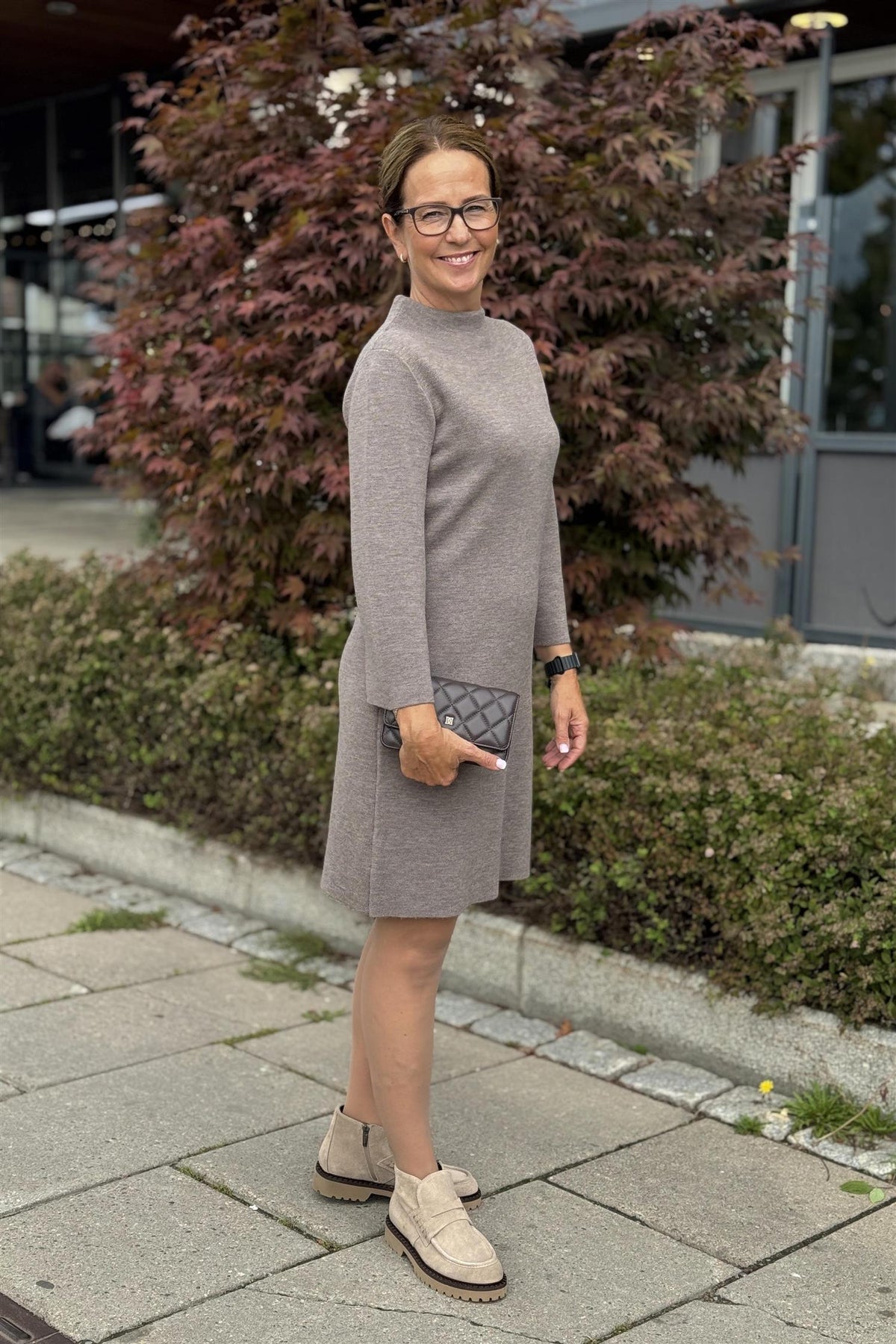 Superdeilig ullkjole i myk merinokvalitet. Denne ullkjolen har t-neck, trompet arm med 3/4 lengde, Er litt innsvingt i fasongen som faller fint og lengde til knærne. Er vanlig i str.