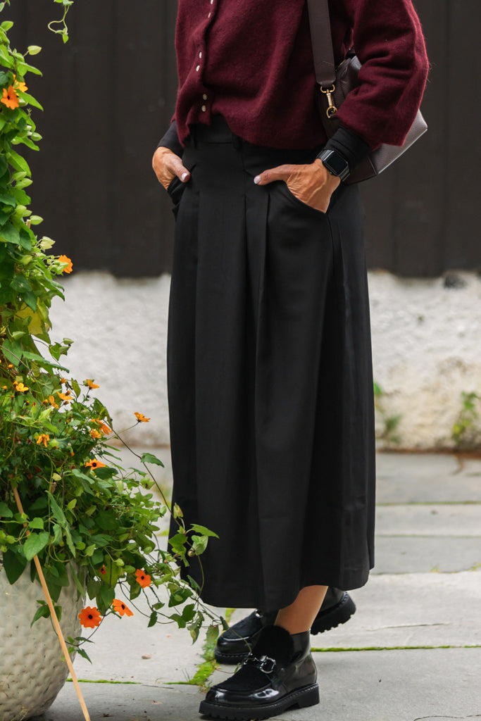 Vi fortsetter med de fine skjørtene fra Co`Couture! Luna er bygget på favoritten Anya pleat skirt.. Luna har oppdaterte detaljer med klafflommer som pynt i front - stikklommene kommer rett under disse. Skjørtet faller fint, med legg på rett sted bygger det ikke i bredden. Har midi lengde til ned på leggen. Er vanlig, til litt godt i størrelsen. Om du er mellom to størrelser så kan du vurdere å vippe ned.