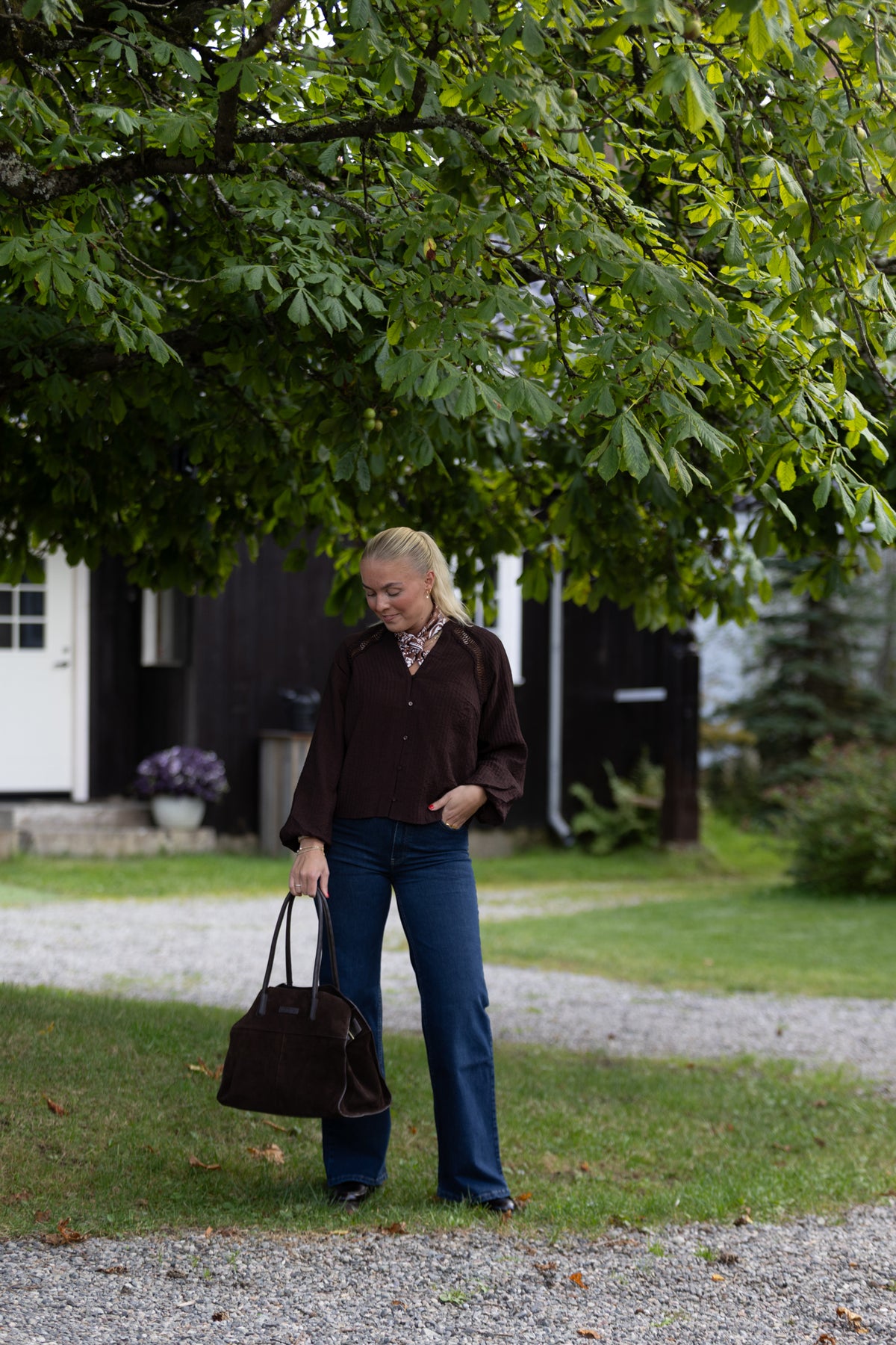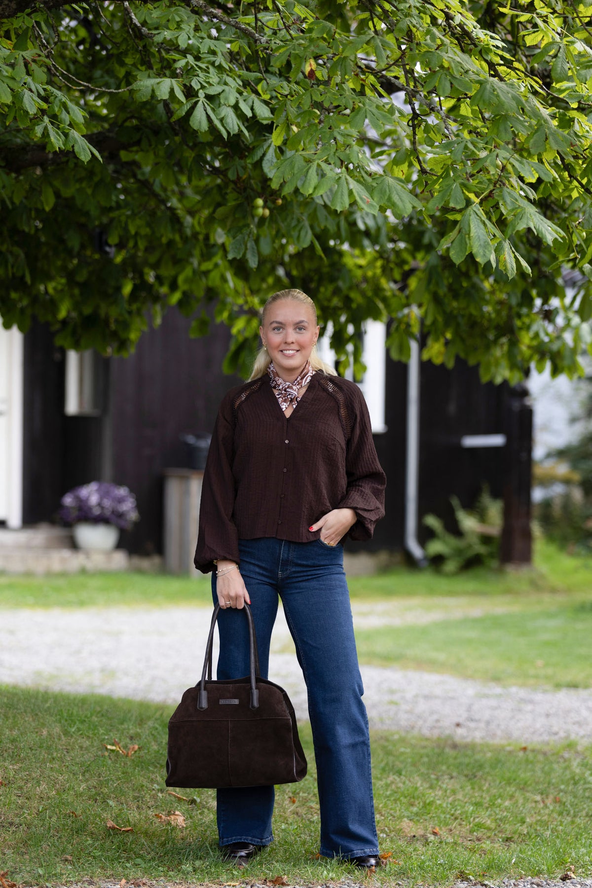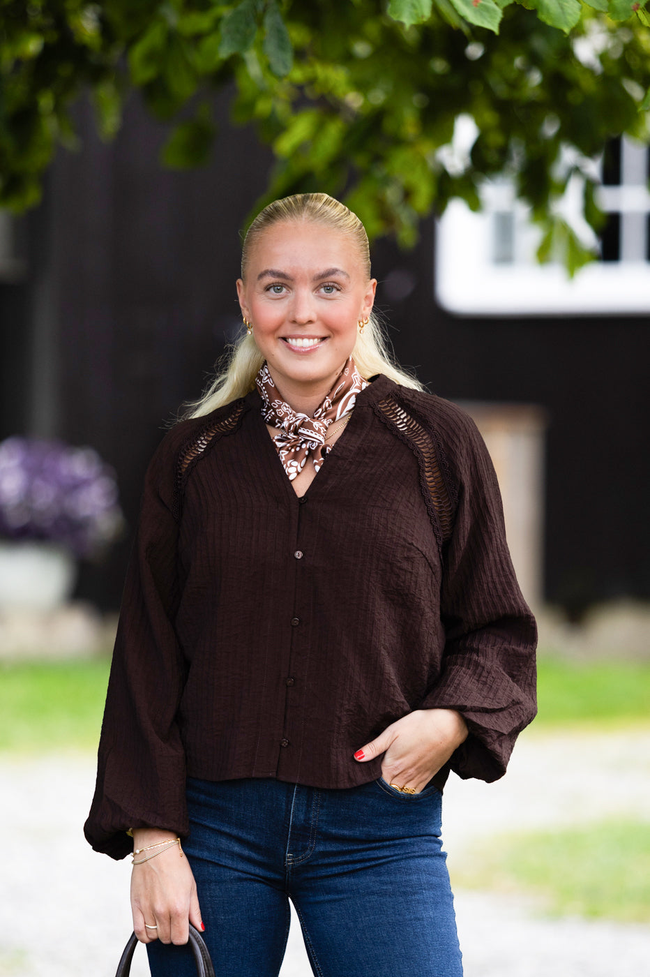 Shina bluse i vakker, dyp brunfarge. Blusen fra Co`Couture har v-utrigning og en gjennombrutt blonde i raglandsfelling.