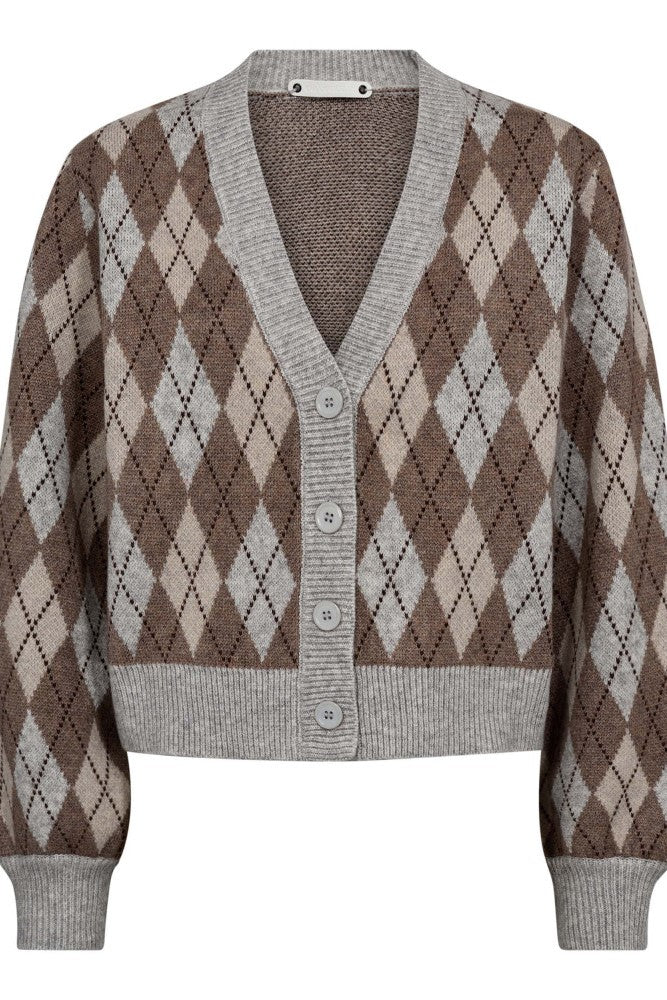 Row check er en trendy cardigan for høsten - i fint checkmønster. Jakken fra Co`Couture har v-utrigning og knepping i front. Perfekt å style til sesongens jordfarger.
