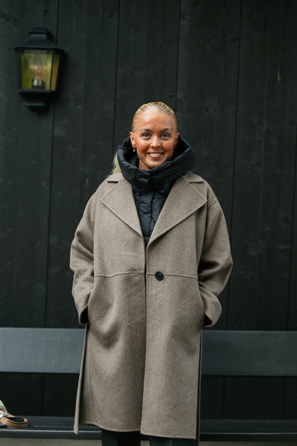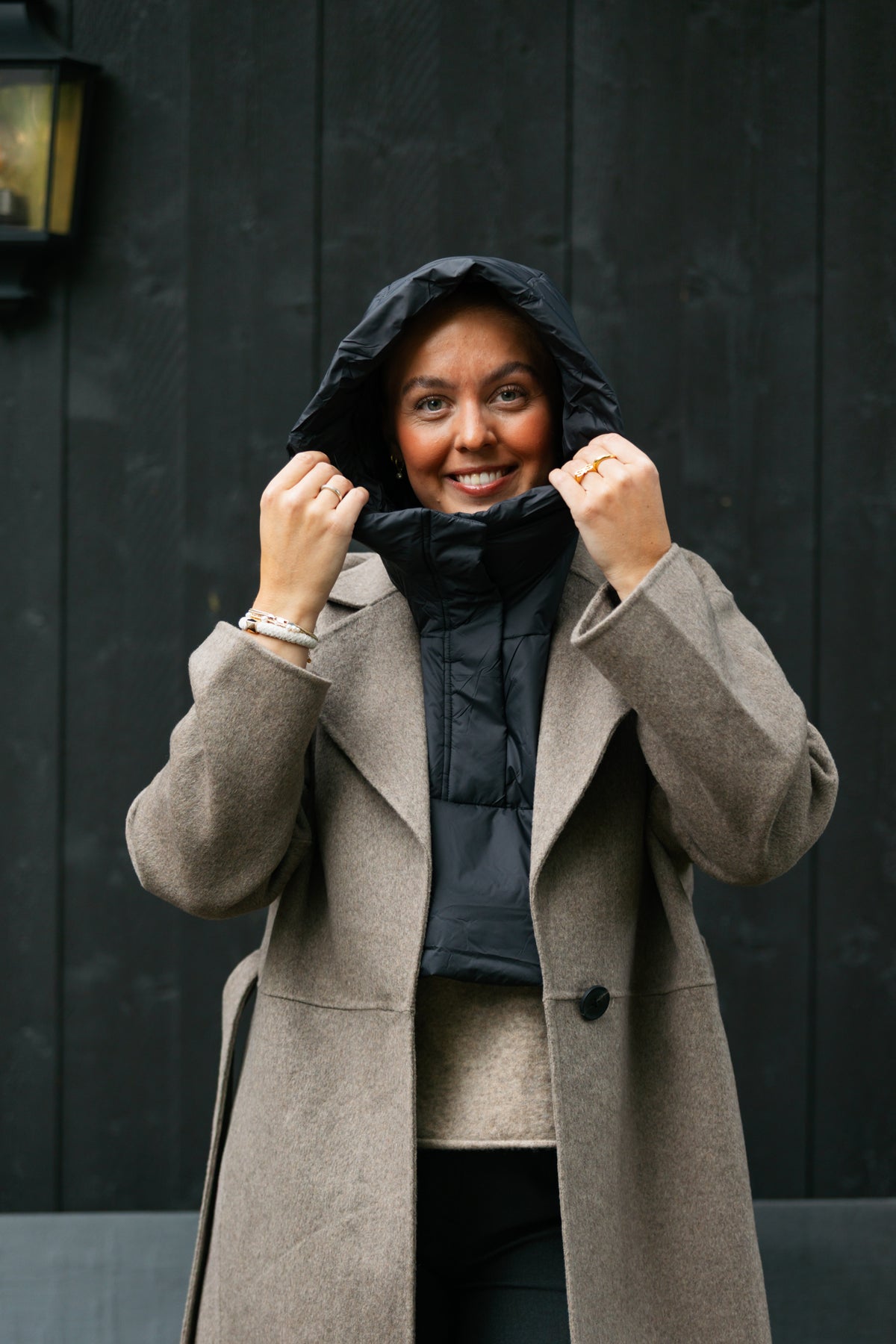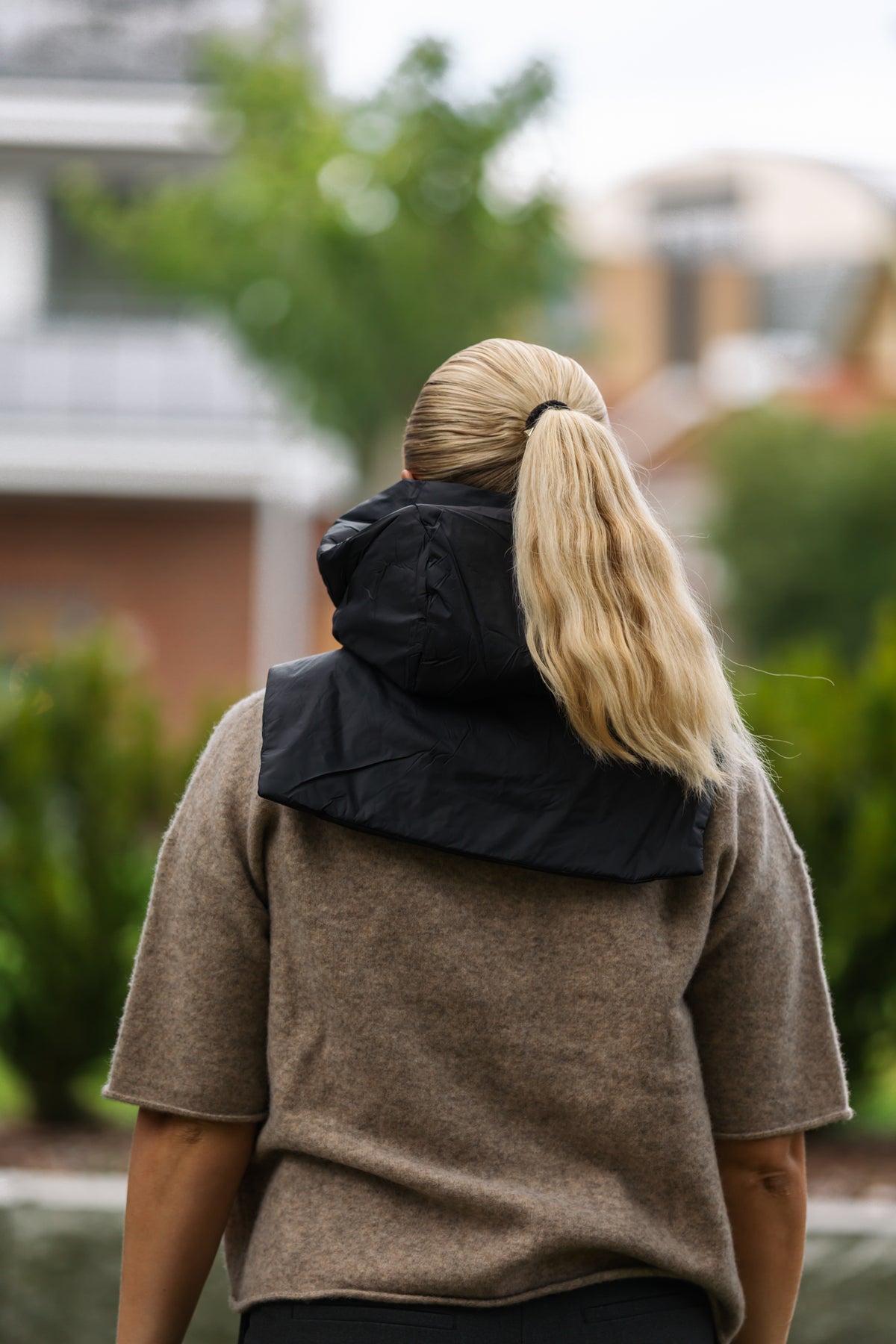 Lila hood er perfekt å bruke som hals under en jakke når det er kaldt om vinteren.