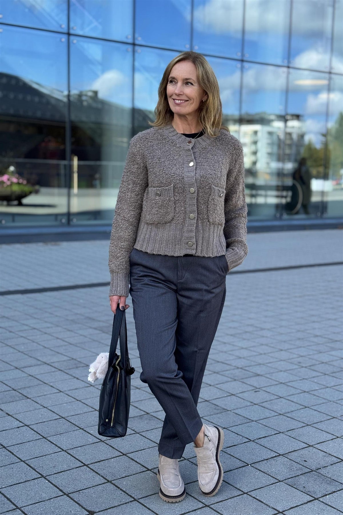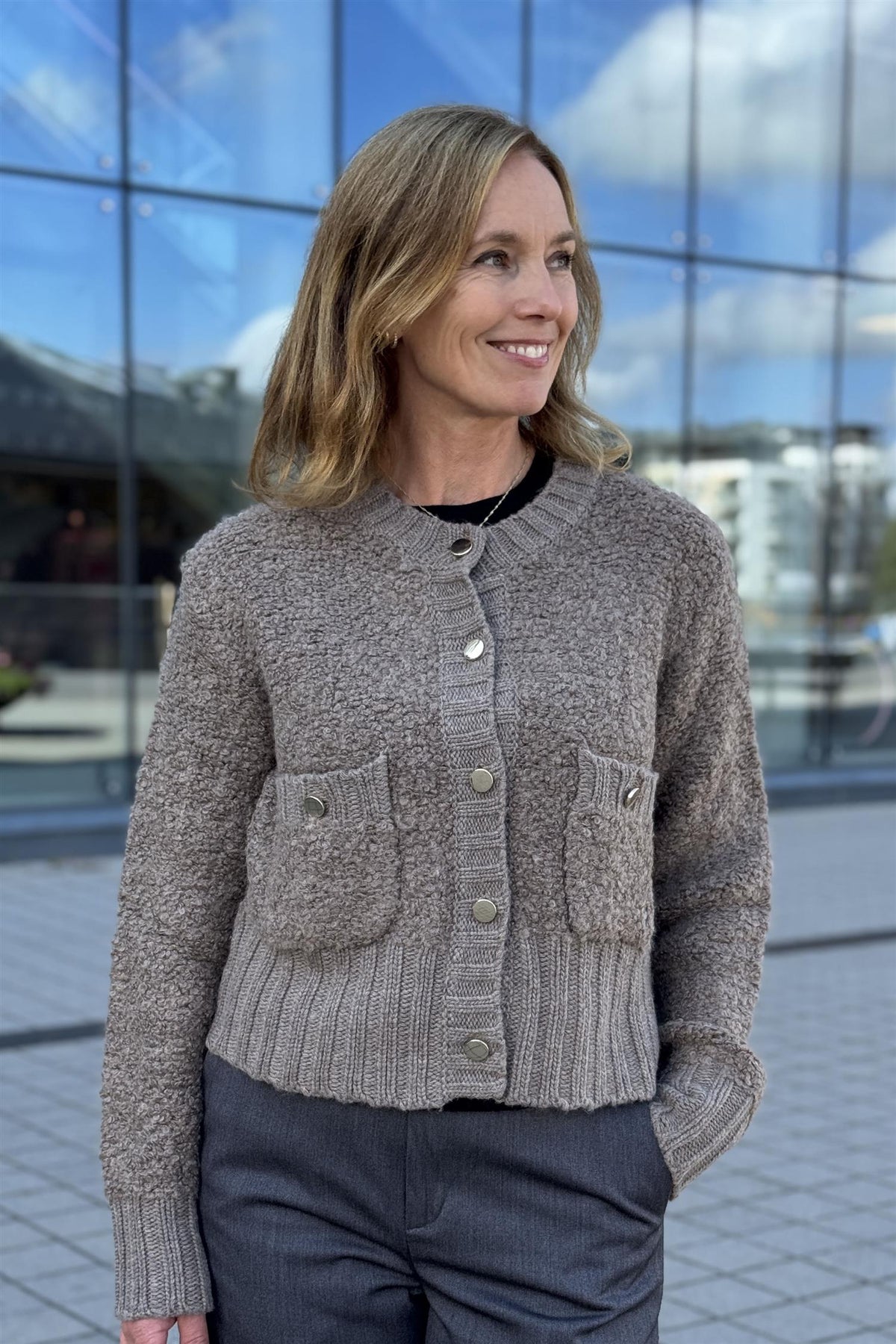 Guo er en superkul cardigan fra InWear. Strikket i boucle-strikk. Brede ribkanter, og lommer i front gir den det lille ekstra, samtidig som knappene i gullfarge pynter opp. Kort modell, er vanlig i størrelsen.