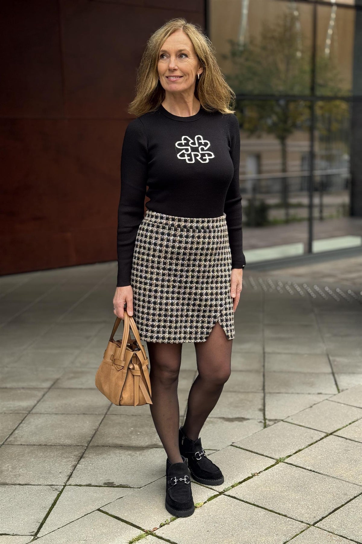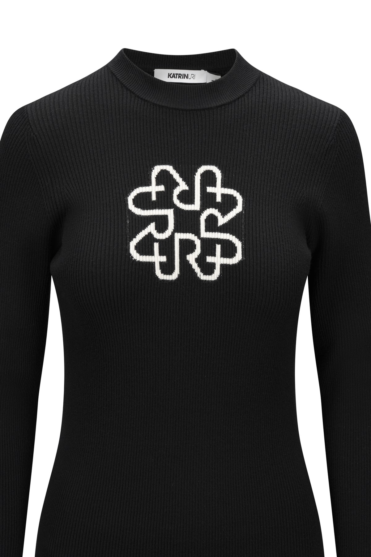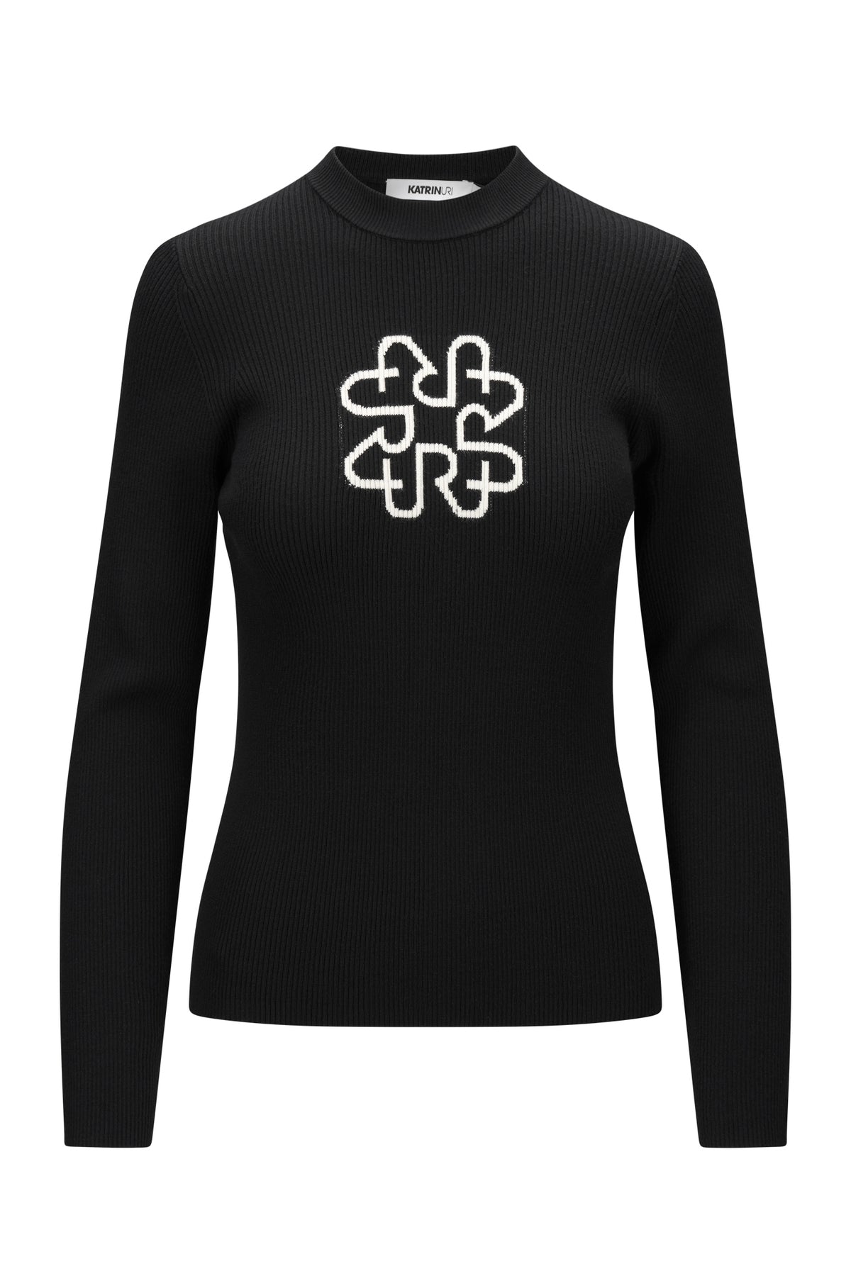 Superbehaglig ribbestrikket genser fra Katrin Uri i sort med hvitt monogram på brystet. Enkel, smal og fin genser som passer fint å style både til skjørt og bukser.