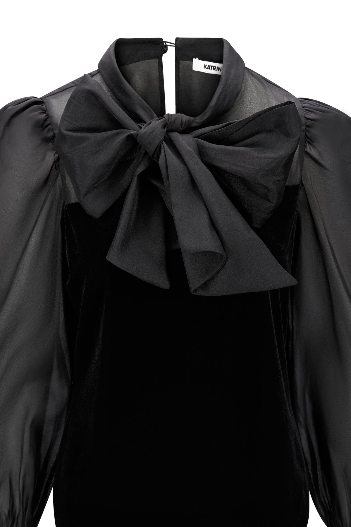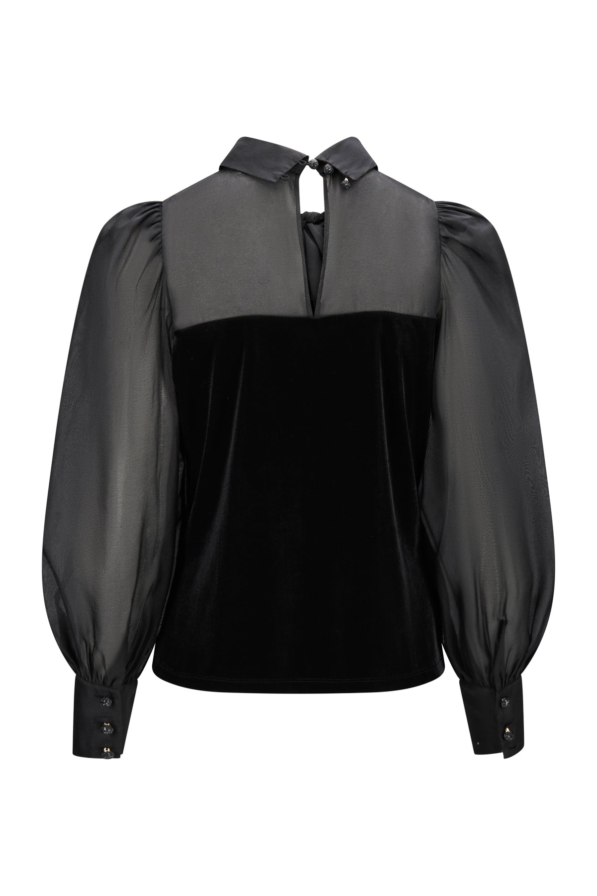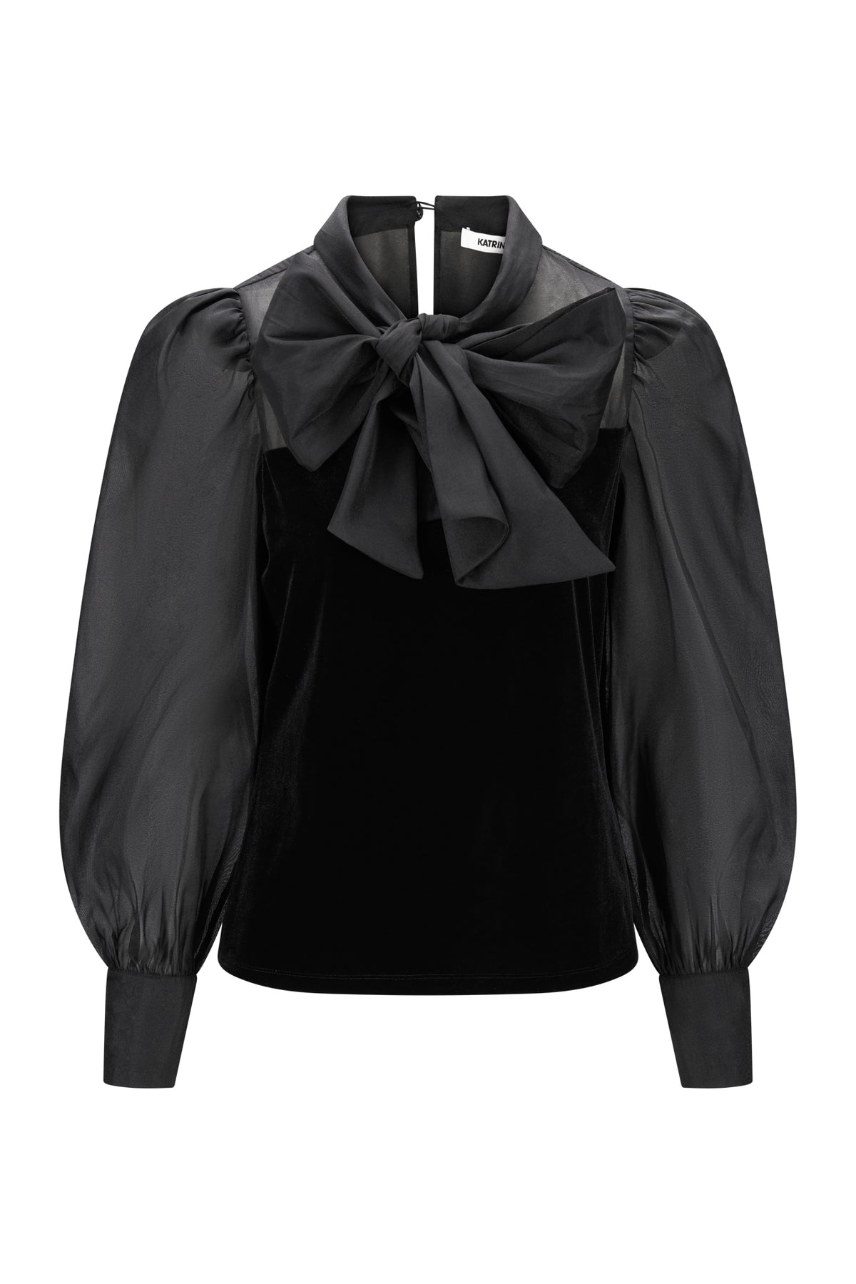 Sabine er en vakker, pyntet topp med spennende detaljer. Blusen har en trendy sløyfe som gir et sofistikert touch. Kombinasjon av velour, og det litt shiny stoffet i ermer og øvre del av blusen. Det er også pyntede knapper nederst på mansjettene og i nakken.