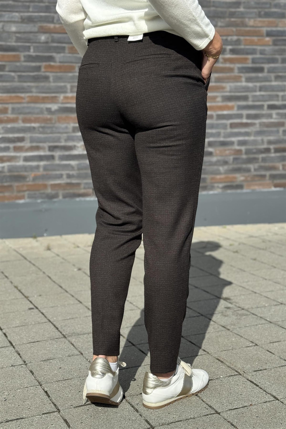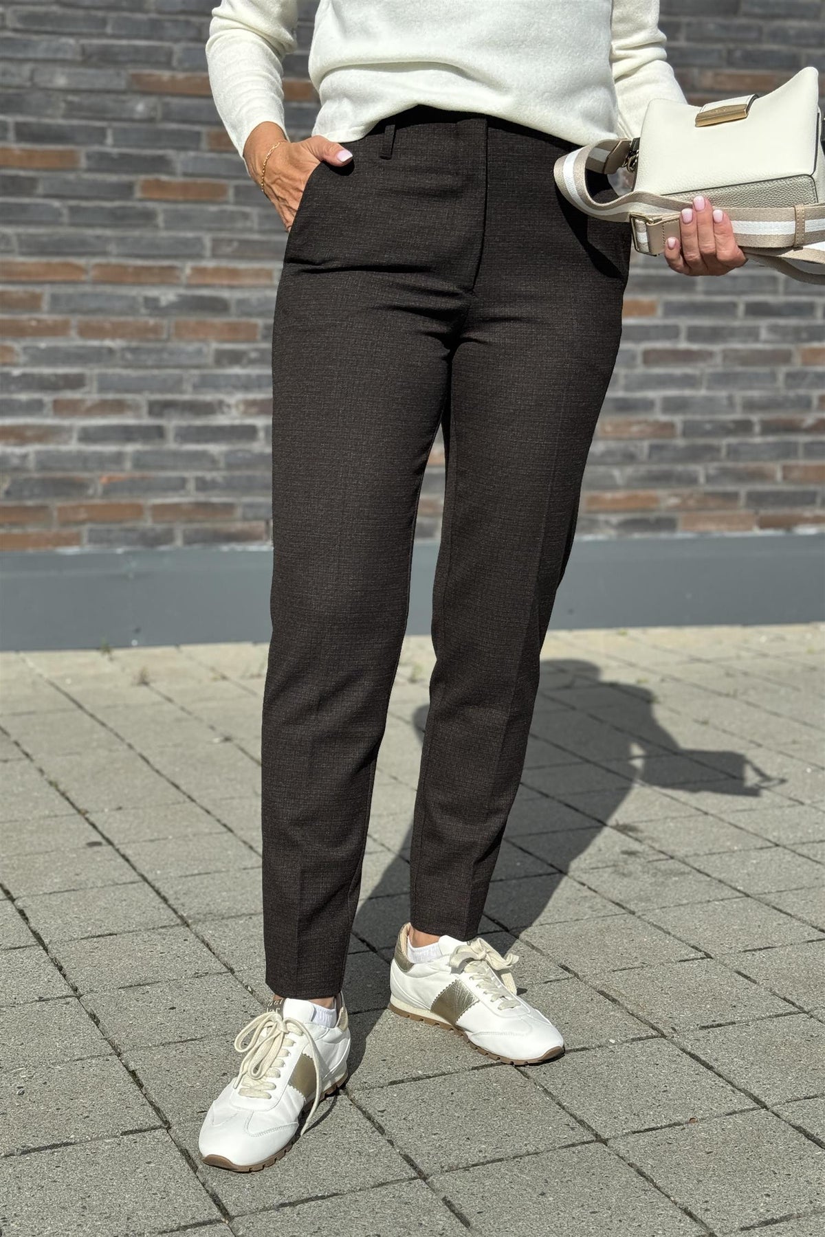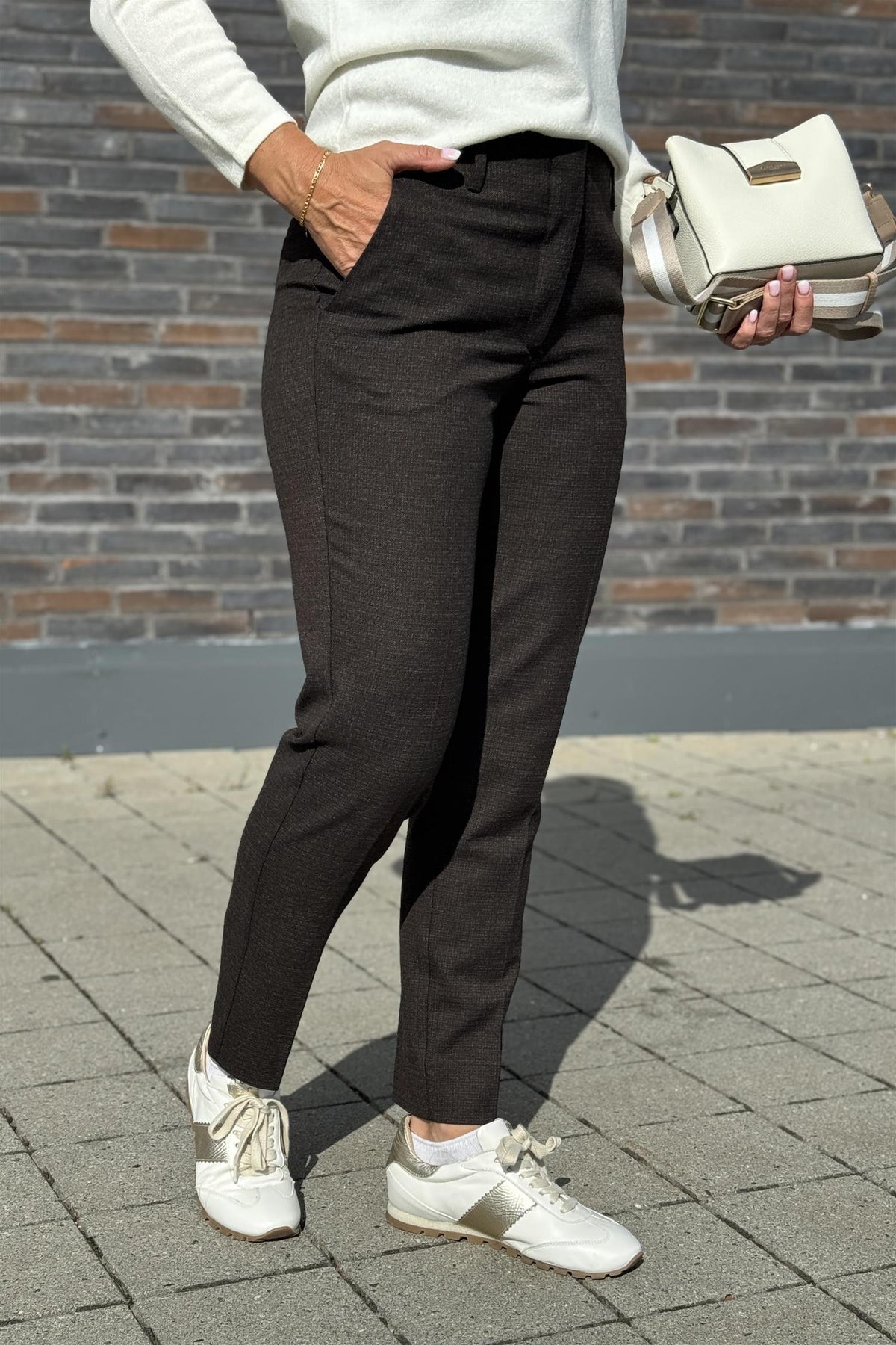Julia i en fin mocca check for høsten. Julia har taperd fit, fin høyde i livet, og er ment for å hvile på hoften, slik at du får litt vidde i lår. Stikklommer i siden og dresslommer bak. Fint avpasset nedover benet, som smalner inn nederst. Er ankel lengde.