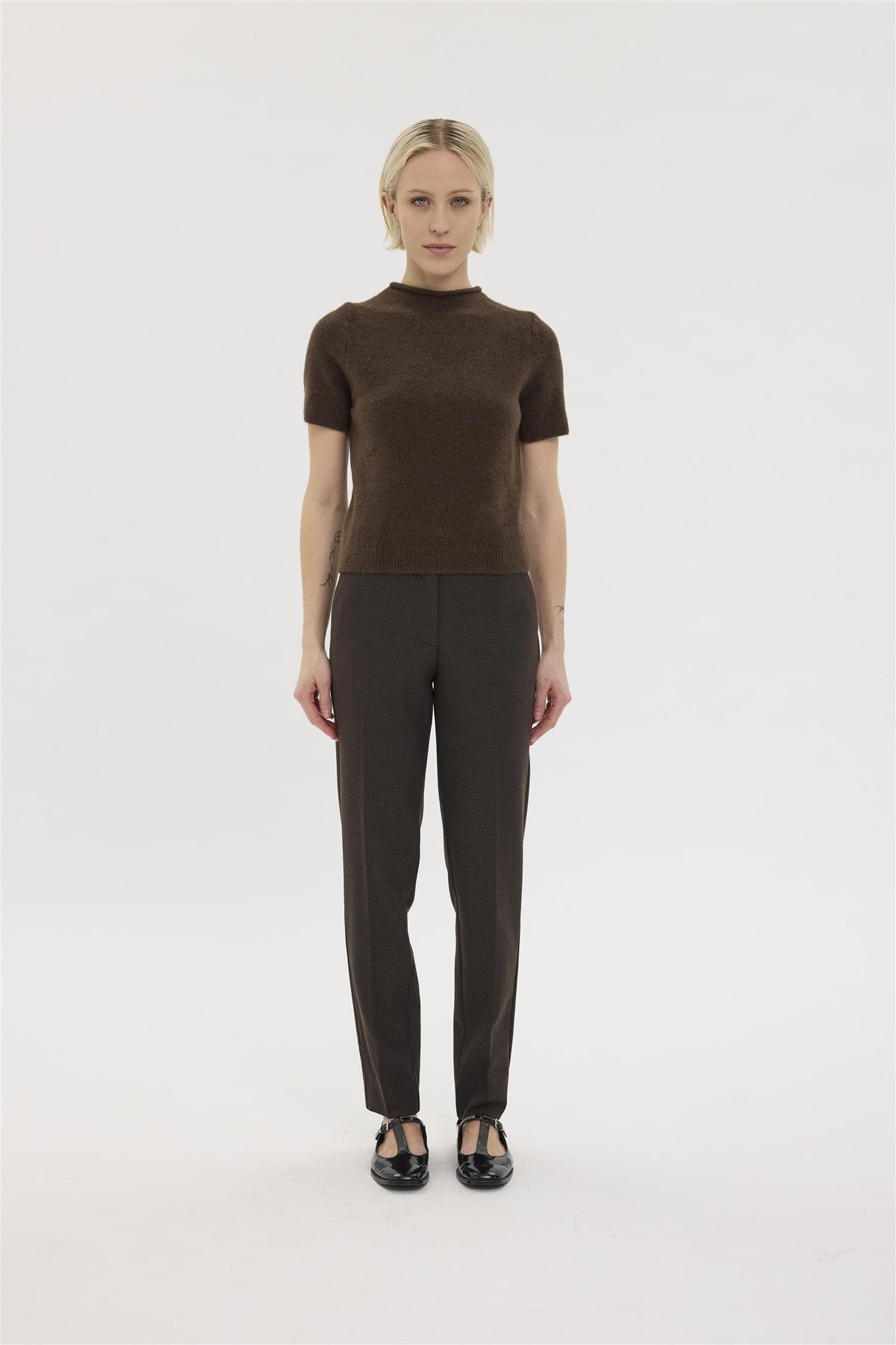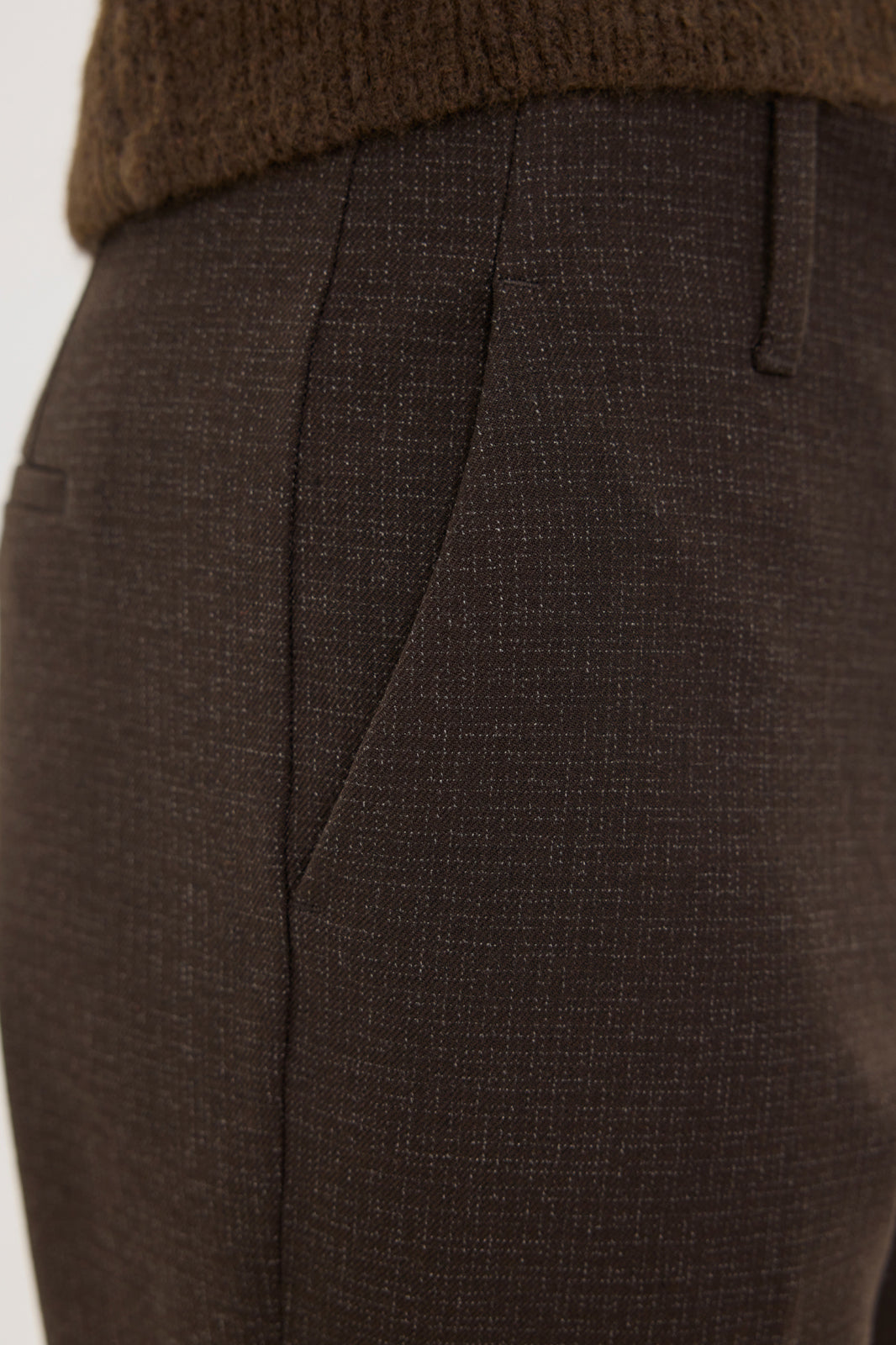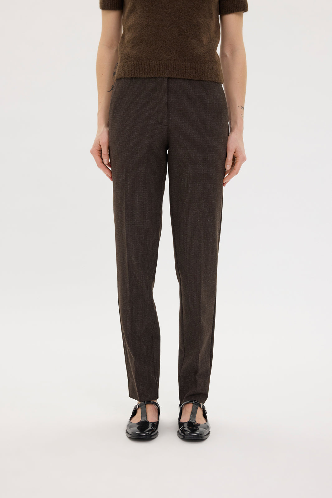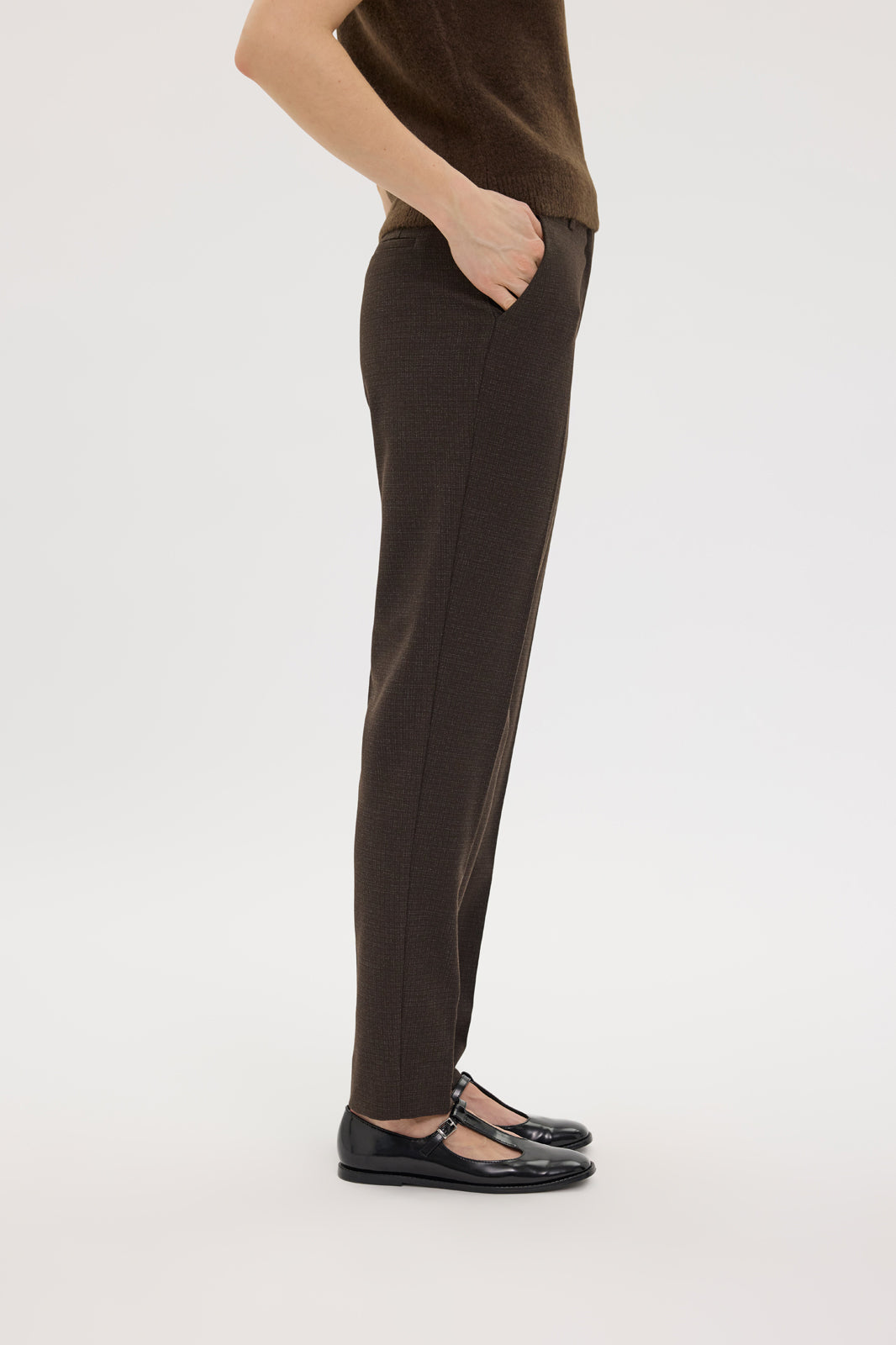 Julia i en fin mocca check for høsten. Julia har taperd fit, fin høyde i livet, og er ment for å hvile på hoften, slik at du får litt vidde i lår. Stikklommer i siden og dresslommer bak. Fint avpasset nedover benet, som smalner inn nederst. Er ankel lengde.