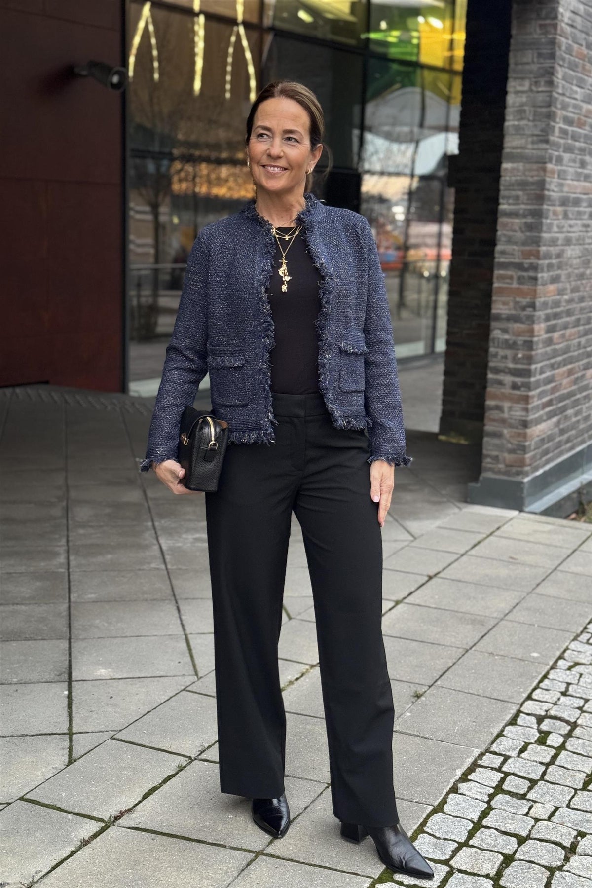 Sargo knit fra YAS har fine frynsedetaljer i kantene. Boucle-uttrykk med lurextråder i gull som gir stilen mer pyntet.
