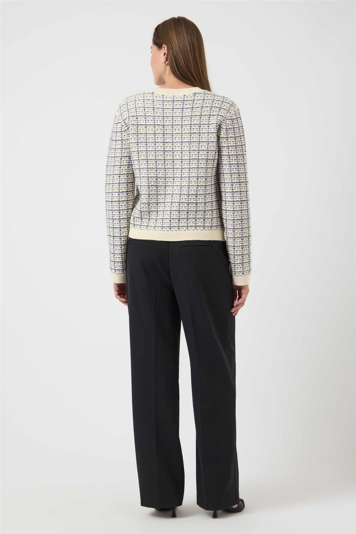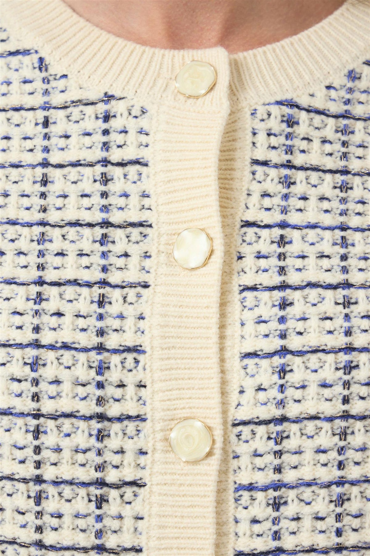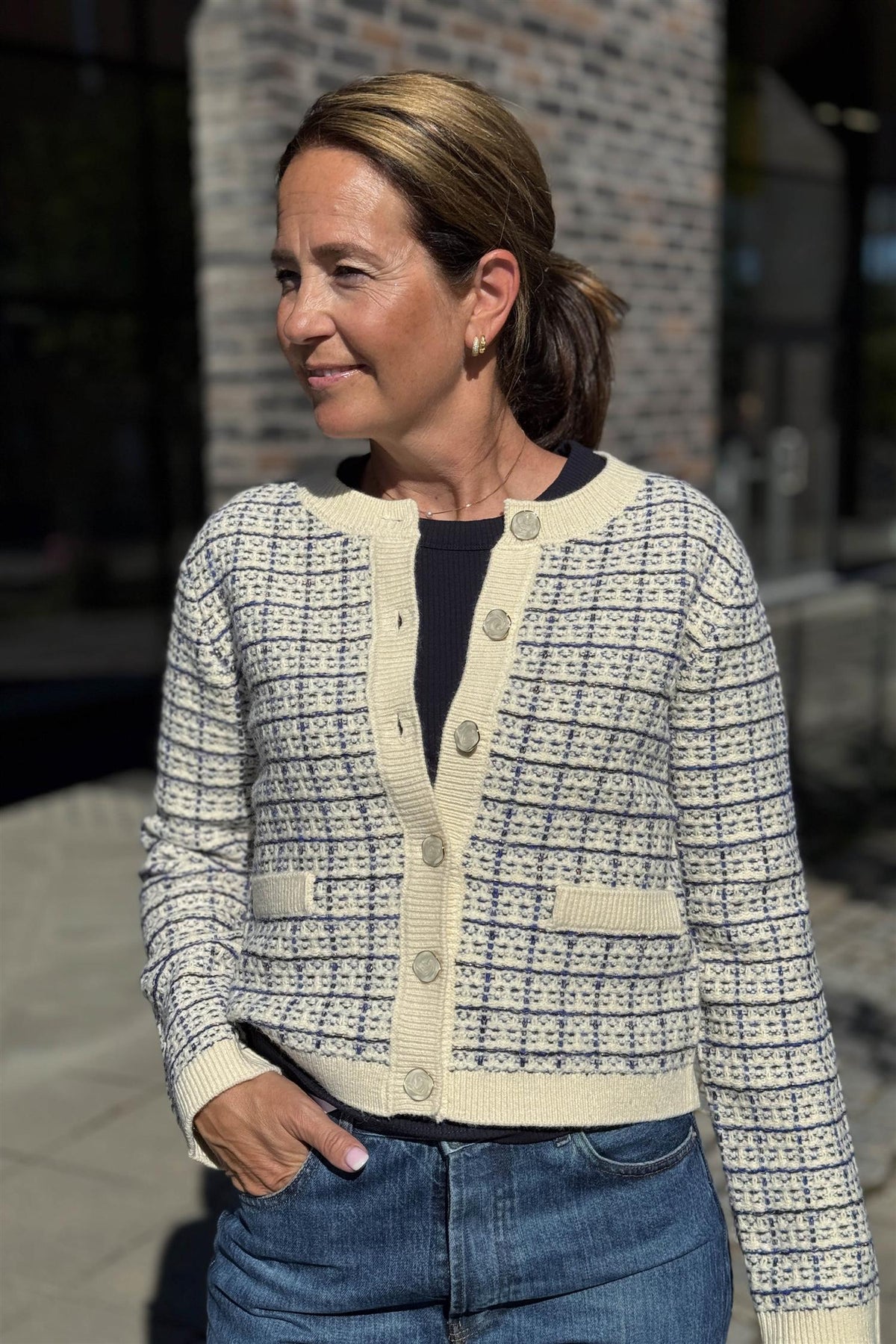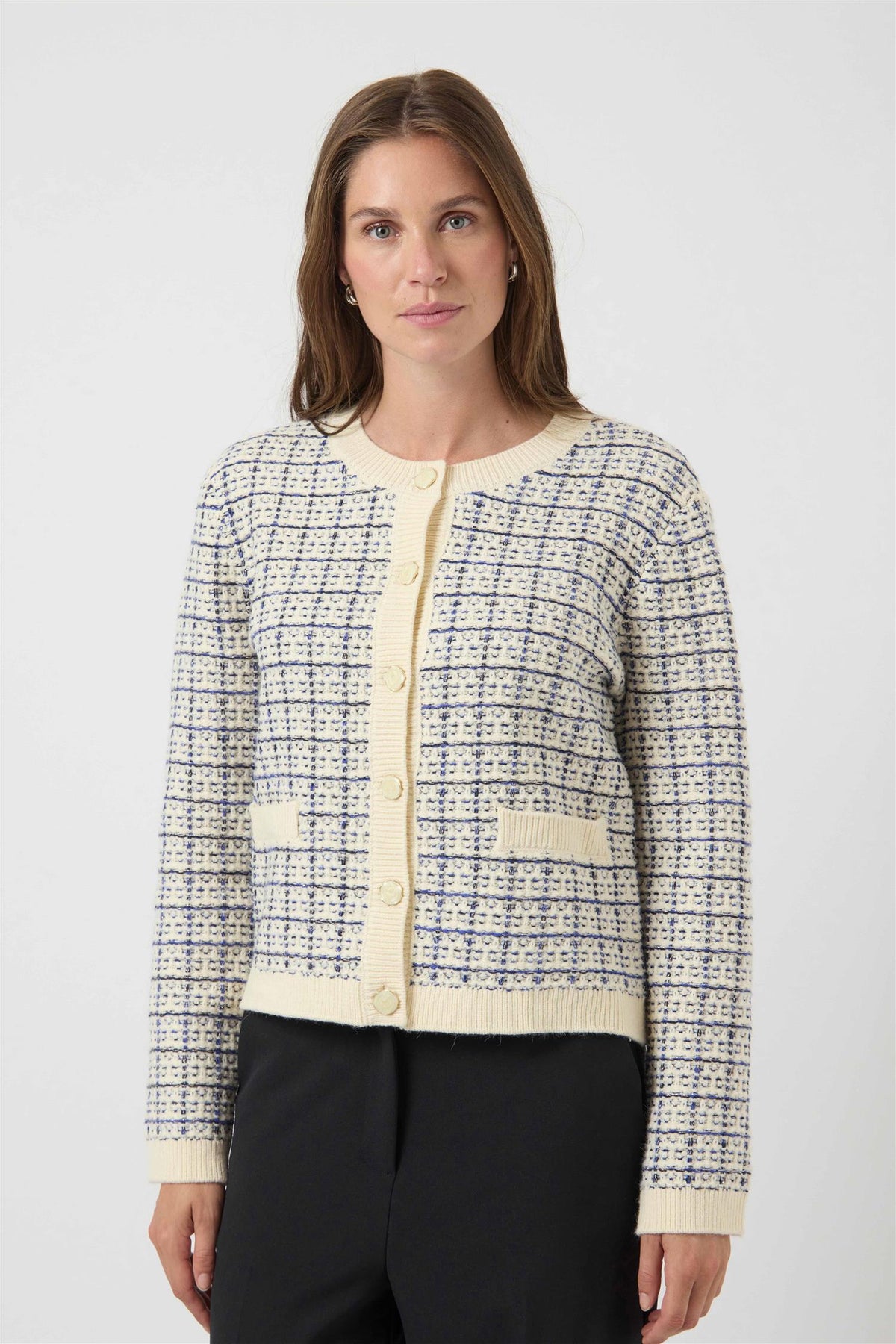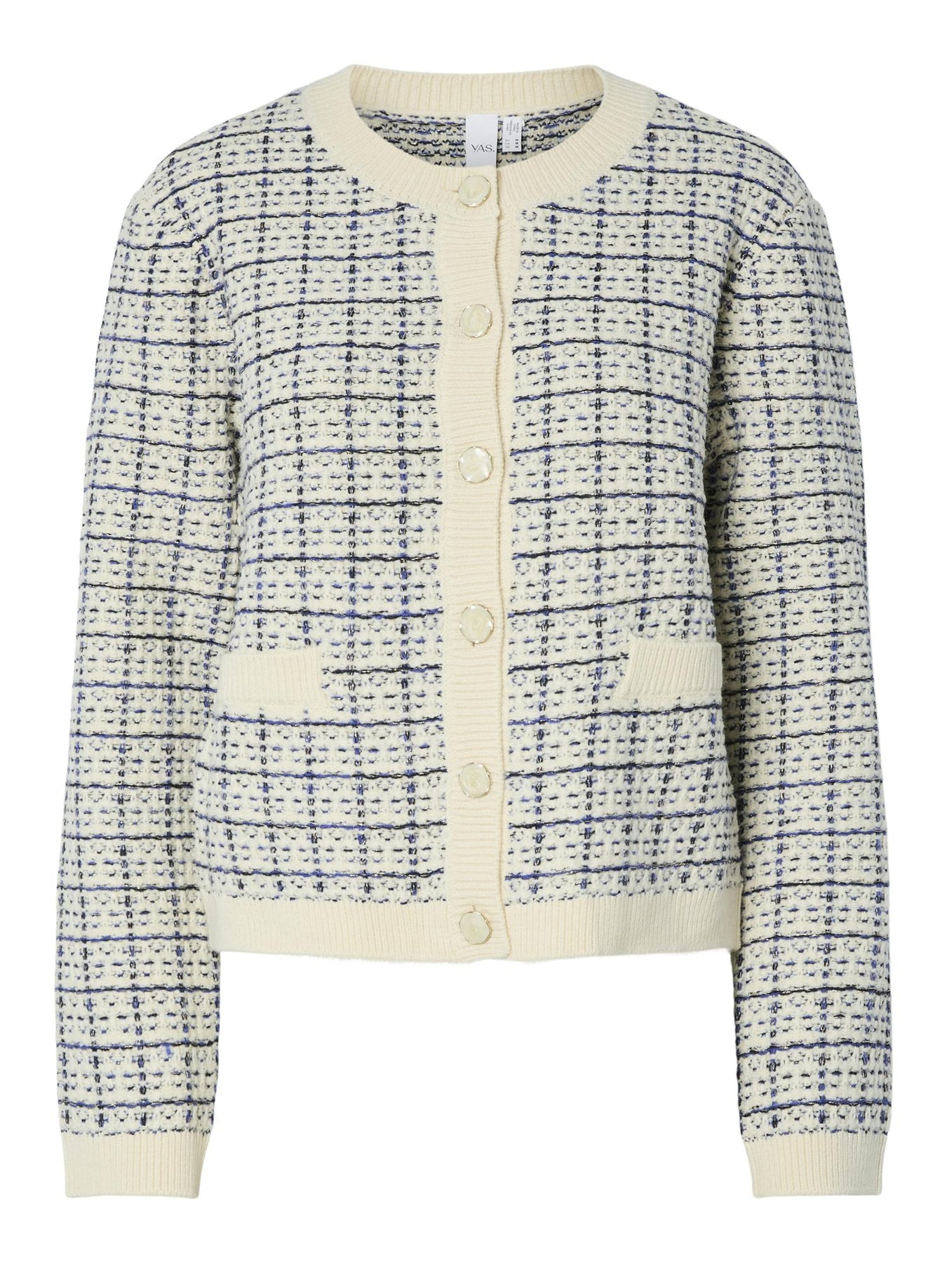 Livia fra YAS er en fin, strikket cardigan i blått, og kremfarge. Liva har fine detaljer med blå kontraster og knapper i gullfarge. Er rett i fasongen og vanlig i størrelsen.