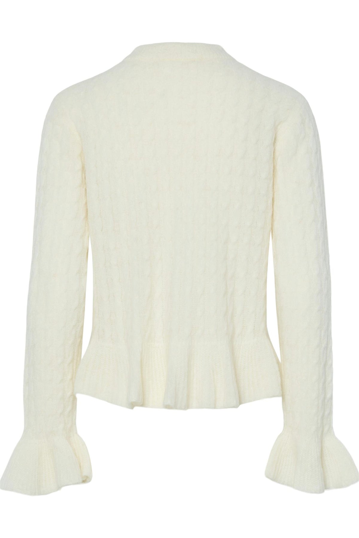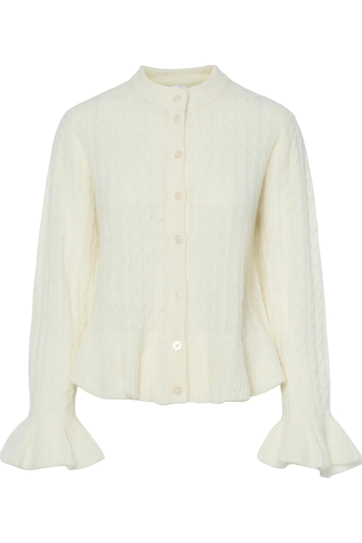 Numa cardigan i offwhite har feminine detaljer med sine fine volanger nederst på ermene. Flettemønster i strikk, rund hals og en volangkant nederst på jakken gir et oppdatert uttrykk.