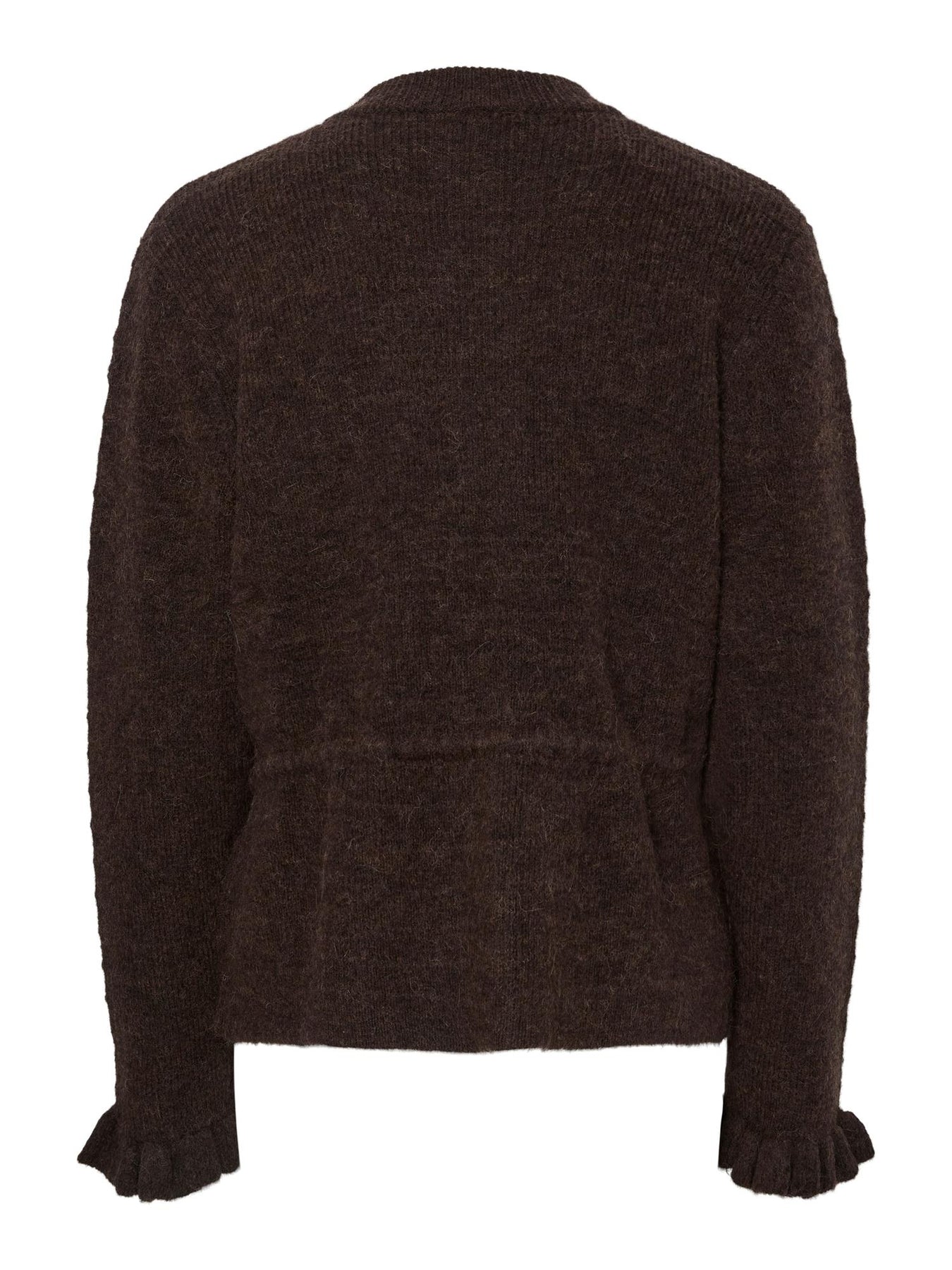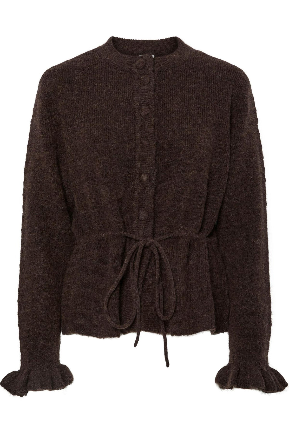 Thellis fra YAS er en nydelig cardigan i ullblanding .Sesongens trendy brune, litt melert i fargen. Rund hals, trekte knapper og knyting i livet. Normal på størrelse. 108 cm i bystvidde i str M.