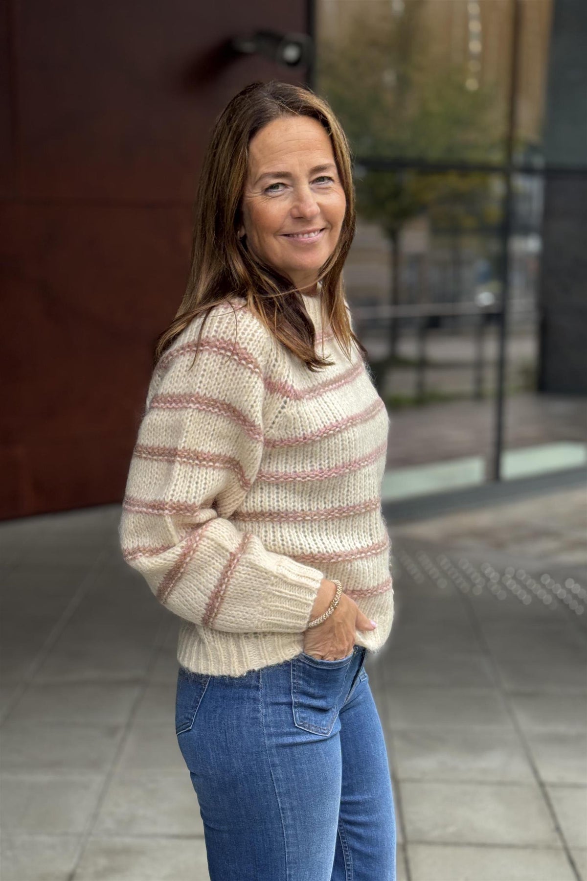 Chima er en tykk ullgenser med fine rosatoner på offwhite bunn. Rund hals og rett fasong. Strikket med raglandsfelling i ermer.
