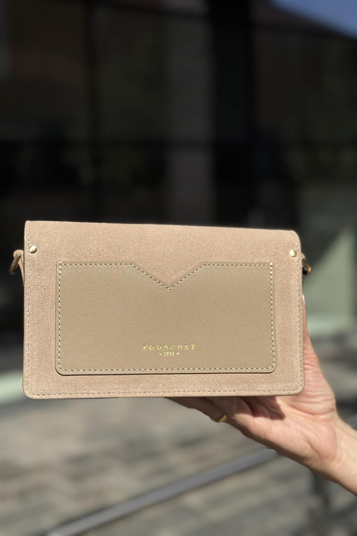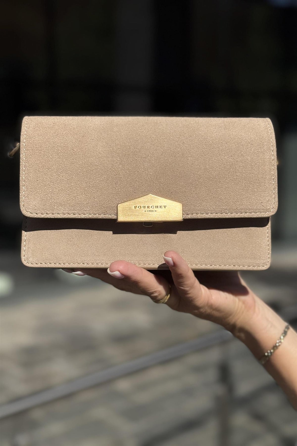 Club mastic er nydelig clutch i semsket, lyst skinn. Vesken har en lang reim, slik at den også kan brukes crossover.