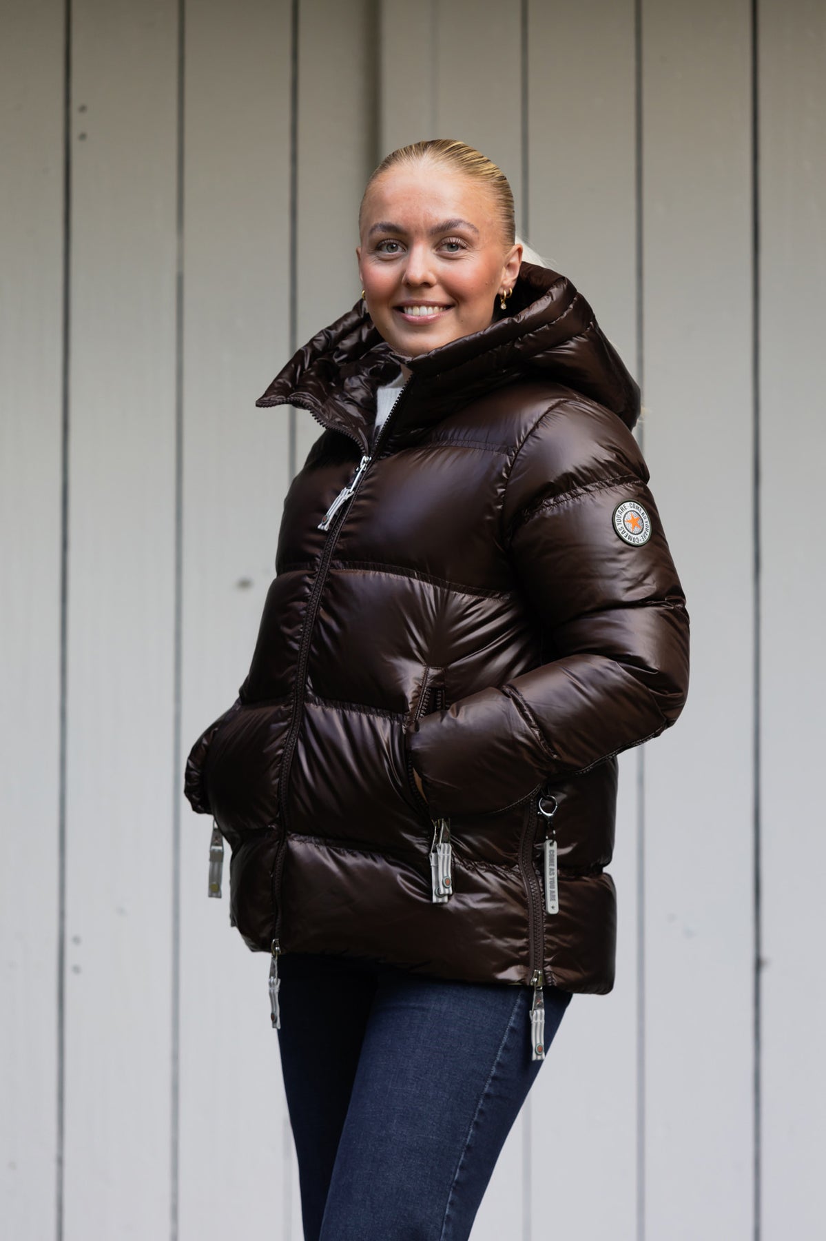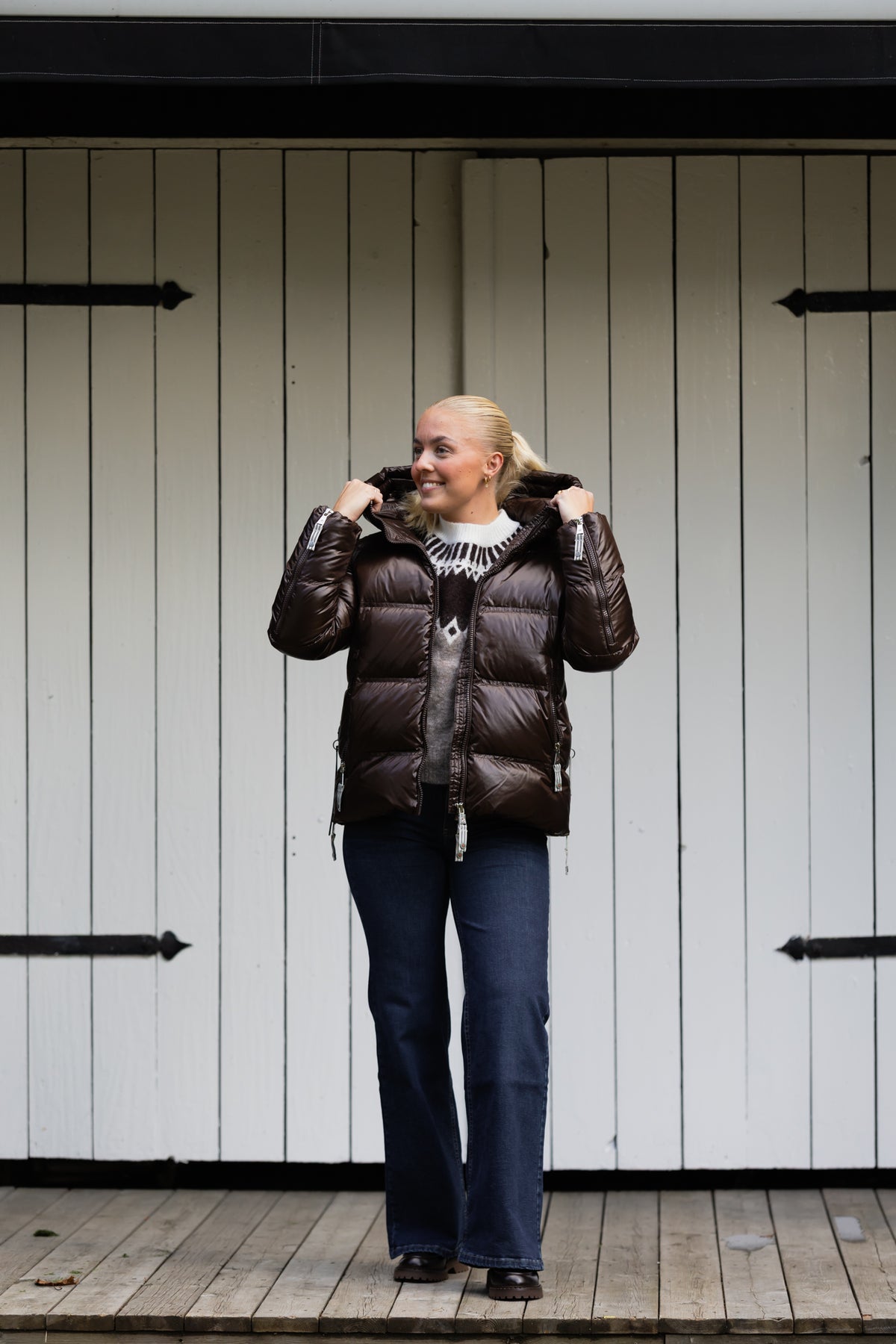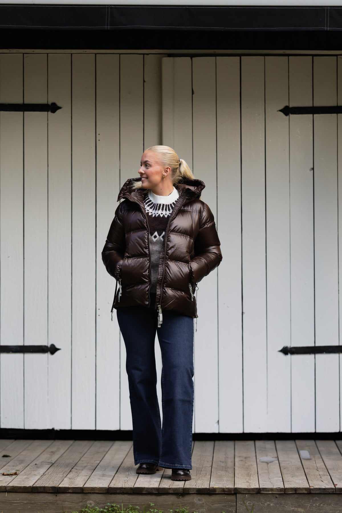 Erika fra C.A.Y.A i mørkebrun er en jakke med lengde til rett over baken. Den er litt nettere i fasongen enn Ginny Short, og med samme fine detaljer. Lukkes med synlig glidelås i front.
