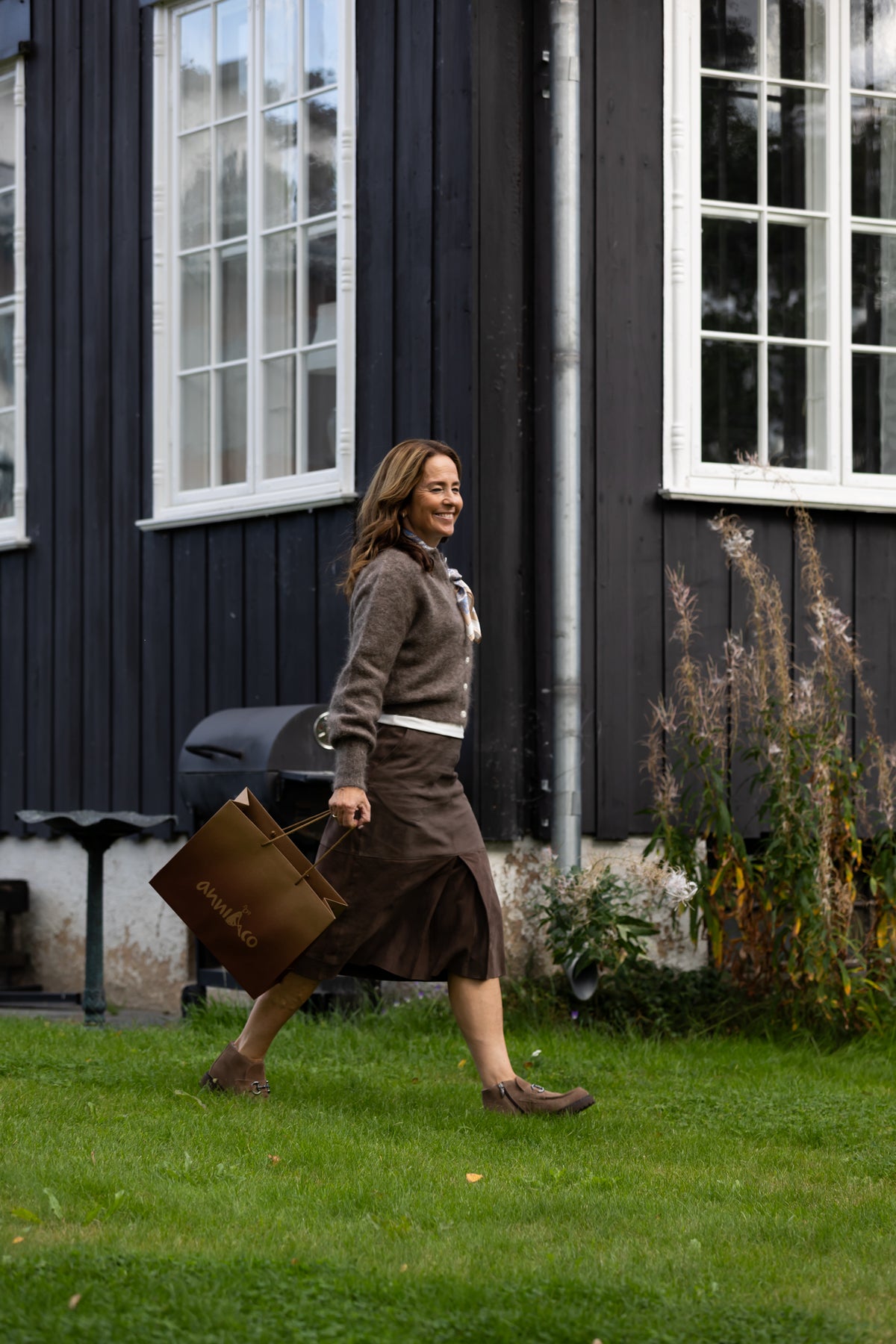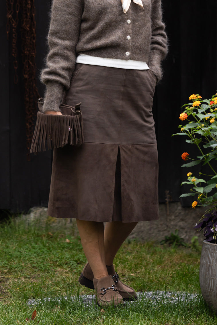 Nydelig skinnskjørt fra Depeche. Skjørtet er i mykt, semsket skinn - i fin brun-grå farge. Passer perfekt inn i høstens jordfarger. Style det med en chunky strikk og sneakers eller boots. Semsket er kommet for å bli, så dette skjørtet skal få bli med hele året.