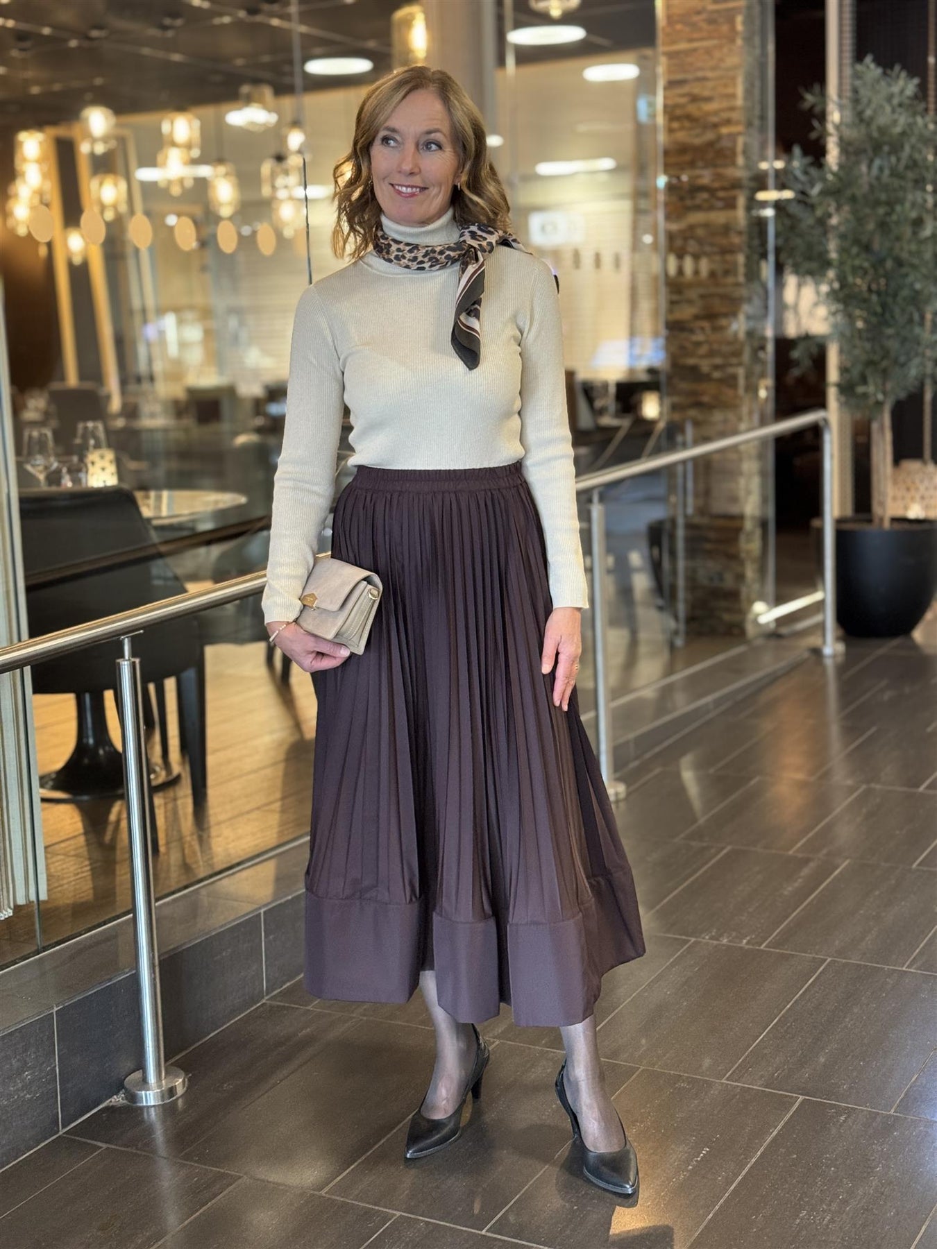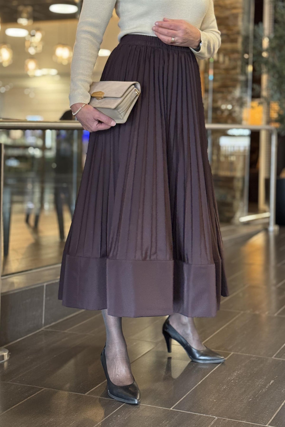 Nydelig skjørt fra MeiMeiJ i en vakker borgogna brunfarge. Skjørtet er i plisse, med en bred kant nederst - denne er stivere, slik at skjørtet får volum og fin bevegelse. I livet er det strikkant, slik at det er behagelig å ha på. Sett det høyt i livet, med en smal genser til, eller kort jakke eller en vakker bluse om du skal pynte et.