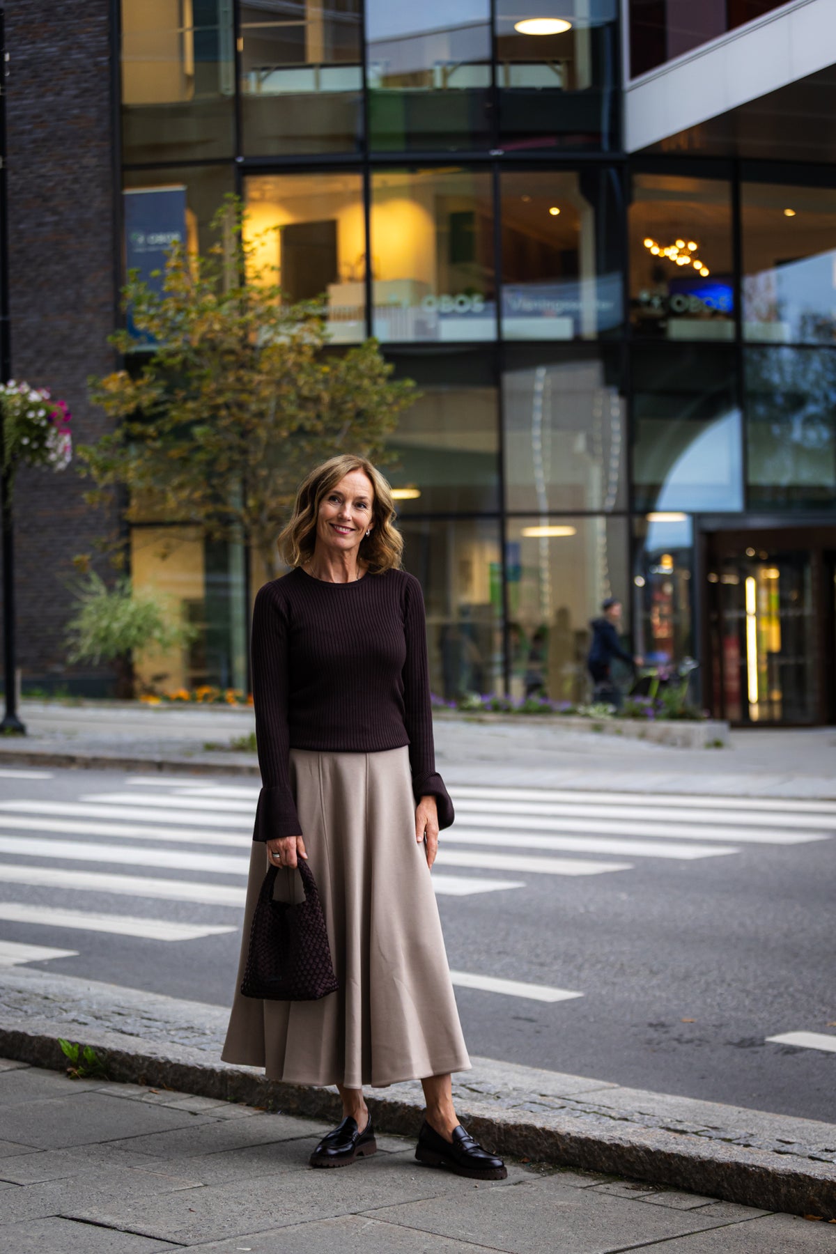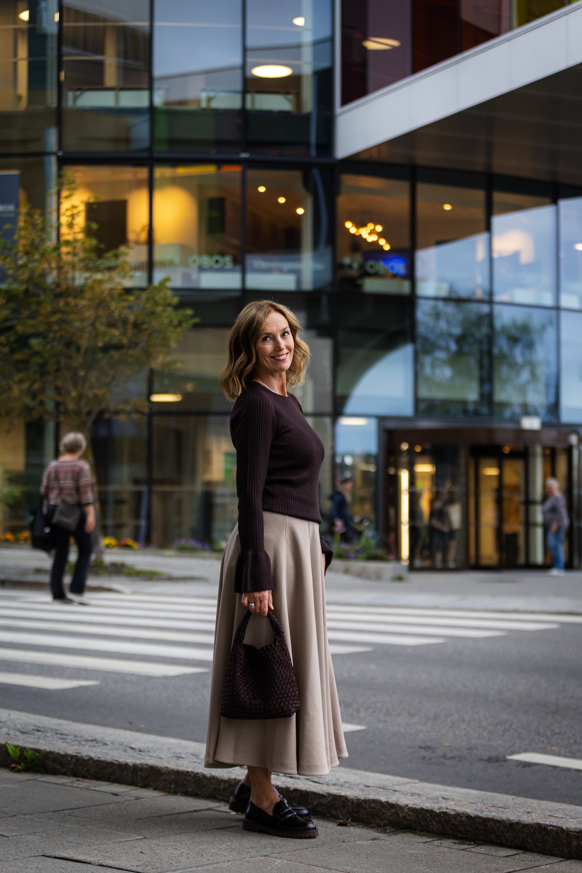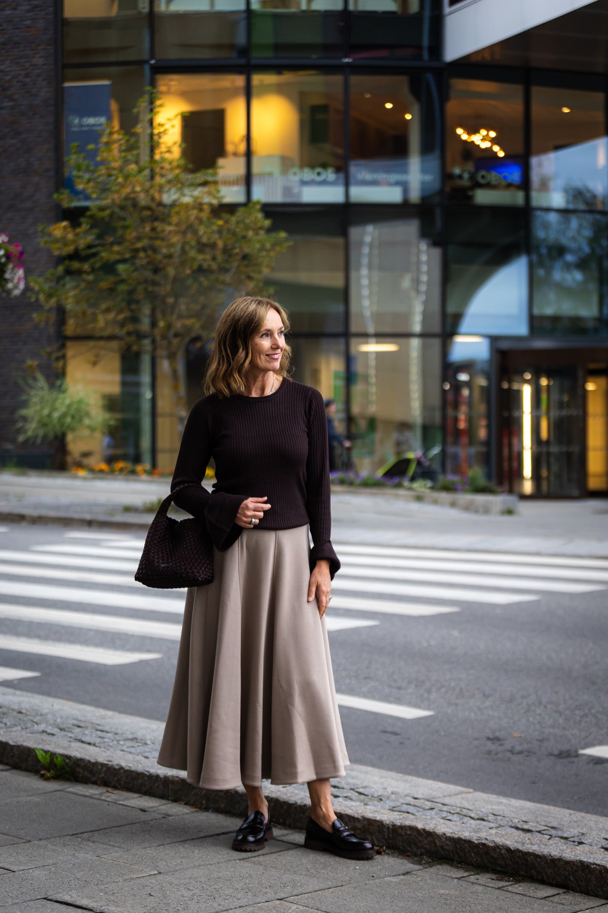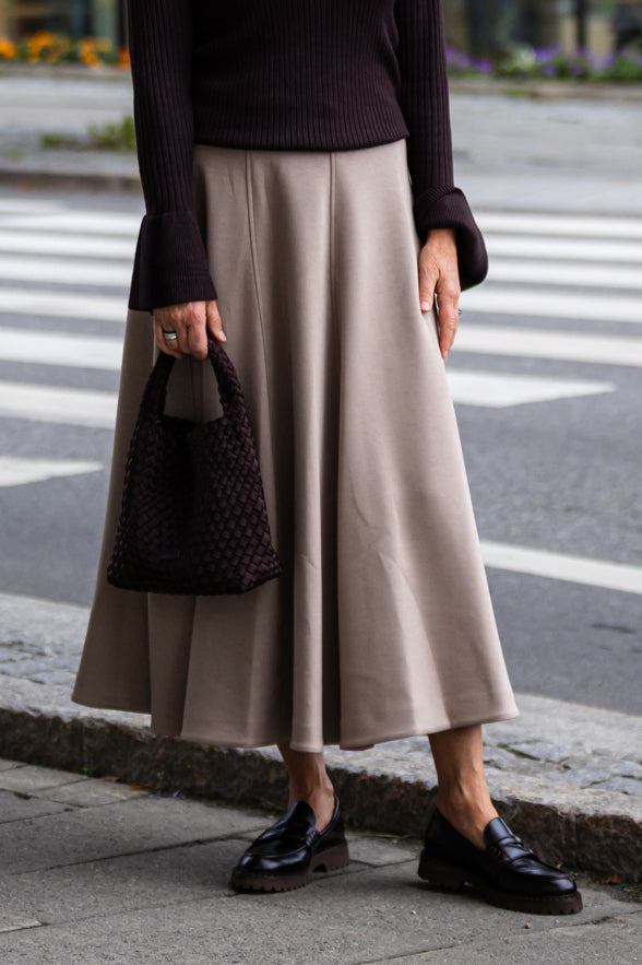 Skjørtet har linning med skjult stikk, så det er behagelig på. Skjørtet skrår utover med mye vidde nederst - stoffet har litt tyngde, og faller fint. Sømlinjer nedover skjørtet smalner det og er pent for siluetten.