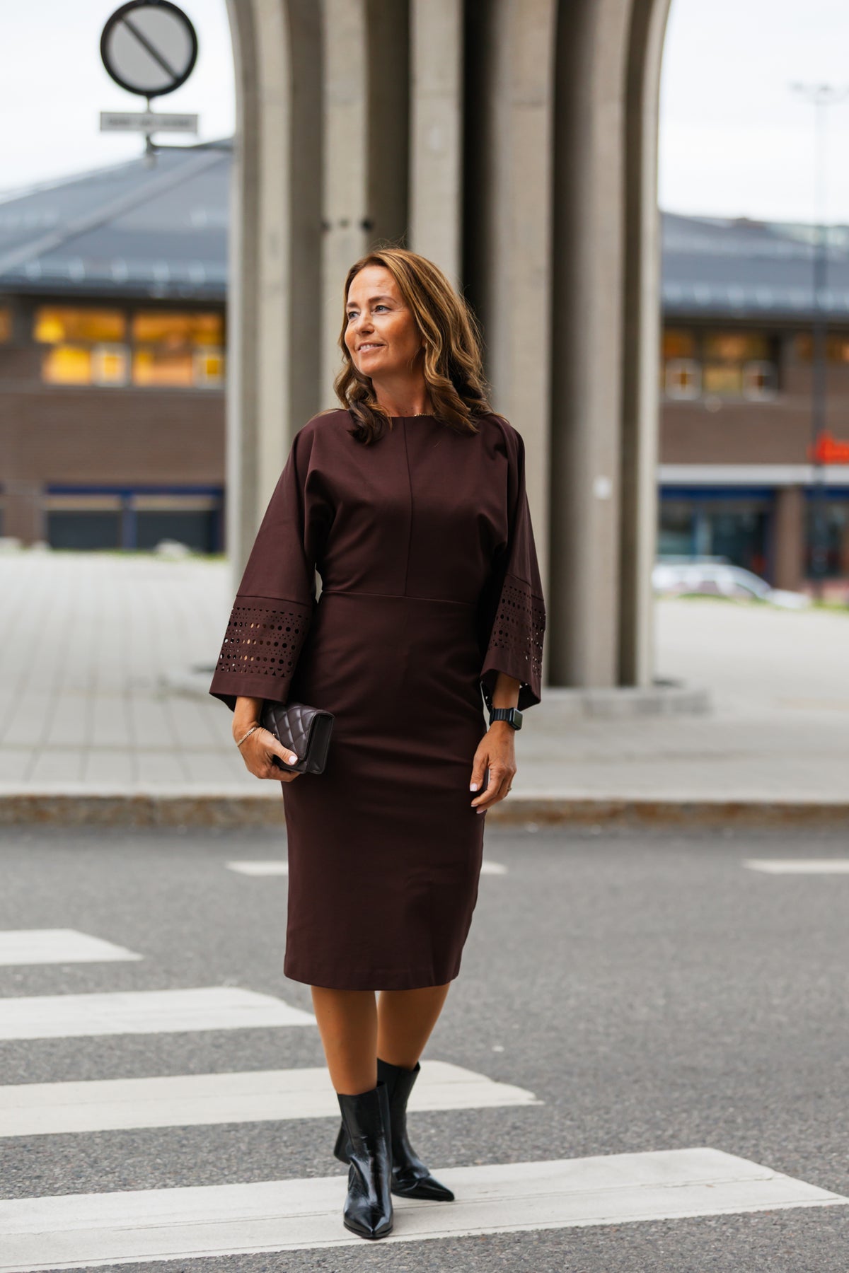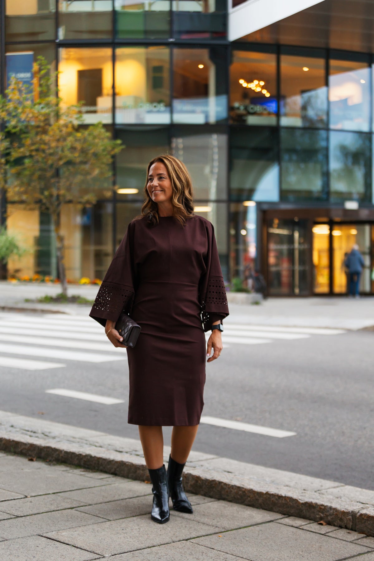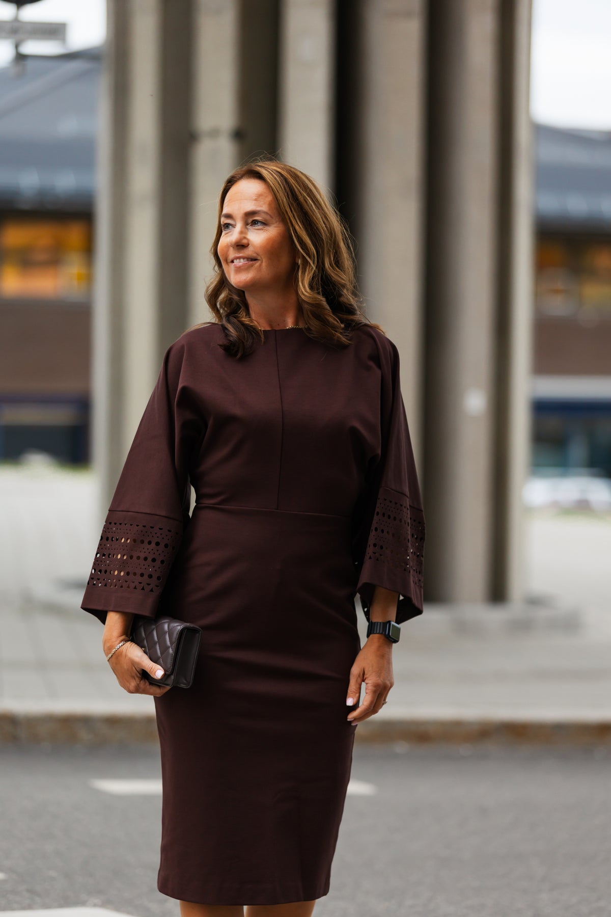 Nydelig kjole i dyp brun-burgunder. Artig detalj med hullmønster nederst på ermene. Kjolen har rund hals, med glidelås bak i nakken. Snittet har flaggermusermer som gir vidde i overdelen, mens skjørtet sitter smalt.