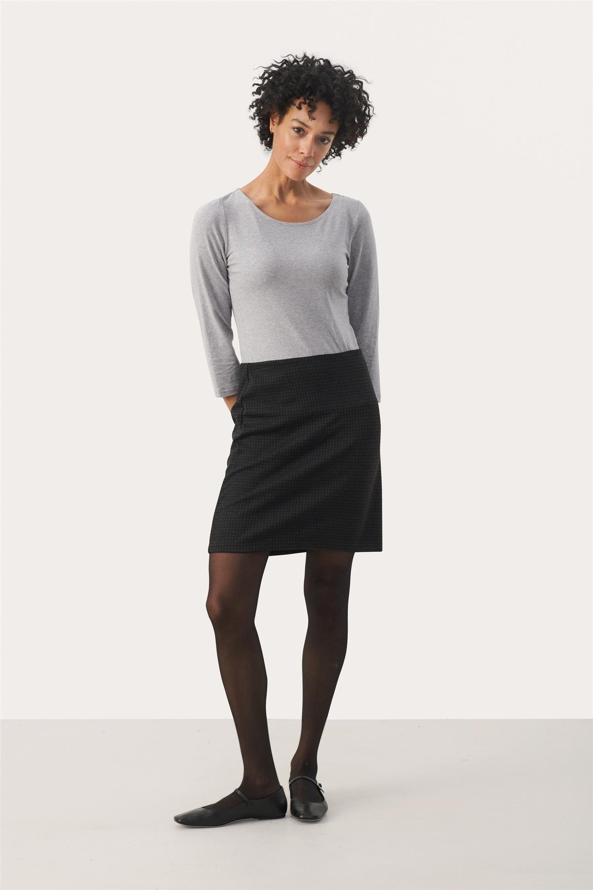 Corinne skjørt fra Part Two har fin fasong, klassisk og lett å bruke. Mykt materiale som er godt å ha på. Strikklinning som er glatt, skjørtet kan enkelt trekkes på. Rutemønster i sort og gråtoner, enkelt å style sammen med høstens antrekk.