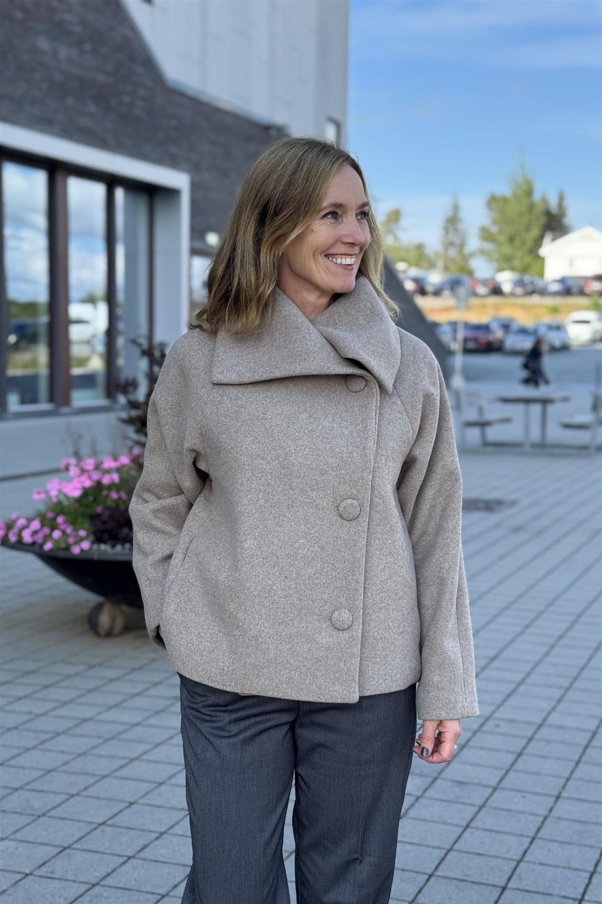 Perry er en nydelig, kort ulljakke fra InWear. Snittet er helt riktig til høstens trend. Perry har tre store trukne knapper for lukking. Den er like fin om du knepper kun to og har den mer åpen i halsen. Jakken er kort, går til rett nedenfor hoftene, og har stikklommer i siden. Raglandsfelling i ermene gjør den litt god i størrelsen, slik at noen velger å gå ned en str. Den korte kåpen er perfekt til både bukser og skjørt. Lett å velge når du skal ut og inn av bil, uten at det er alt for kaldt. Den er foret.