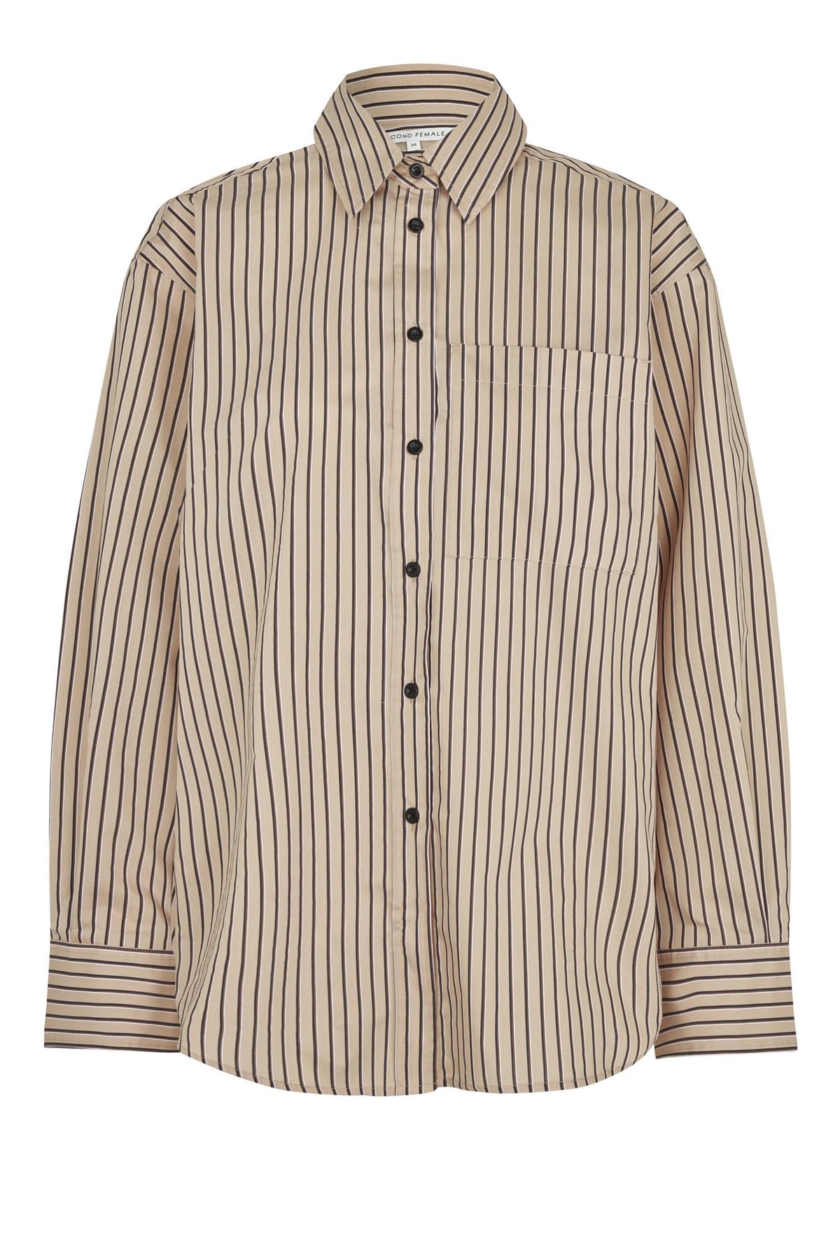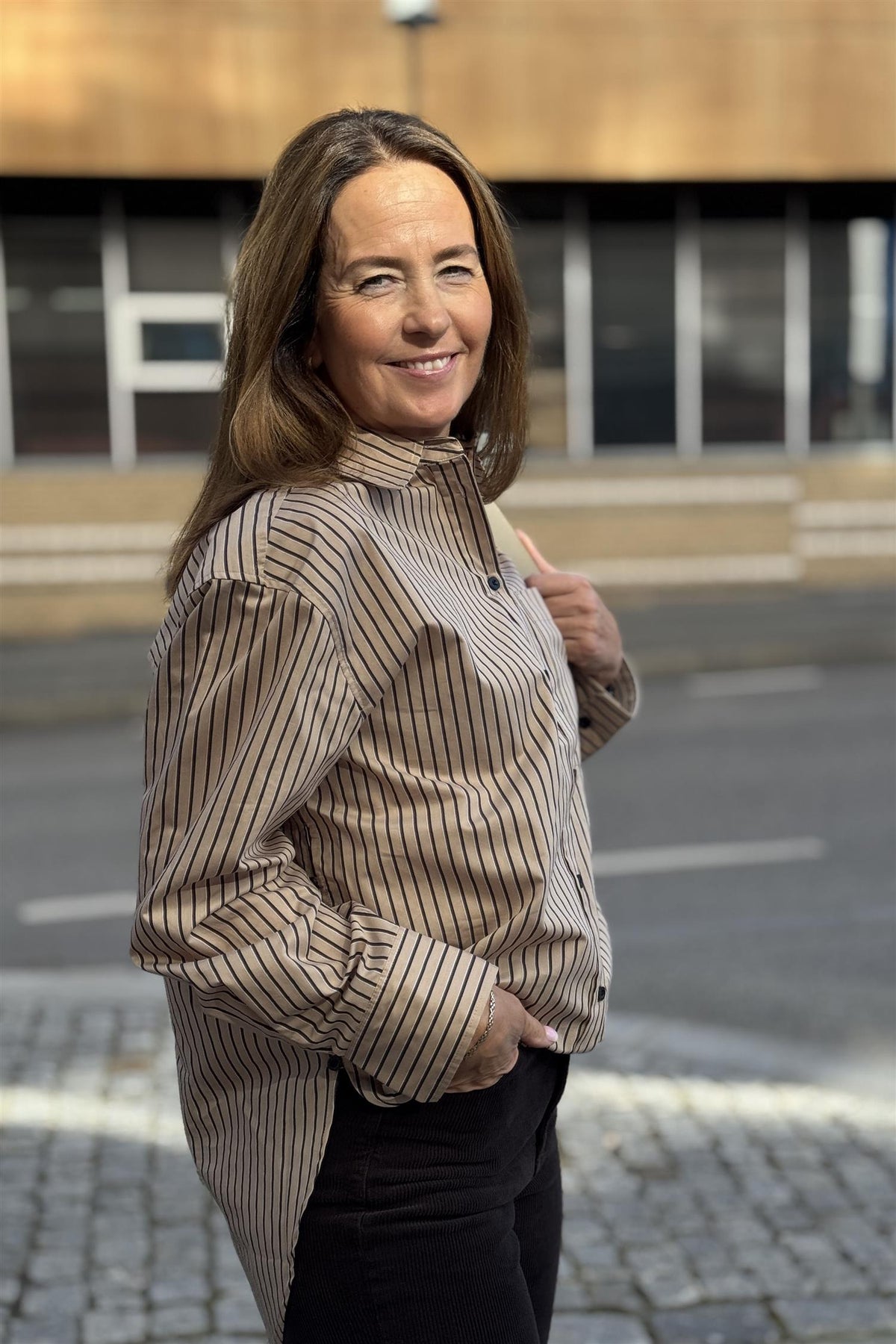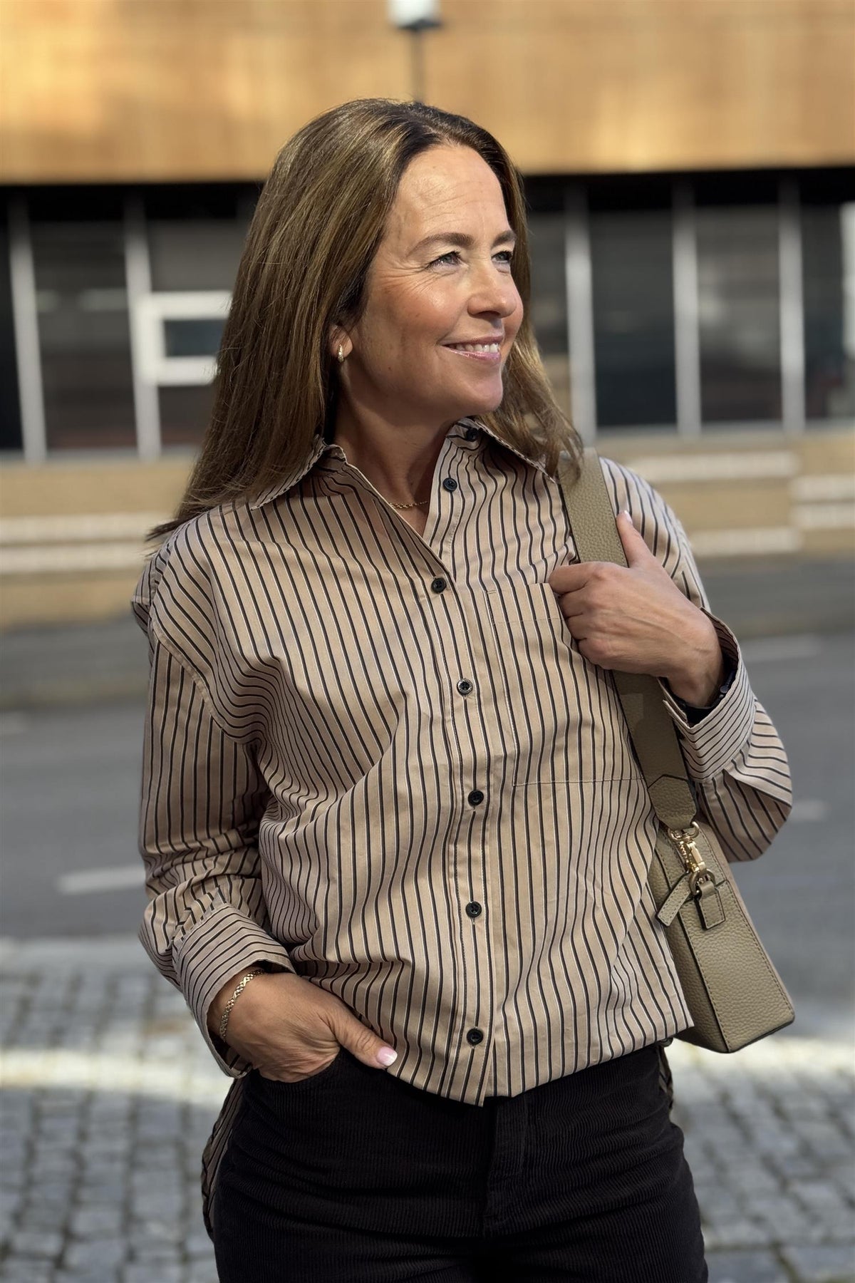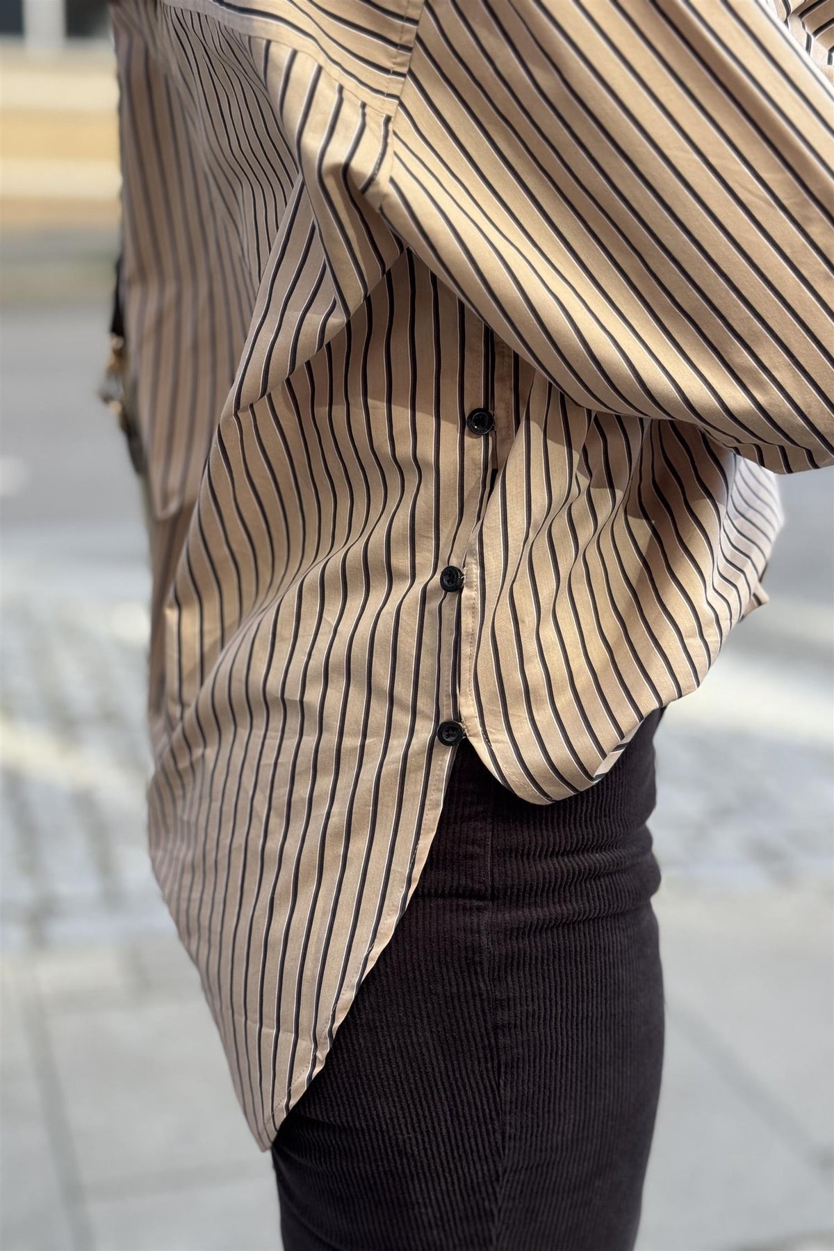 Tøff storskjorte fra Second Female med striper i hvit, brun og sort på beige bunn. Serina shirt har knapper i siden og avrundet form nederst på midtstykket. Sorte knapper som en fin kontrast, samt en stor brystlomme på venstre side. Knapper i bred mansjett.