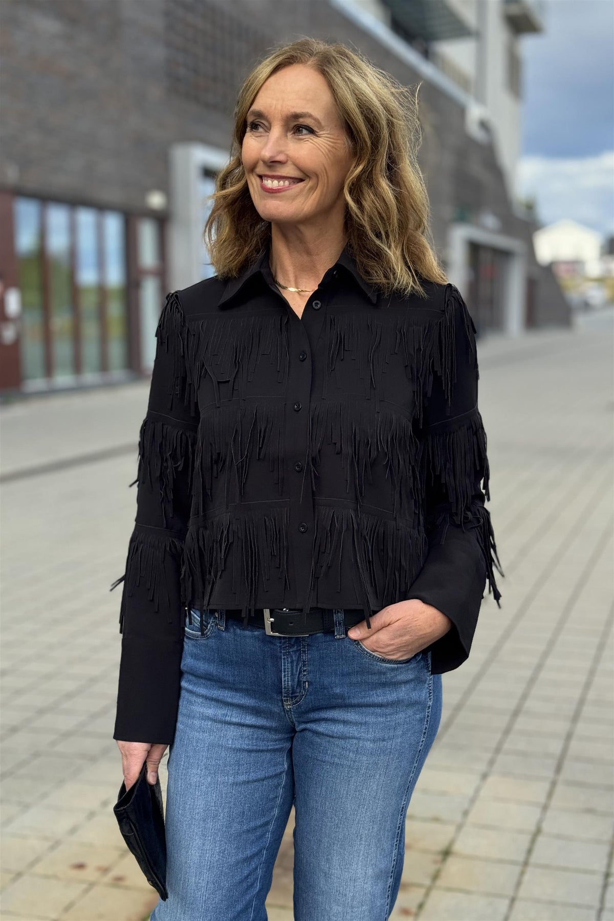 Sesongens kuleste bluse med tøffe frynser fra Second Female. Denne blusen svinger det definitivt av og pynter opp ett hvert antrekk. Blusen har krage, knapper i front og kan også brukes som en jakke. Bred mansjett med splitt og knapp, kort modell med litt vidde.