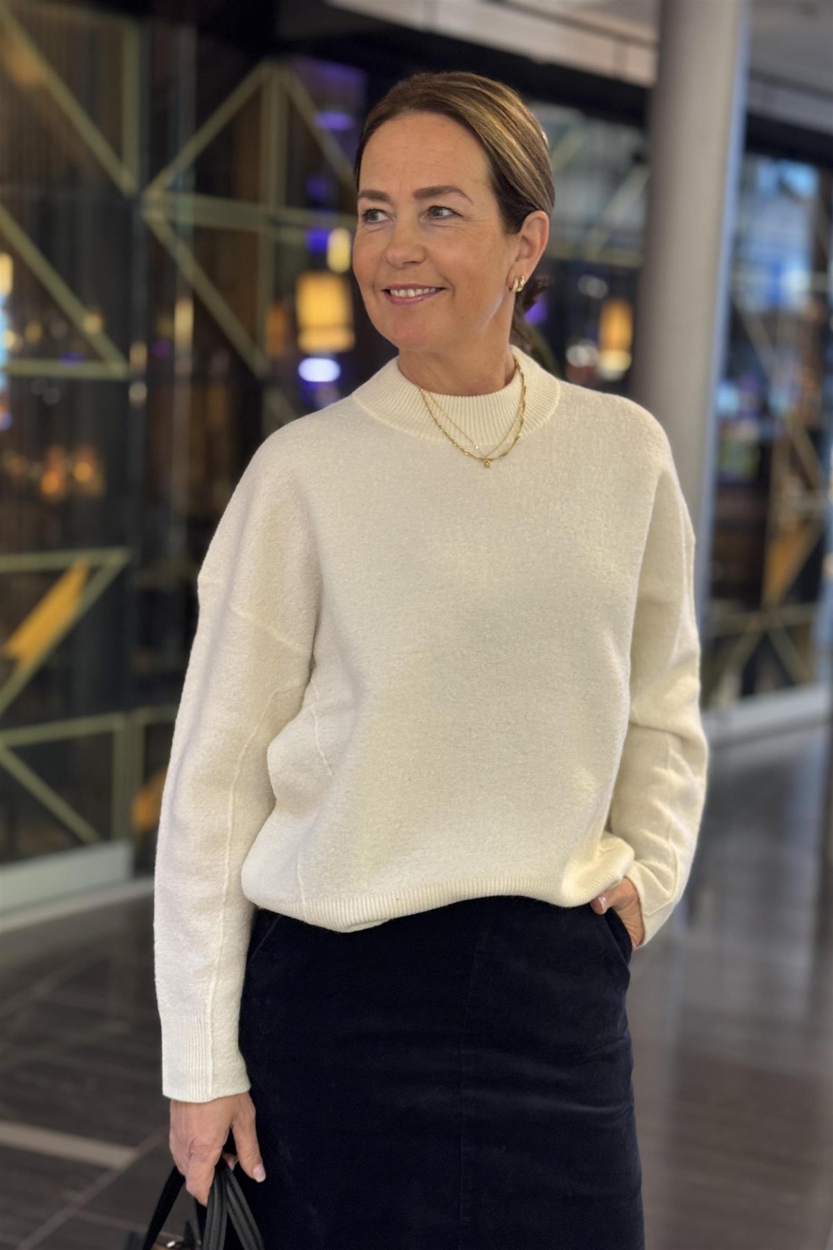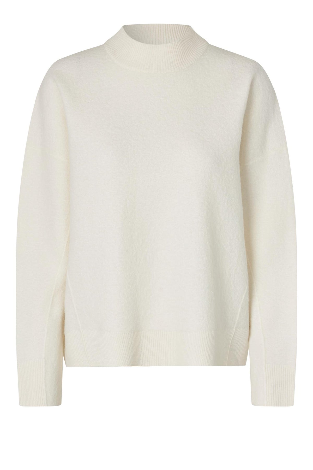 Life knit er en fin strikk, i strikket stoff i tovet overflate. Snittet er oversized, med bred ribkant i hals.