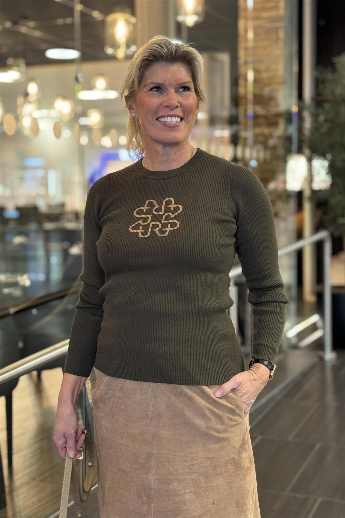Monogram pullover er en superbehaglig ribbestrikket genser fra Katrin Uri i olivengrønn med beige monogram på brystet. Enkel, smal og fin genser som passer fint å style både til skjørt og bukser.