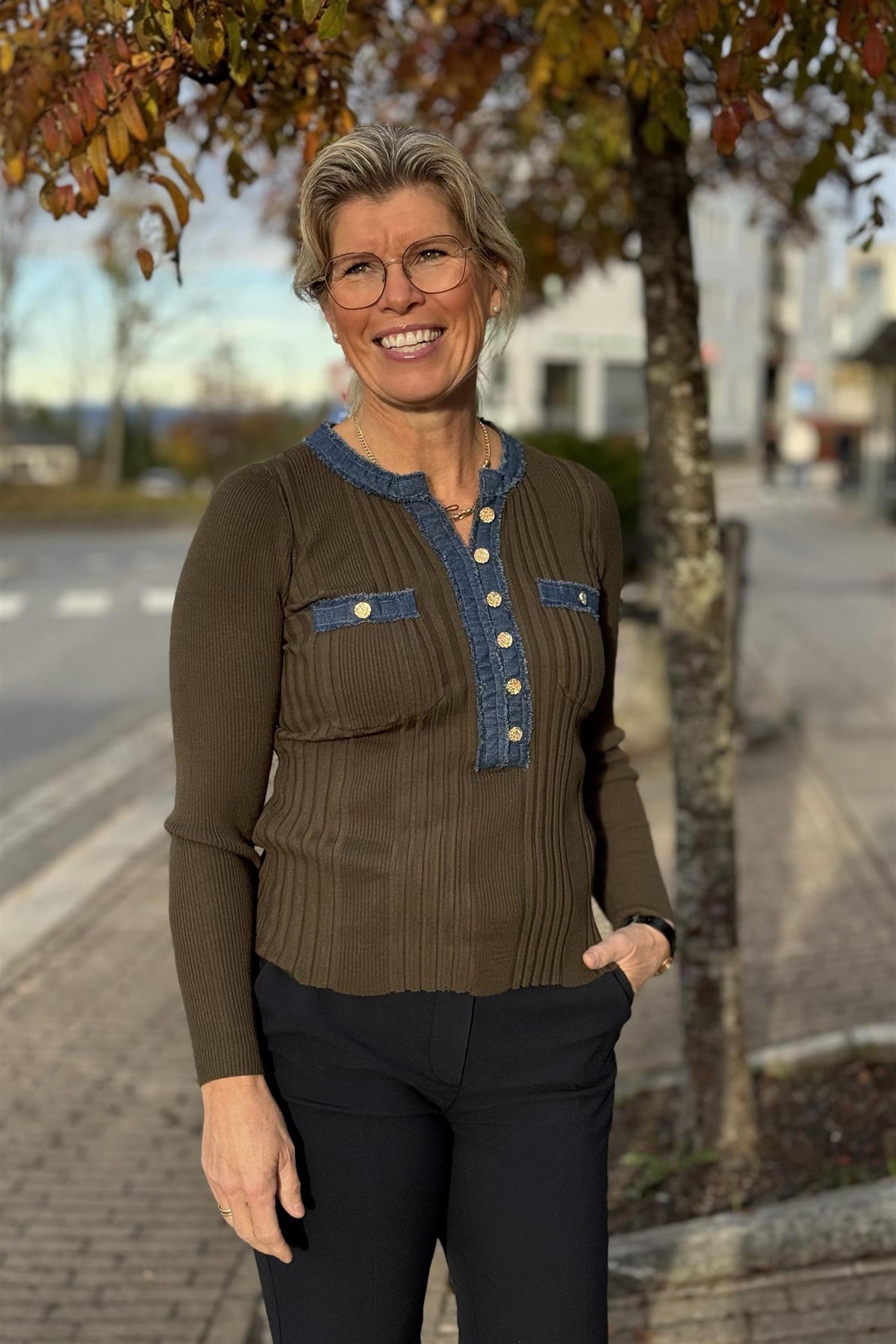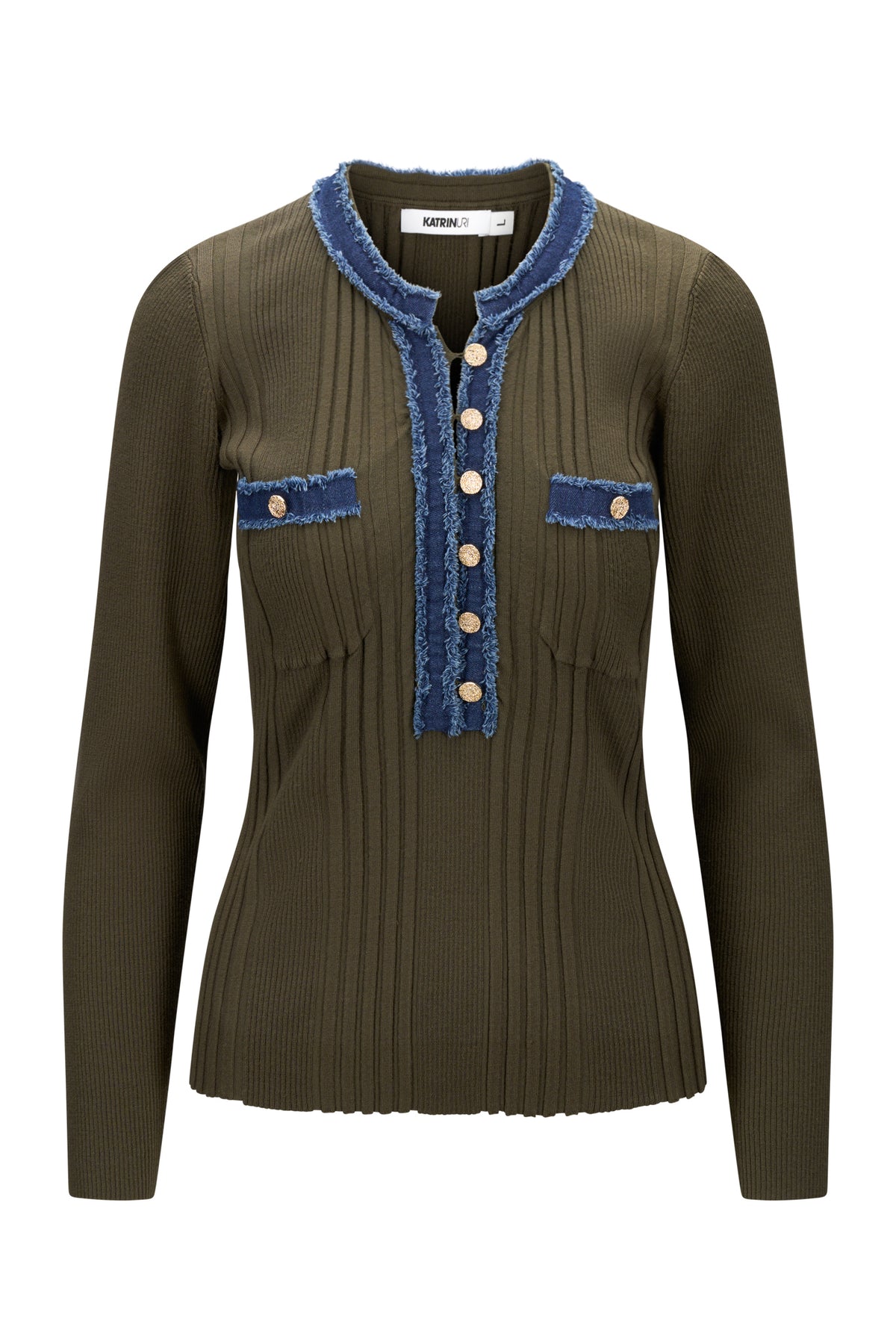 LA har rund hals, v-utrigning med knepping i front. To lommer på brystet, og er strikket i smal rillestrikk. Fin detalj at den er kantet med denimstoff. Er vanlig i størrelse, smal fasong.