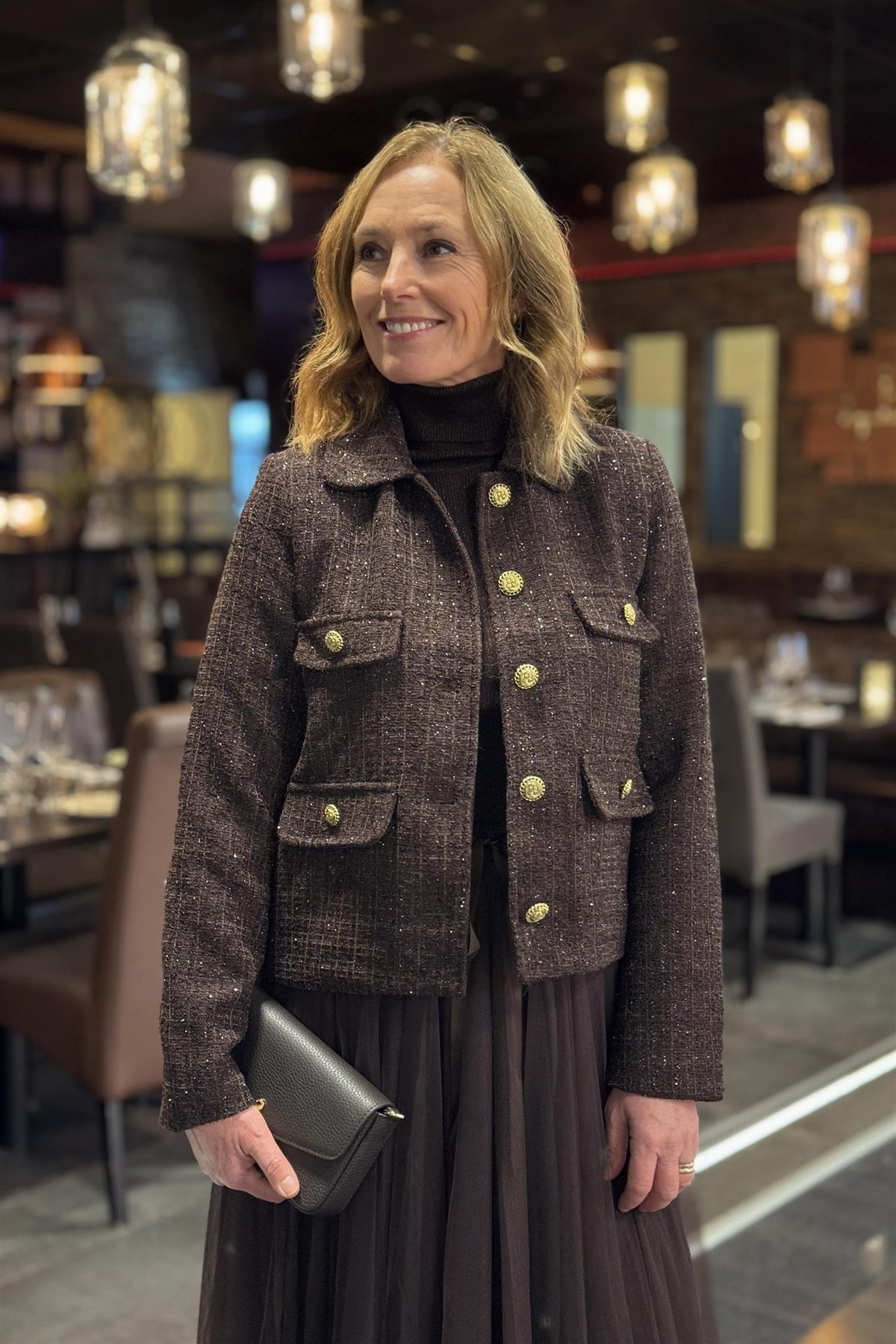 Tweedblazere går fint inn i trendbildet også denne sesongen. Her i høstens fine brune. Jakken har krage, og klaffelommer i front. er pyntet med dekorative knapper i gullfarge. Snittet er rett, og lengden er til rett under hoften. Blazeren er derfor perfekt styling også til bukser, men passer godt til skjørtene vi har i butikken nå - her stylet ton i ton med tyllskjørt.