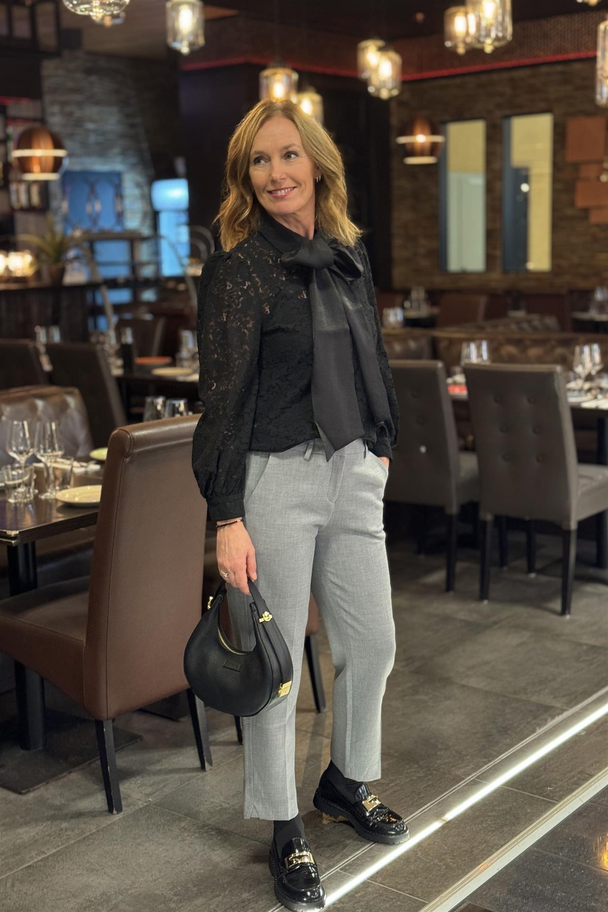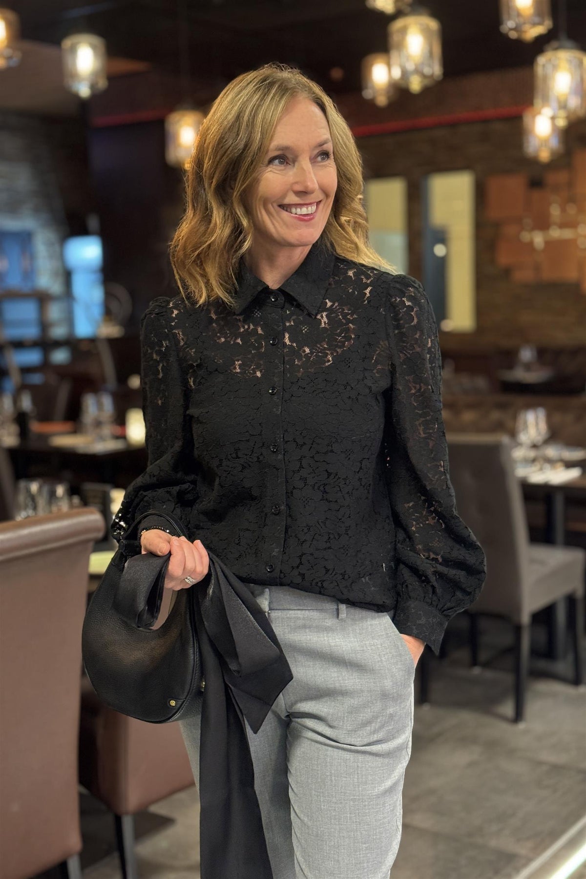 Vakke bluse, From PAris with Love. Blondene er gjennombrutte, i blomstermønster. Blusen har krage, og et bredt sløyfebånd følger med, slik at du kan knyte en pen sløyfe i halsen, slik trenden sier nå. Ermene er sydd med litt puff på skulder.