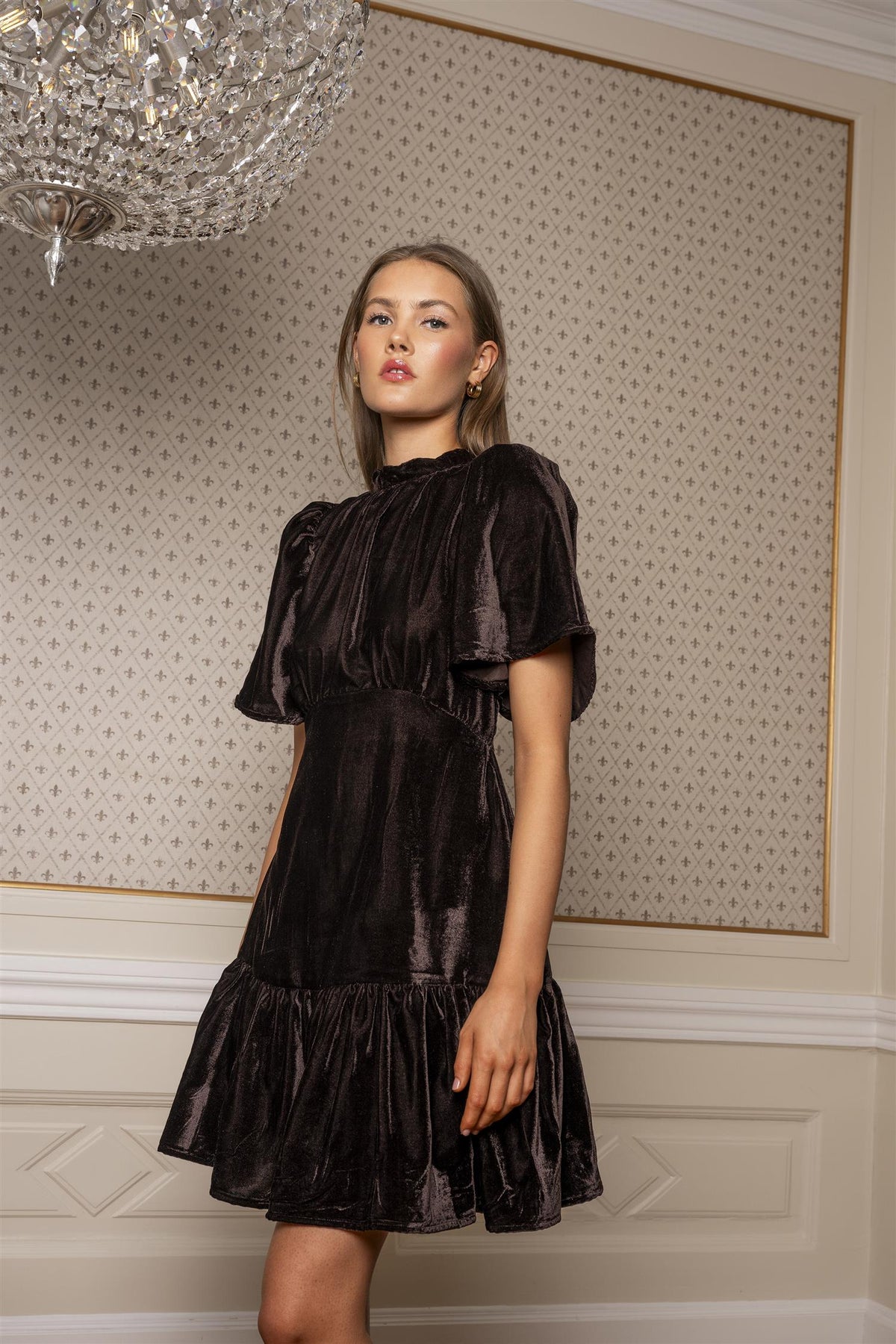 Jolie fra Missmaya kommer i nydelig brunfarge, og i en myk fløyelskvalitet. Den har kort lengde, korte løse ermer og en passform som smyger seg elegant rundt kroppen. Kjolen lukkes med glidelås i ryggen og har også knyting øverst. En komfortabel og normal passform – velg din vanlige størrelse.