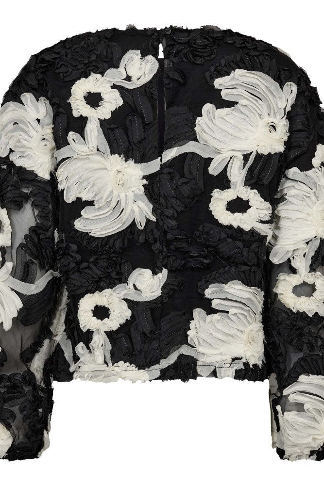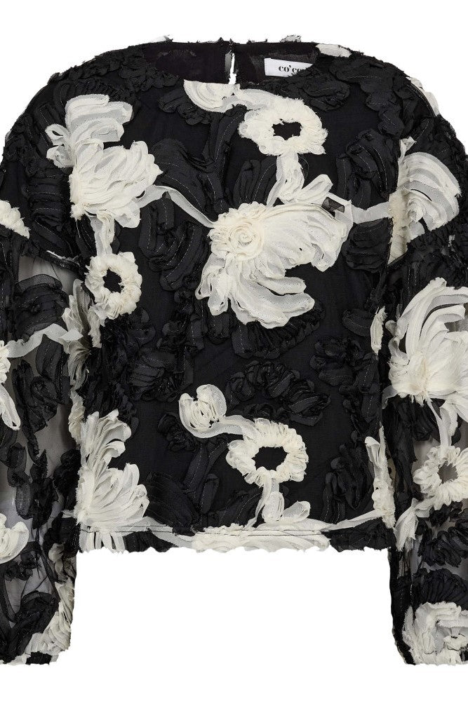 Artig pyntebluse fra Co`Couture med rosetter i sort og offwhite på sort bunn. Fleur Fluffy blouse er foret på midtstykket og lukkes med knapp i nakken. Volum i arm som smalnes ned mot håndleddet og har strikk i mansjett. Rett modell.