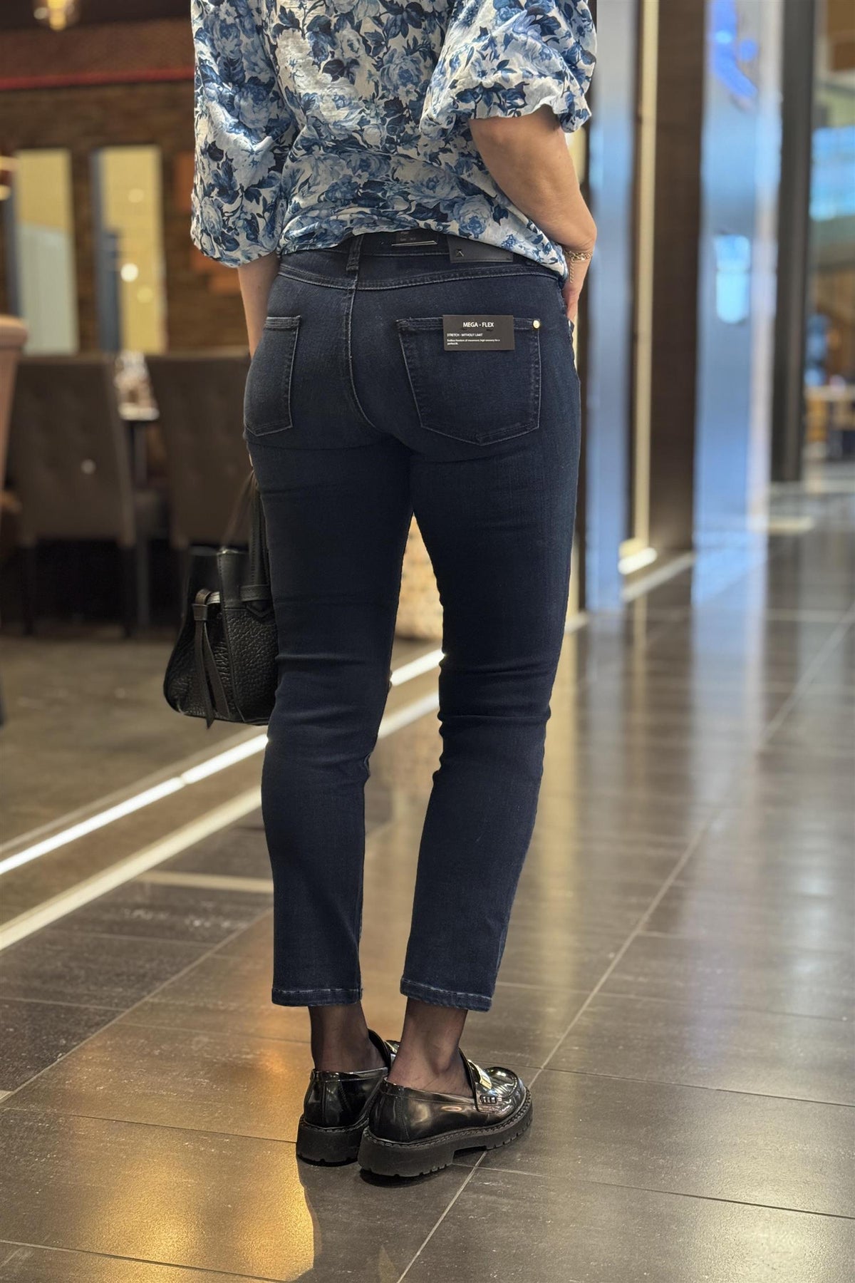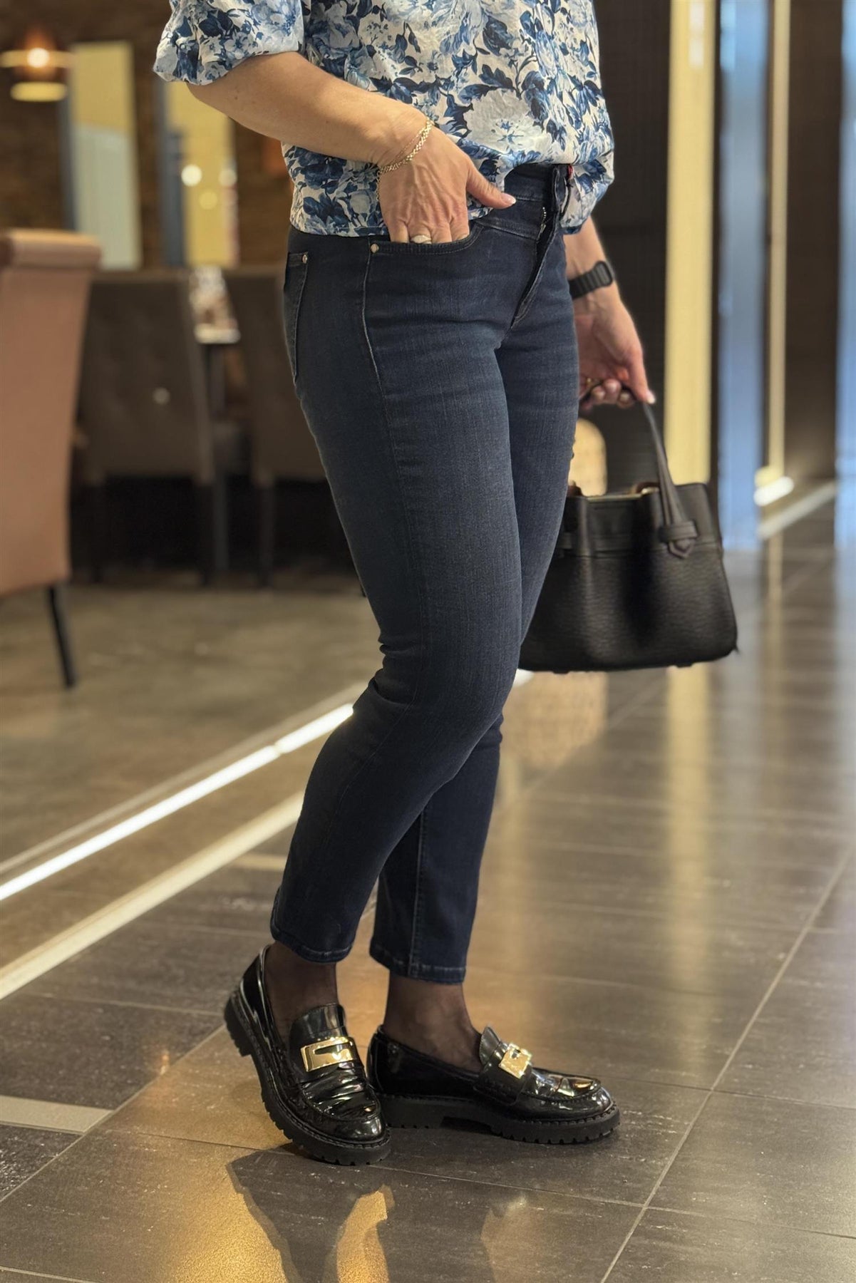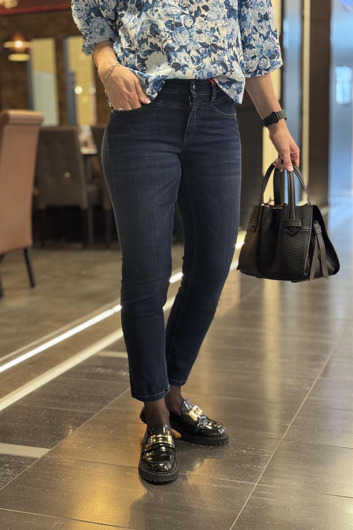 Posh fra Cambio, i en fin, mørk vask. Mykt stoff i superstretch som gjør den til en hverdagsfavoritt. Posh har fin høyde i livet, sitter godt og har litt plass i lår og over kne. Er vanlig i størrelsen. Posh har 29" benlengde, og er perfekt om du ikke er så høy, og setter pris på en bukse du slipper å legge opp. Inneholder 40 % Viskose, 26 % Bomull, 16 % Modal, 16 % Polyester, 2 % Elastan. Finvask 30 grader.