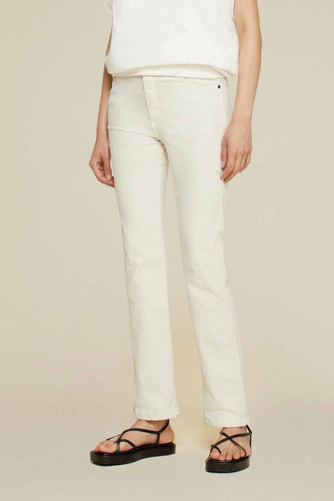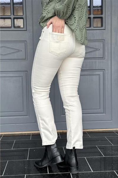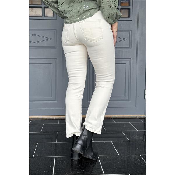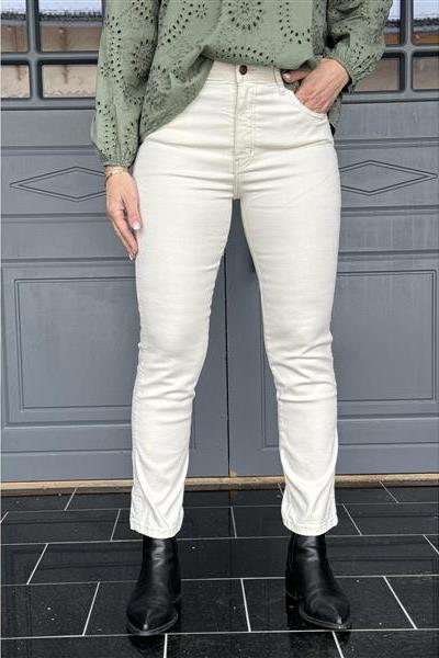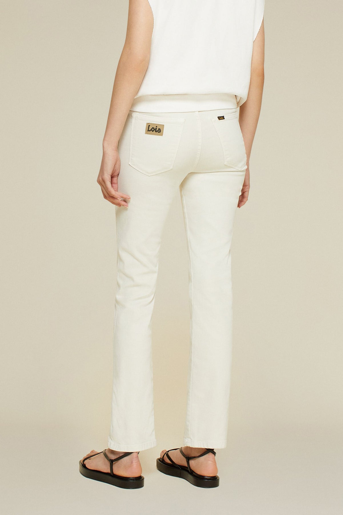 Malena fra Lois i en fin, ecru farge. (Off-white) Stoffet i denne er mykt, og behagelig å ha på. Malena er høy på livet, og har cropped benlengde. 32" ben, er ankellengde ca 30". 34" benlengde vil være en litt kort 32" Buksen har pent plasserte baklommer, og rete ben - slipper fra kne og ned. Er vanlig i str. Vår modell er 170 cm høy, str S/36 og har på seg 27"/32
