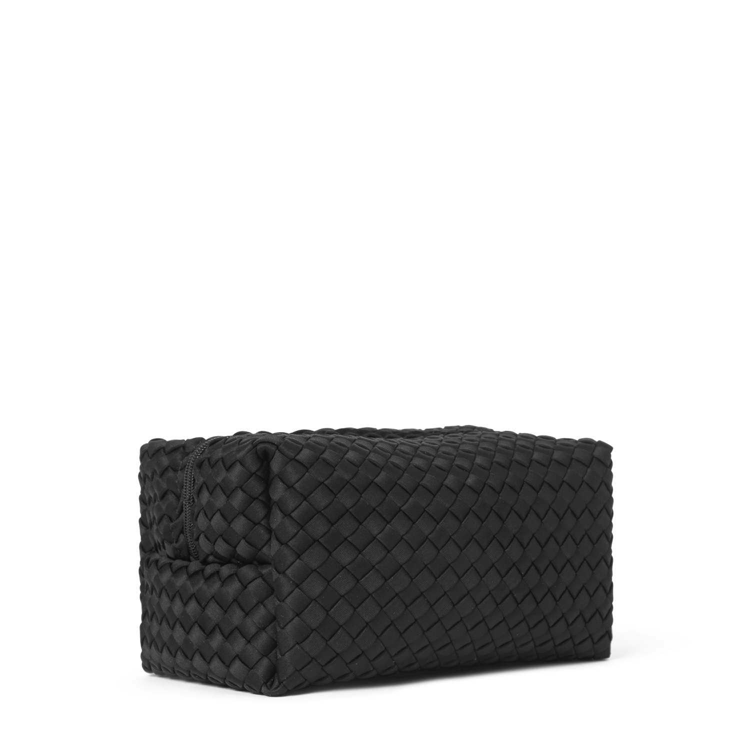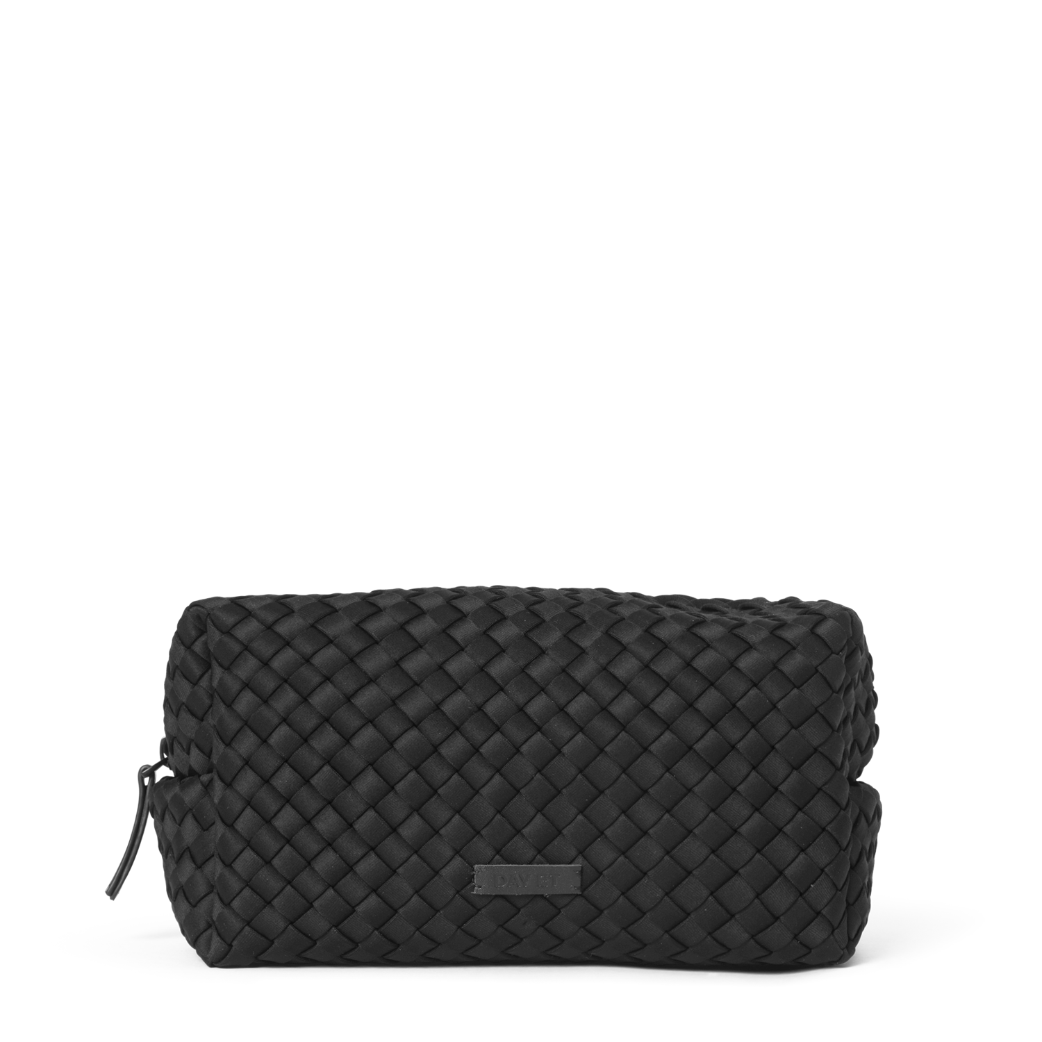 Firkantet toalettmappe i flettet neopren i sort fra DayEt. Innvendig lomme med glidelås.