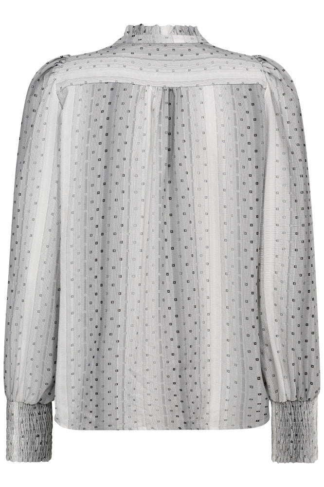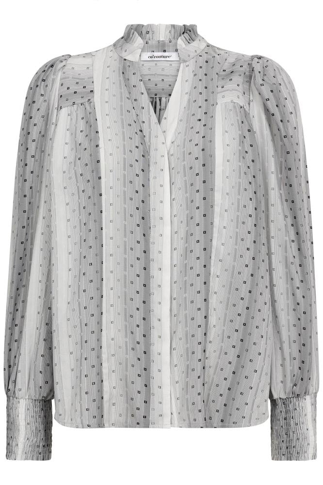 Olly fra Co`Couture har v-utringning og volangkant i hals. Liten puff i skulder. Blusen er rett i fasongen og vanlig i størrelsen.
