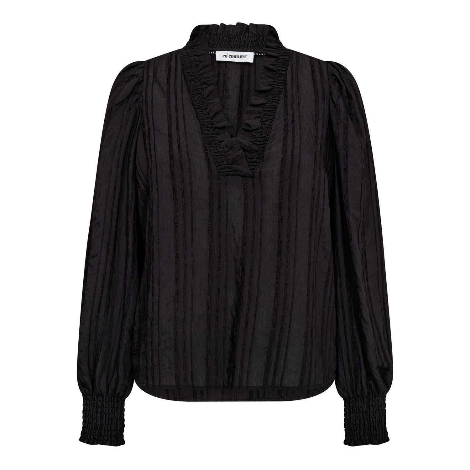 Kesi er en fin bluse fra Co`Couture. Den har v-utringning med volangkant som pynter opp. Ermene smalnes med strikkant nederst. Stoffet er rillet, som gir litt liv til materialet. Vanlig i snitt og størrelse.