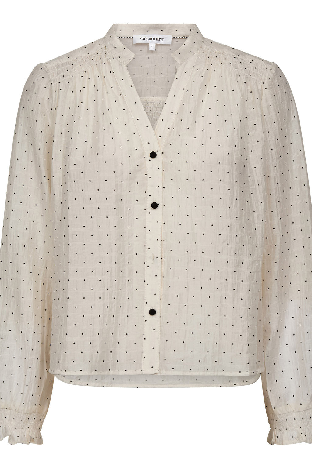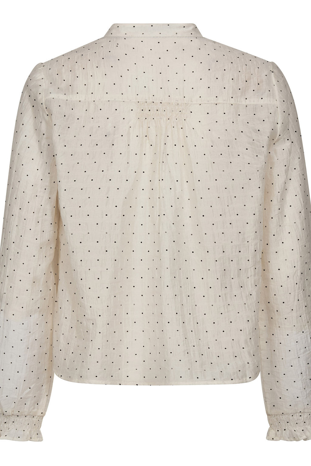 Dally shirt er delikat med sort dotprint på offwhite bunn. Blusen har v-utringning og strikkant nederst på ermene.