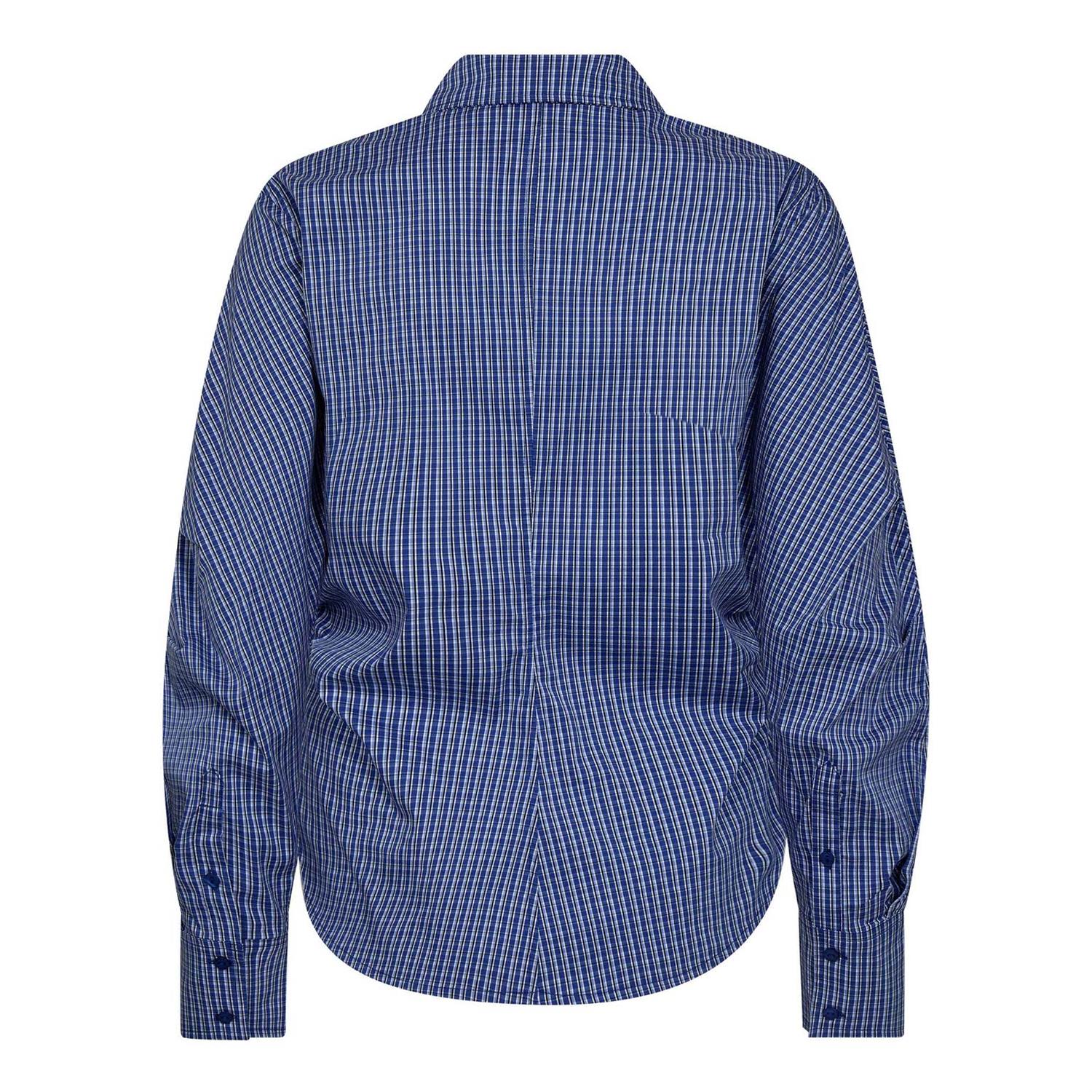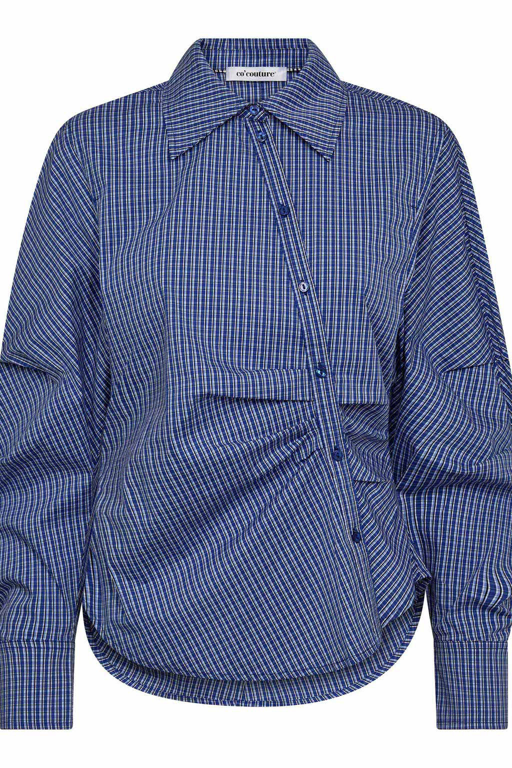 Vi ser mye av de asymetriske skjortene i trendbildet nå, og denne fra Co`Couture er helt riktig! Fresh i småruter på blå bunn. Krage i halsen, og skrå knepping som lager litt rynker i livet. Er vanlig i størrelsen.