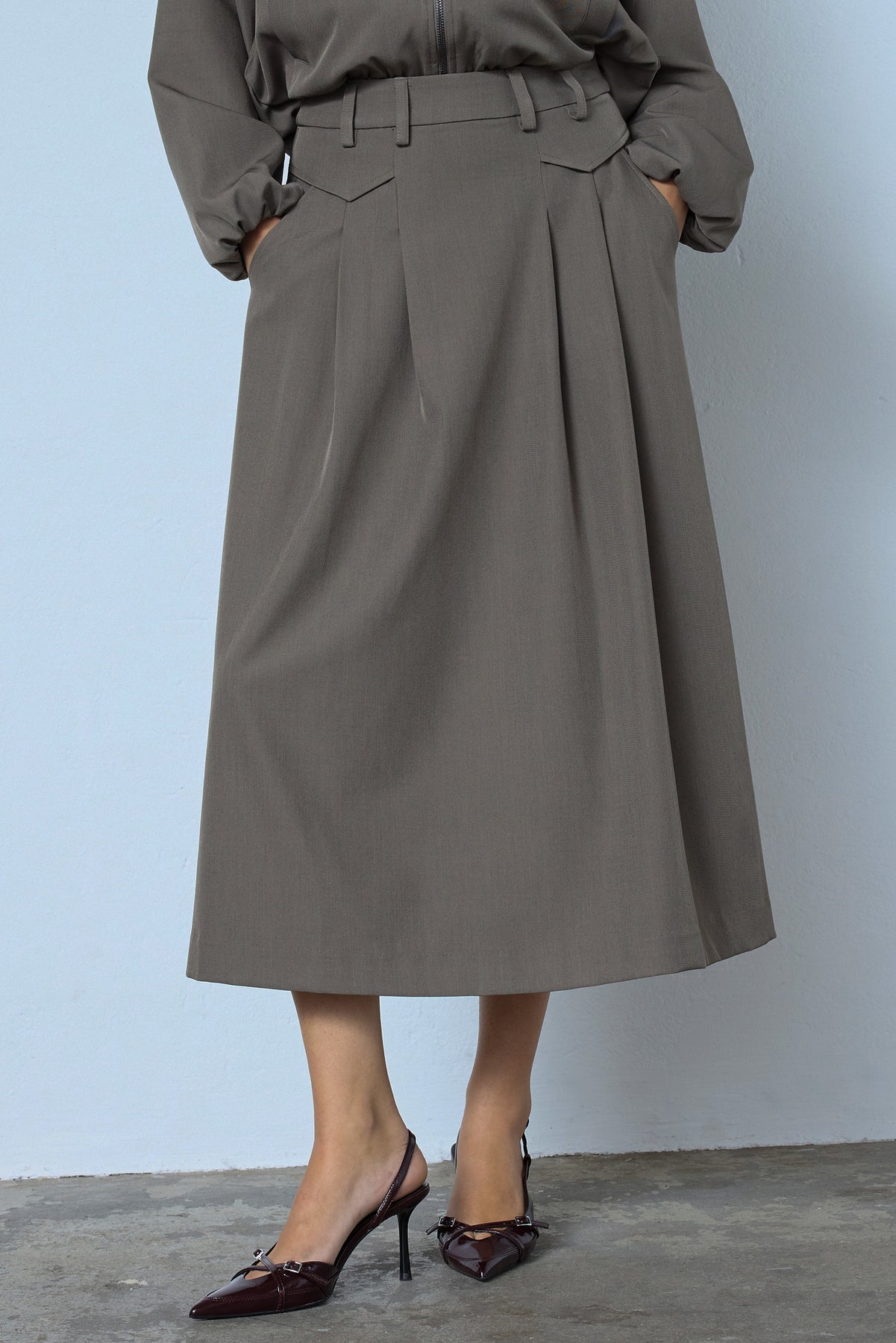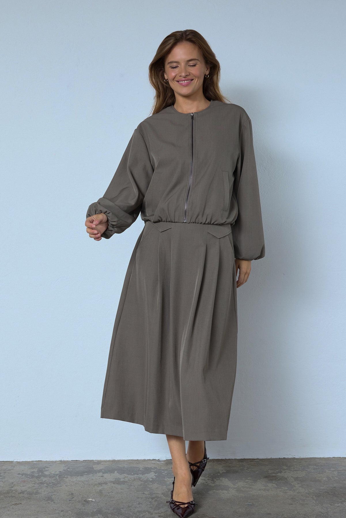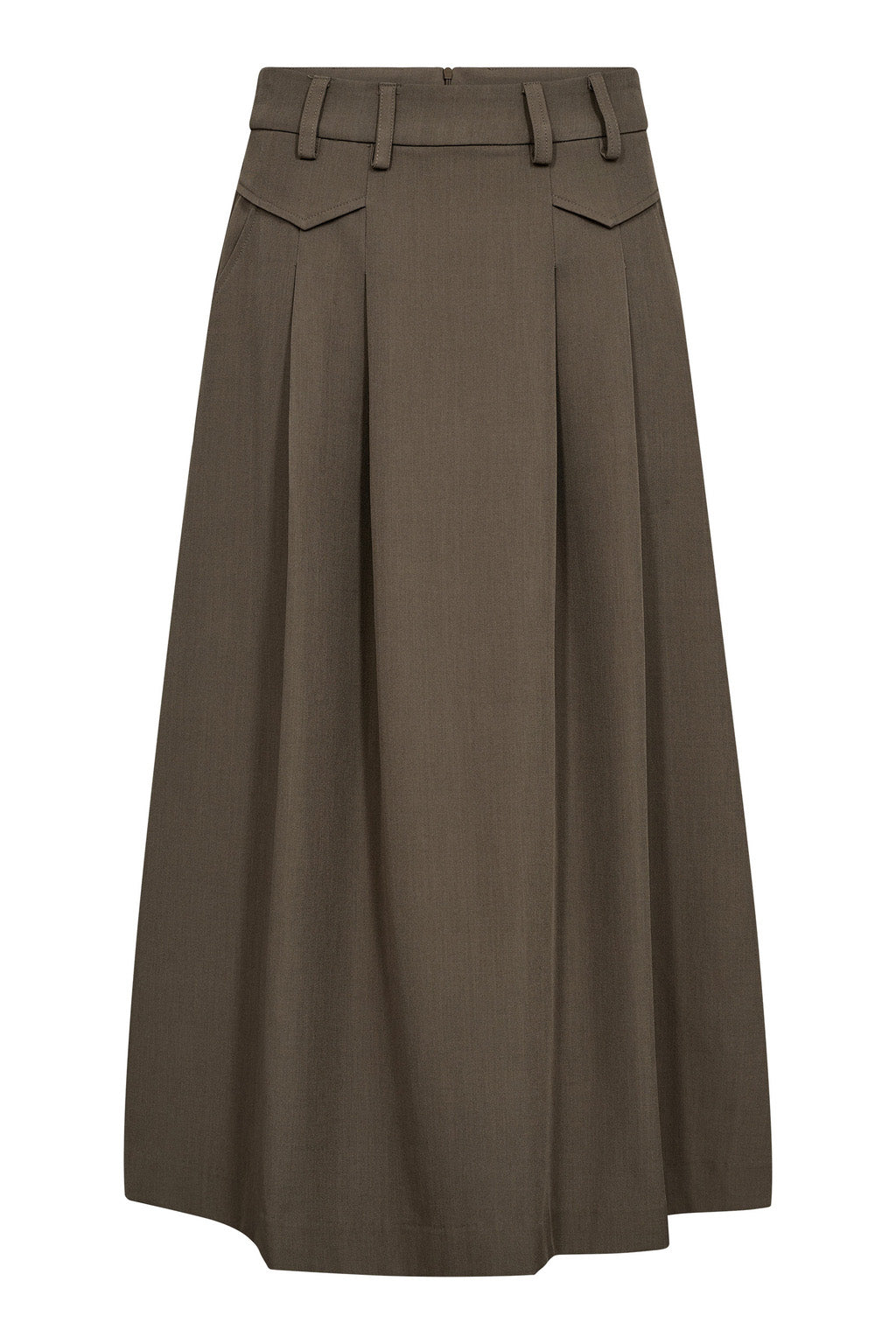 Luna pocket skirt er bygget på favoritten Anya pleat skirt fra Co`Couture.Her i en fin walnøtt farge. Luna har oppdaterte detaljer med klafflommer som pynt i front - stikklommene kommer rett under disse. Skjørtet faller fint, med legg på rett sted bygger det ikke i bredden. Har midi lengde til ned på leggen. Er vanlig i størrelsen. Walnut fargen er litt mørk på produktbildet, og er en farge som vil endre seg litt avhengig av hvilket lys man har.