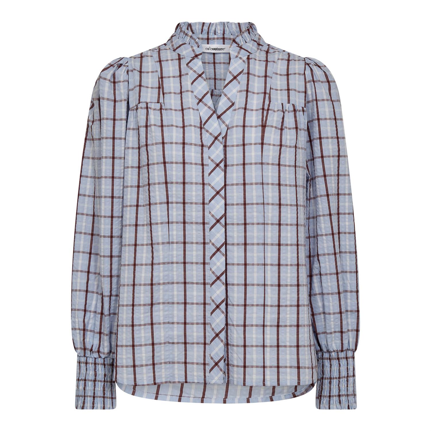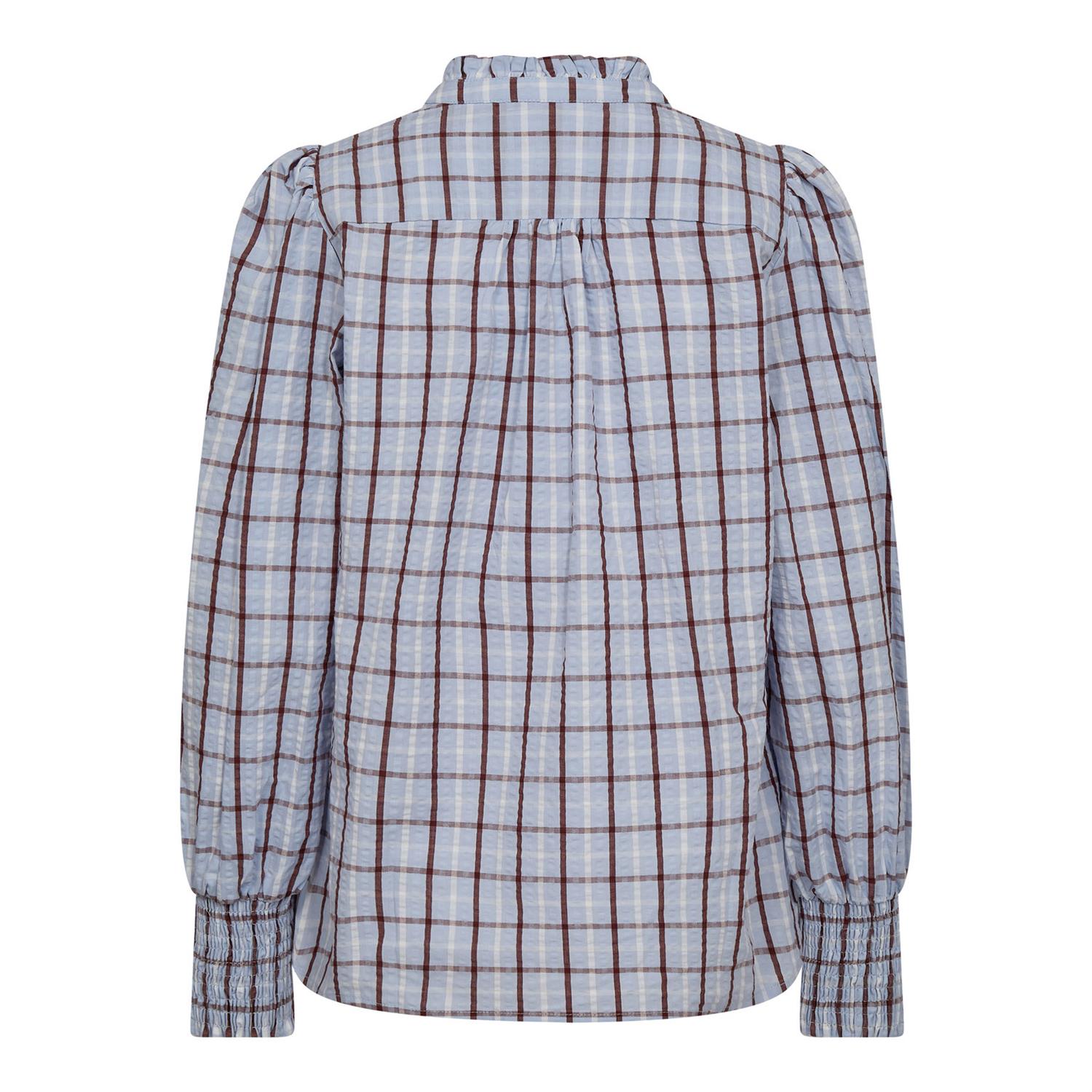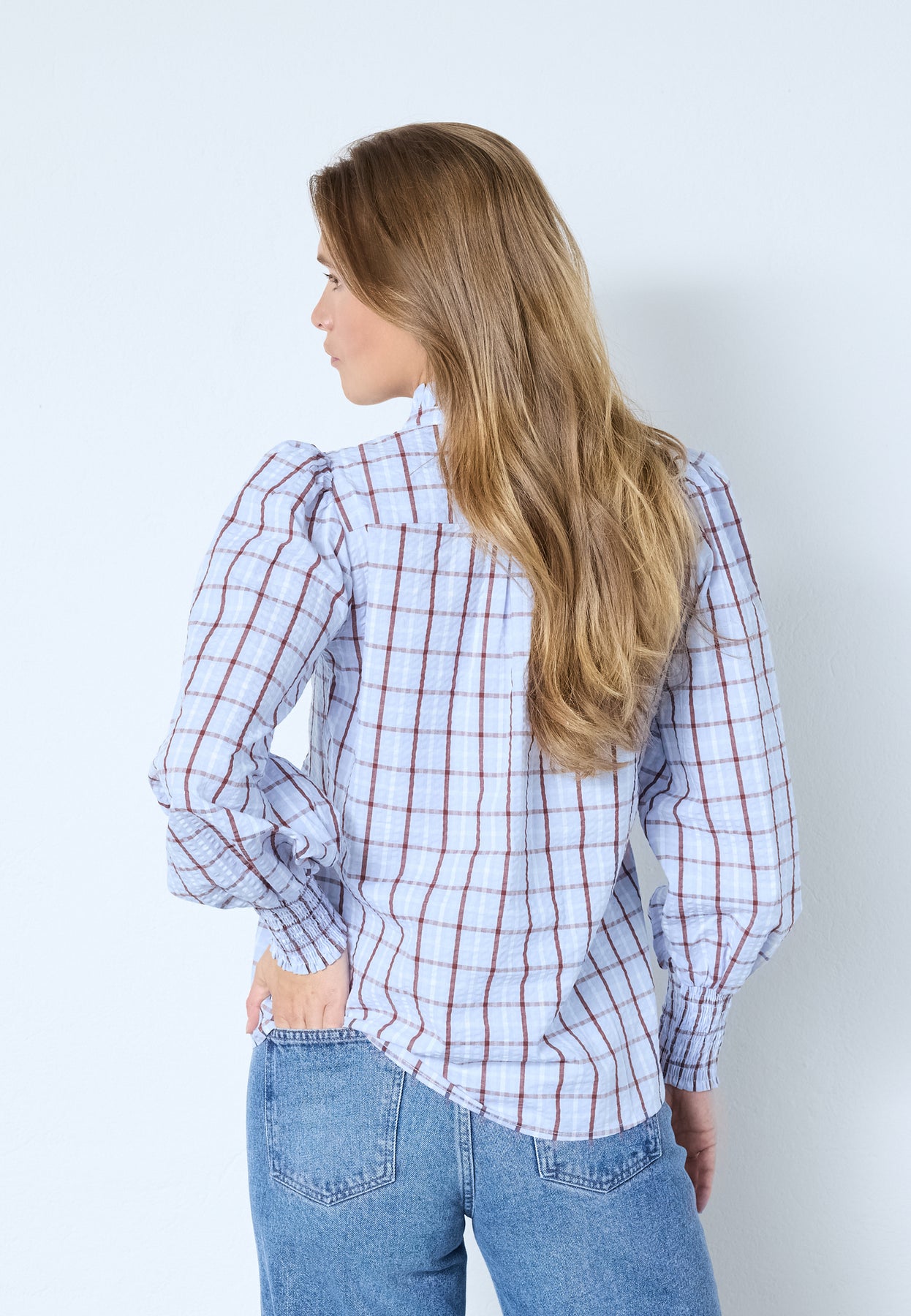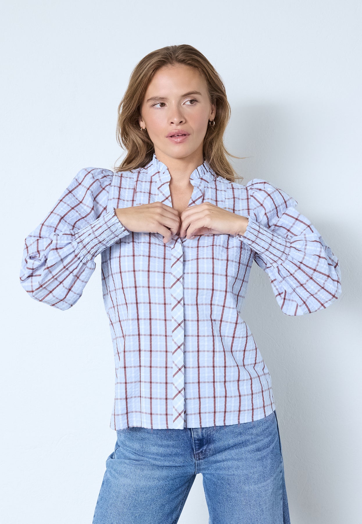 Miley v-shirt har fine volangdetalljer i utrigning. Bred strikkant nerderst på ermene. Fresh i lyseblå, med gyllent rutemønster.