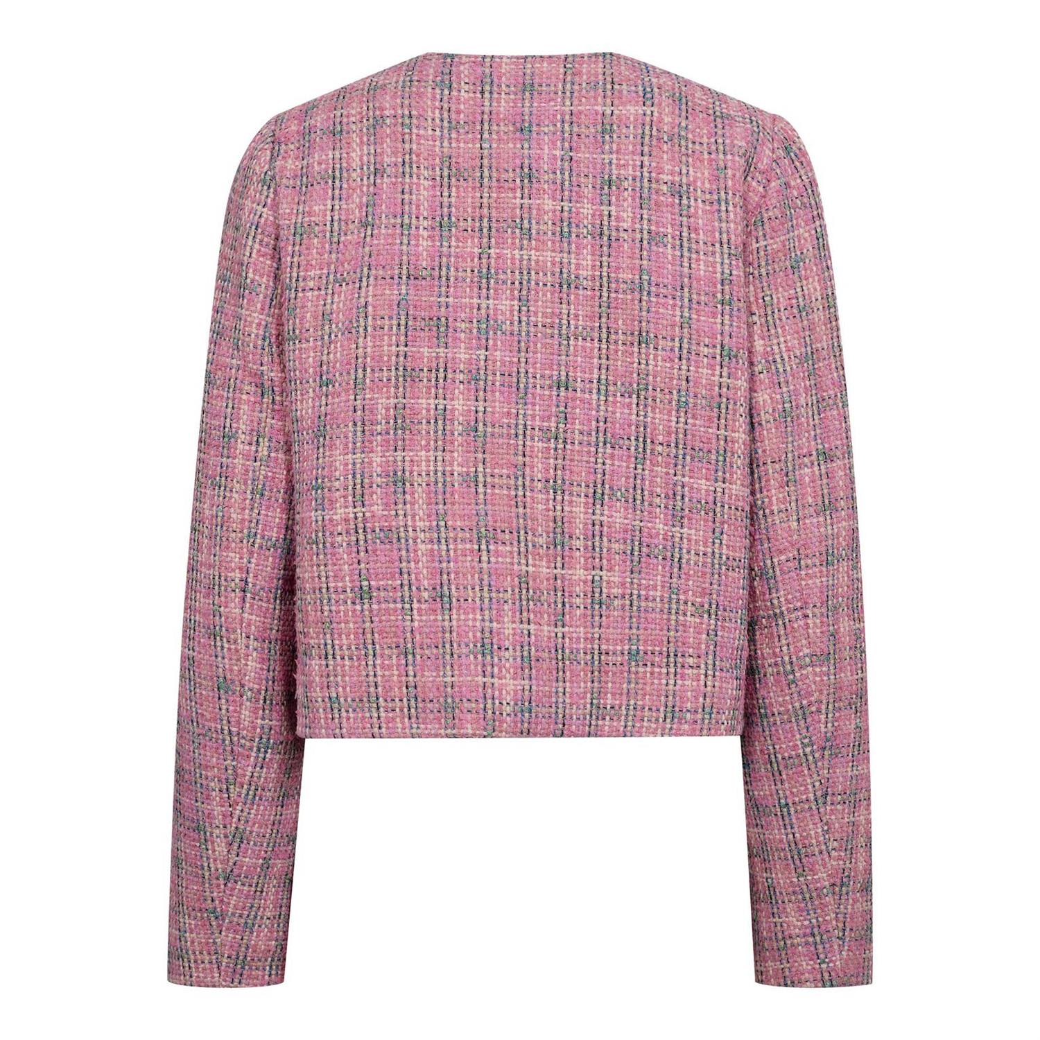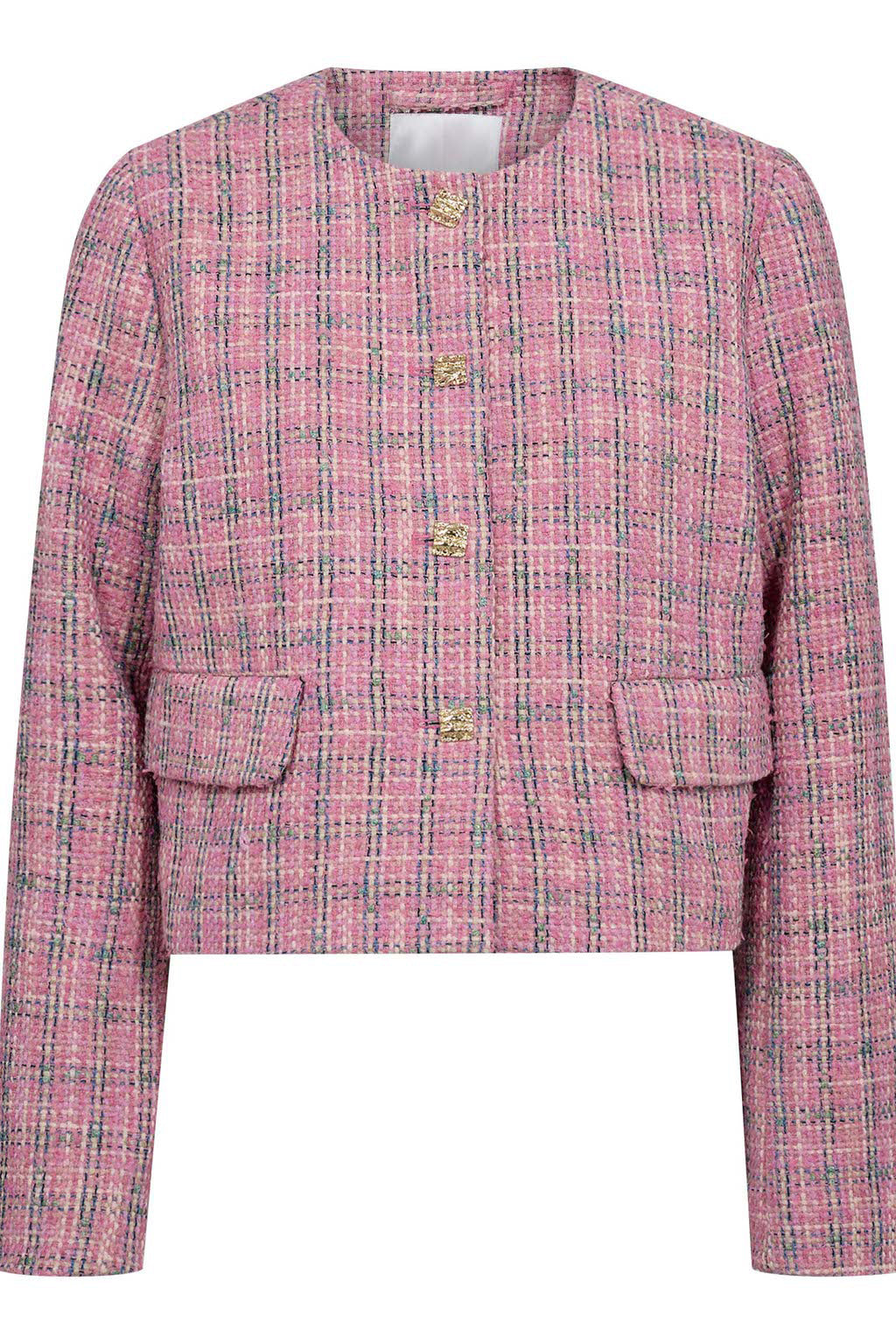 Cammie er en fresh bouclejakke fra Co`Couture. Delikat ruter på fargen candyfloss. Jakken har rund hals, klafflommer i front, og pene gullfargede knapper gjør prikken over ièn.