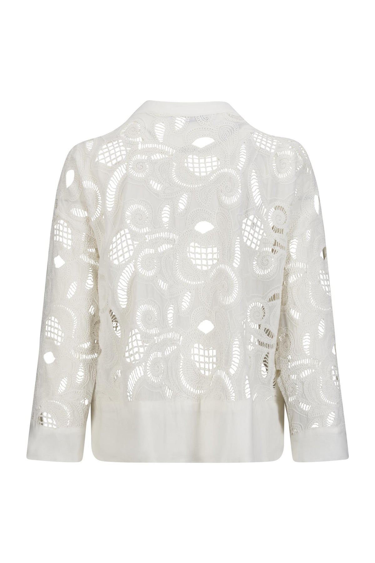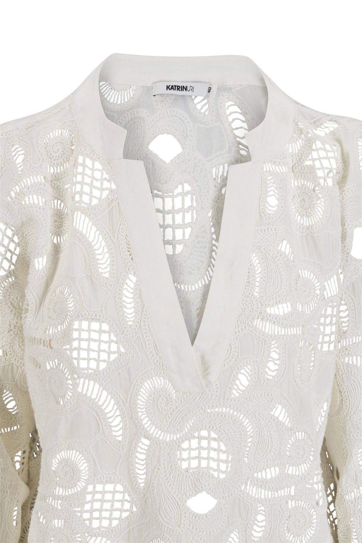 Sana blouse er vakkert håndtverk i blonde. Blusen fra Katrin Uri har dyp v-utringning, og brede ribkanter som en fin kontrast til blonden. Snittet er løst, og perfekt sammen med avslappede bukser eller over en shorts/skjørt.