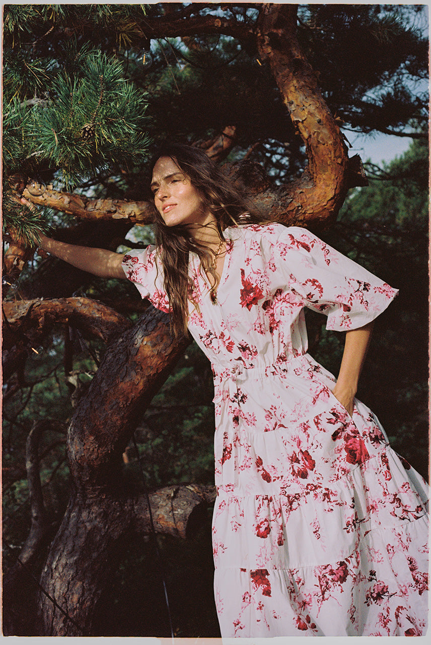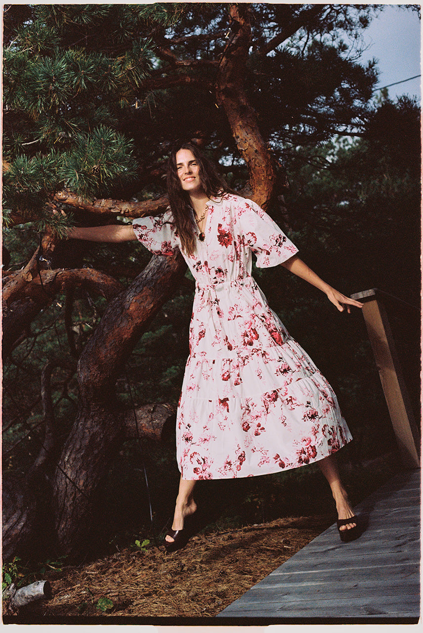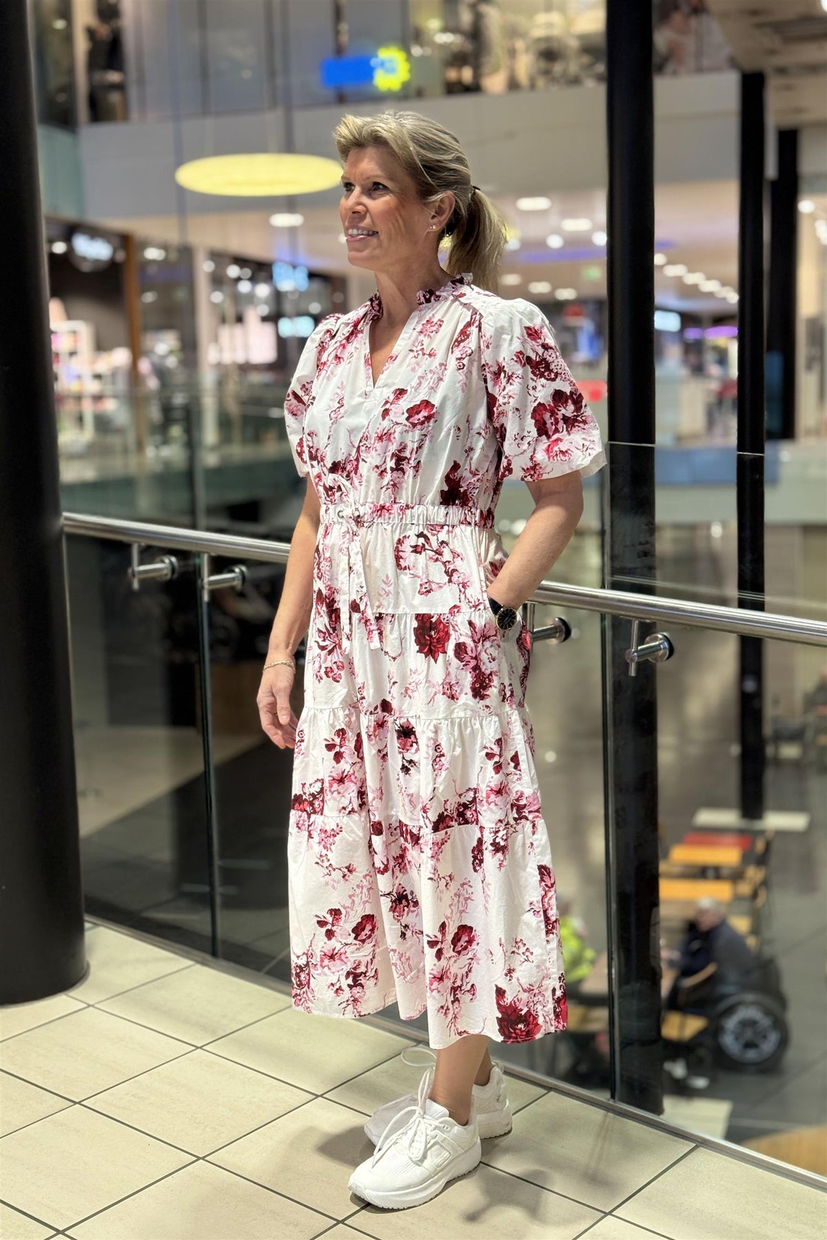 Lisboa Pia dress fra Katrin Uri har sommerlig print, i fresh rødfarge. Kjolen har smal v-utringning korte ermer med litt puff, strikkant nederst. Kjolen har raglandsfelling i ermer, og med v-utringing så får den et flatterende uttrykk i overdelen. Smalnes inn i livet med en strikkant og snørebånd. Skjørtet har kappe og lengde til midt på leggen. Dette er en kjolefasong vi kjenner fra tidligere og vet at sitter fint på mange. Er vanlig i størrelsen.